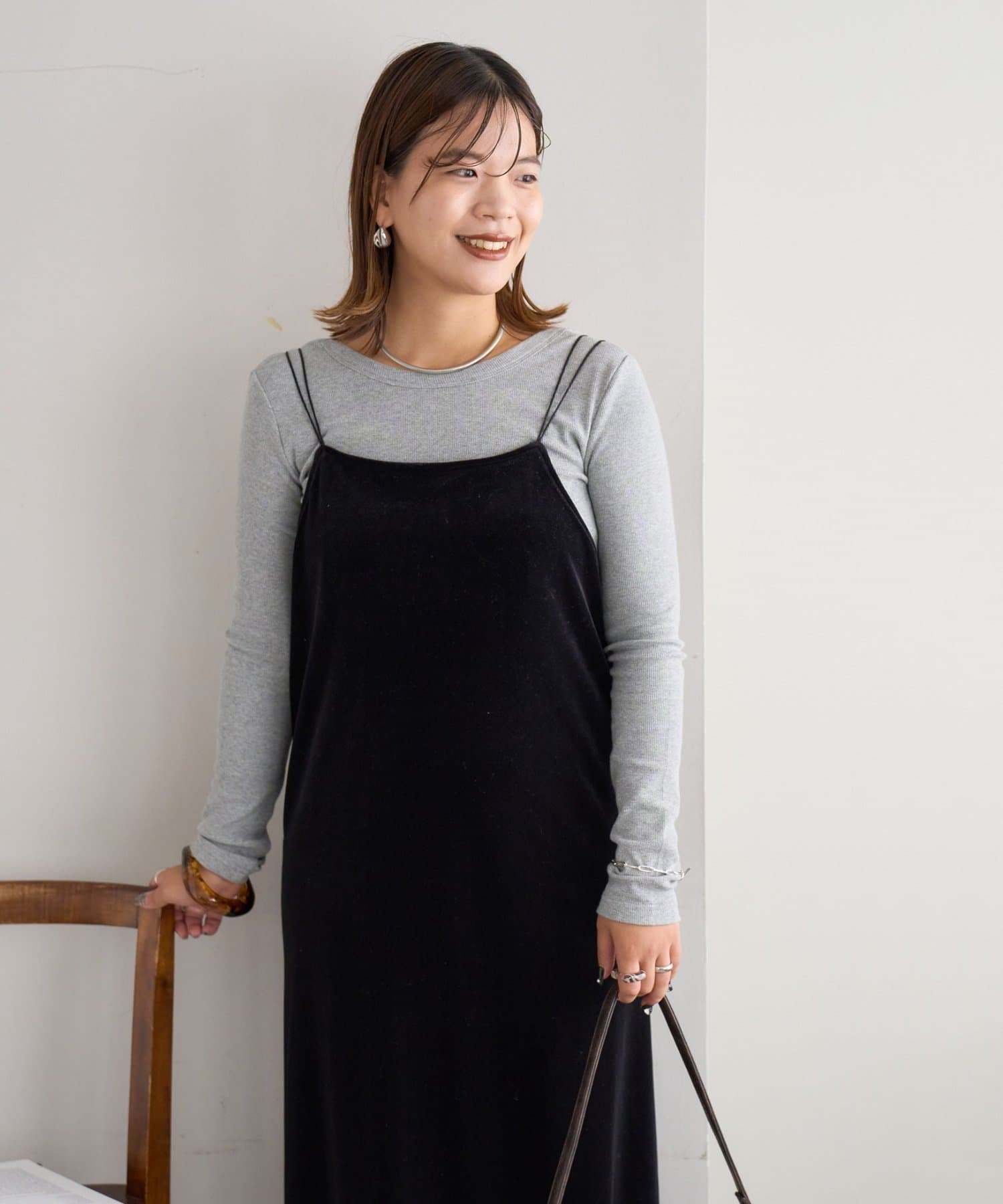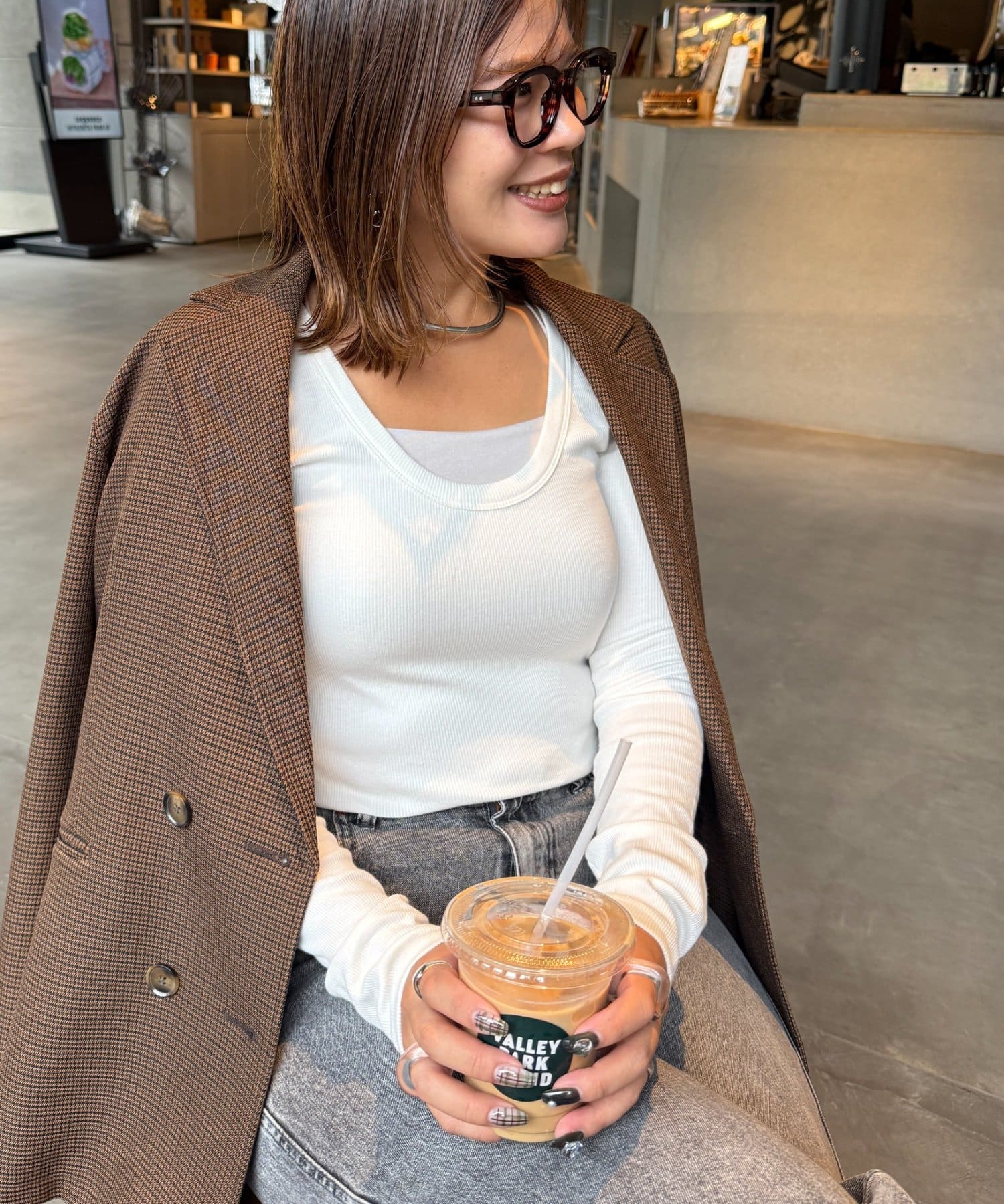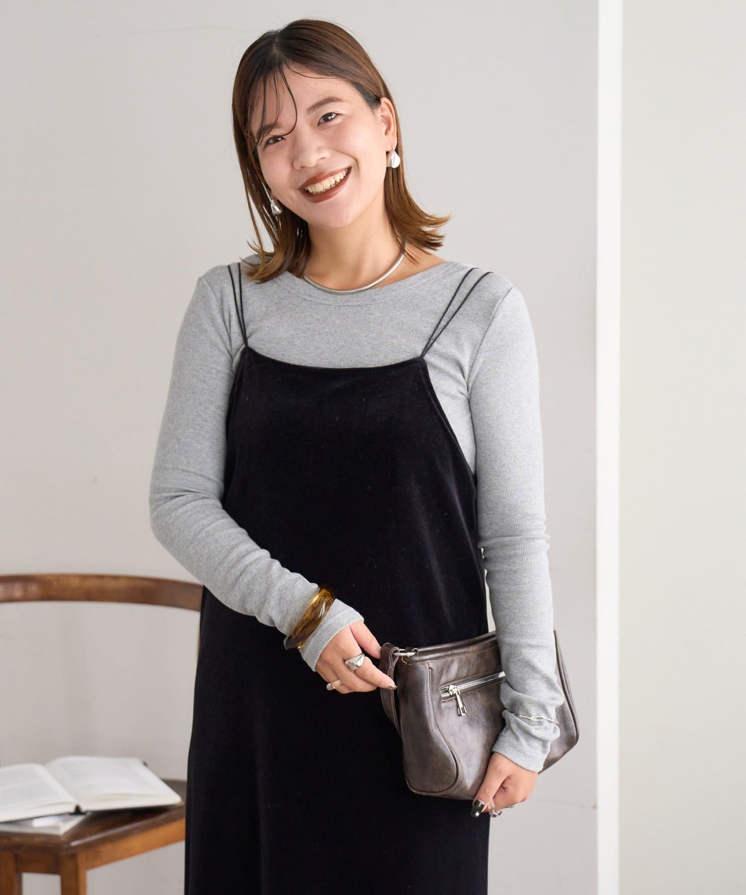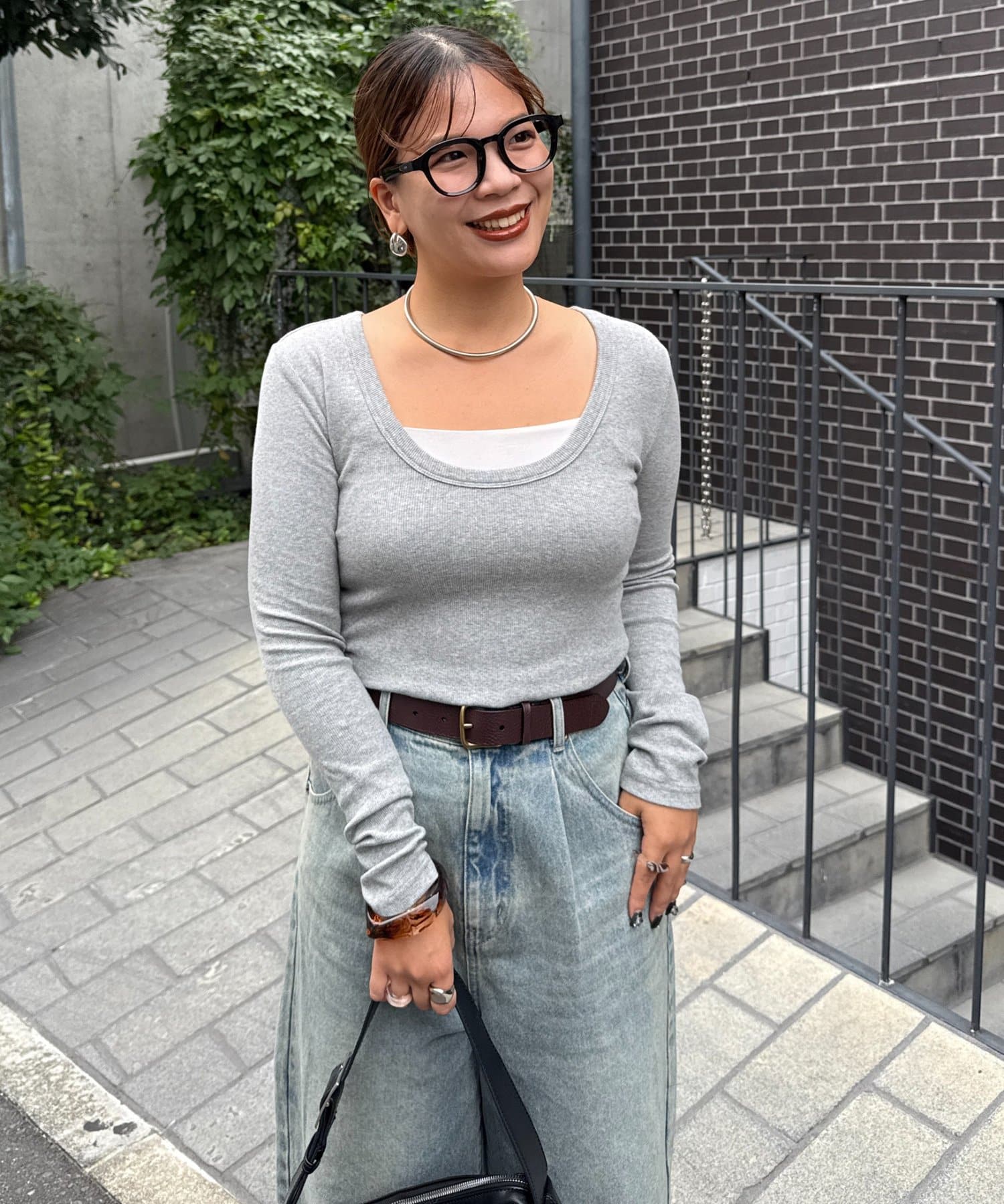 155cmスタッフ:首元が程よくあいているので、顔周りがすっきり見えて着痩せします!一枚着でも、インナーとしても使えるので着回し力抜群♪