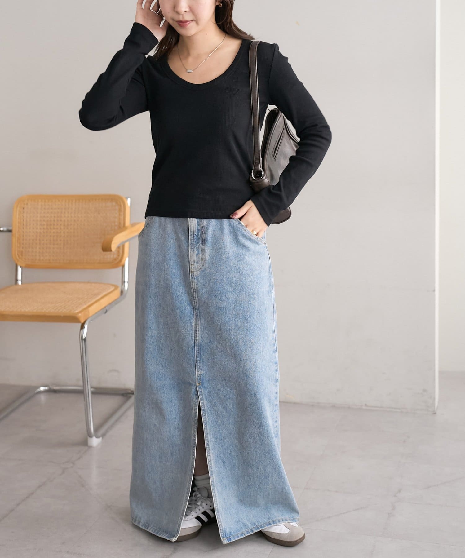 深めに開いたUネックが顔まわりをすっきりと見せ、女性らしい抜け感を演出。