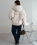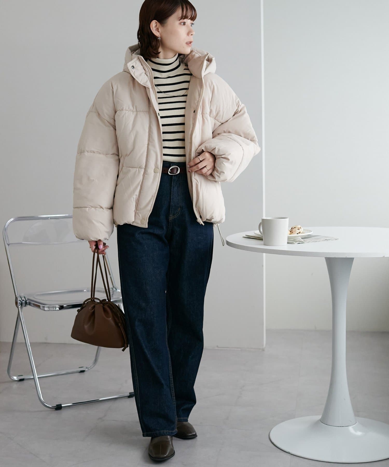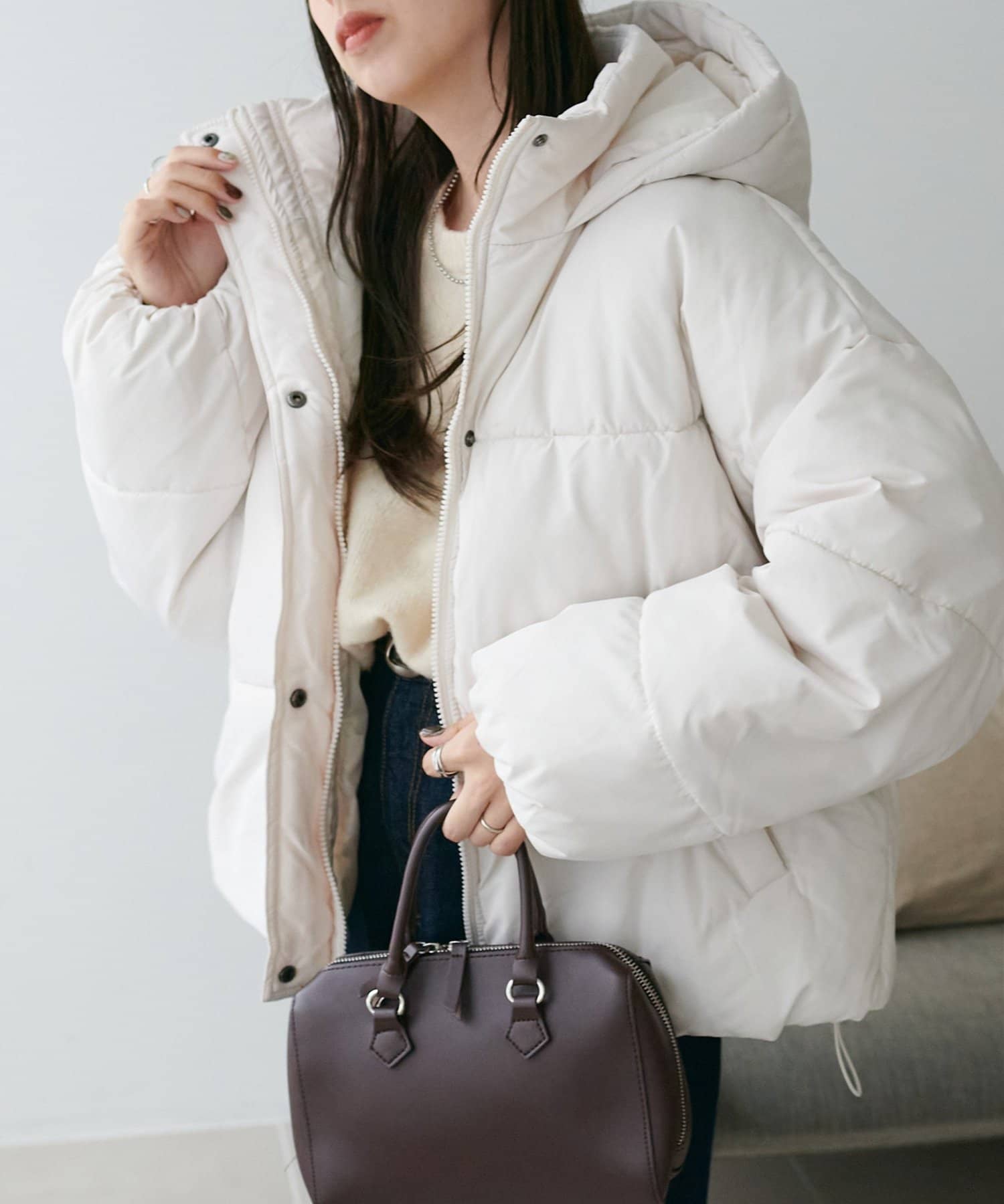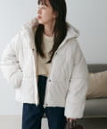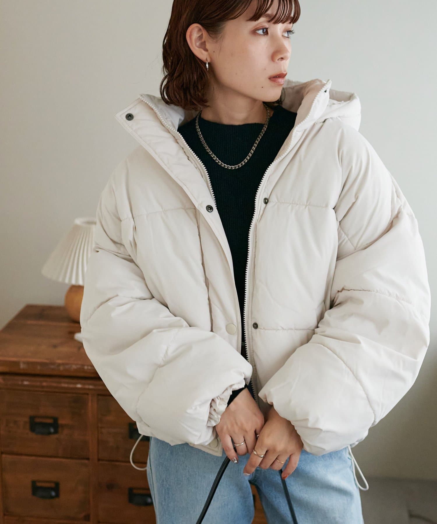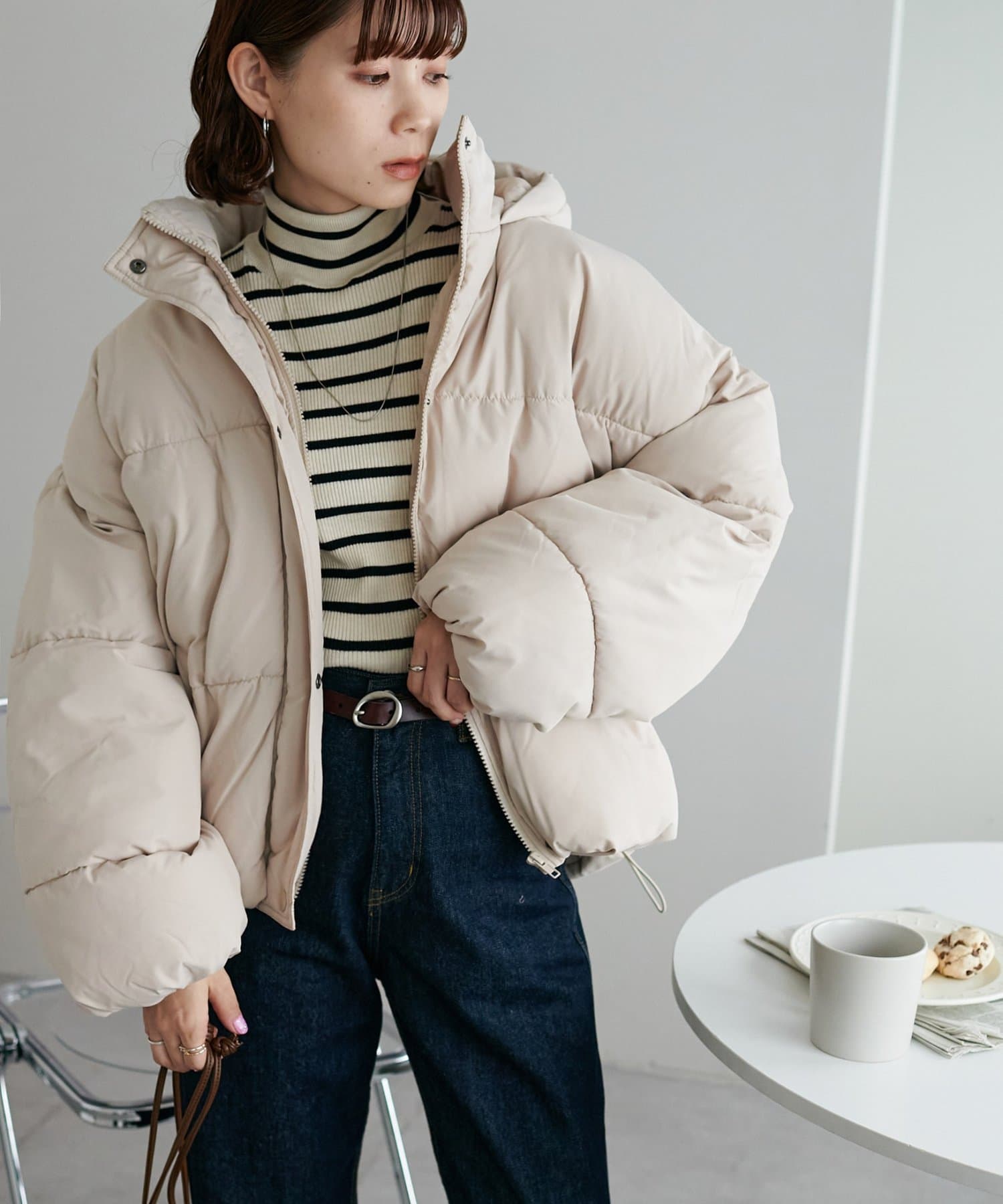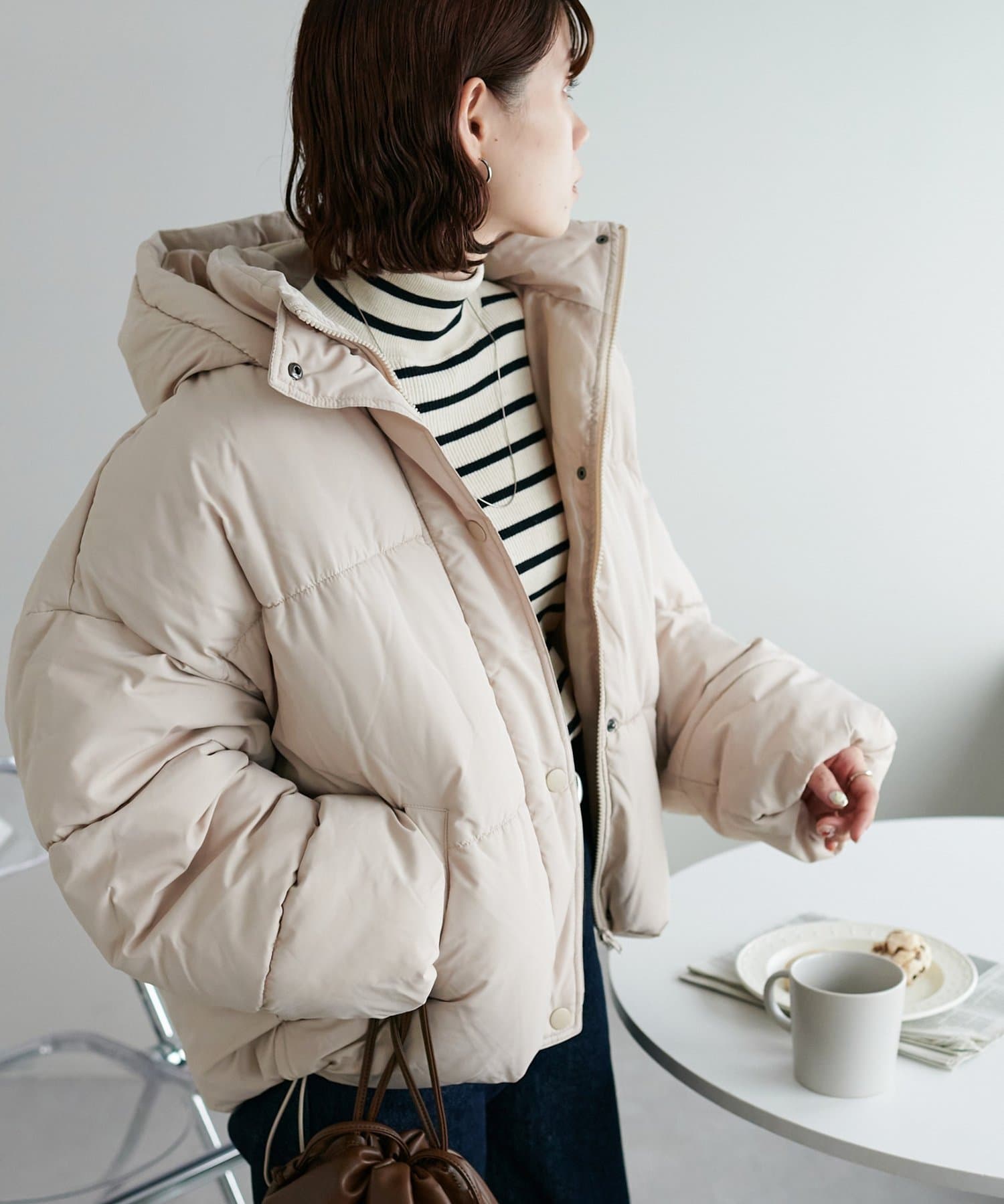 ふっくらとしたシルエットが可愛いらしいエコダウンフードブルゾン。しっかりと中綿が入っているので保温性も◎
