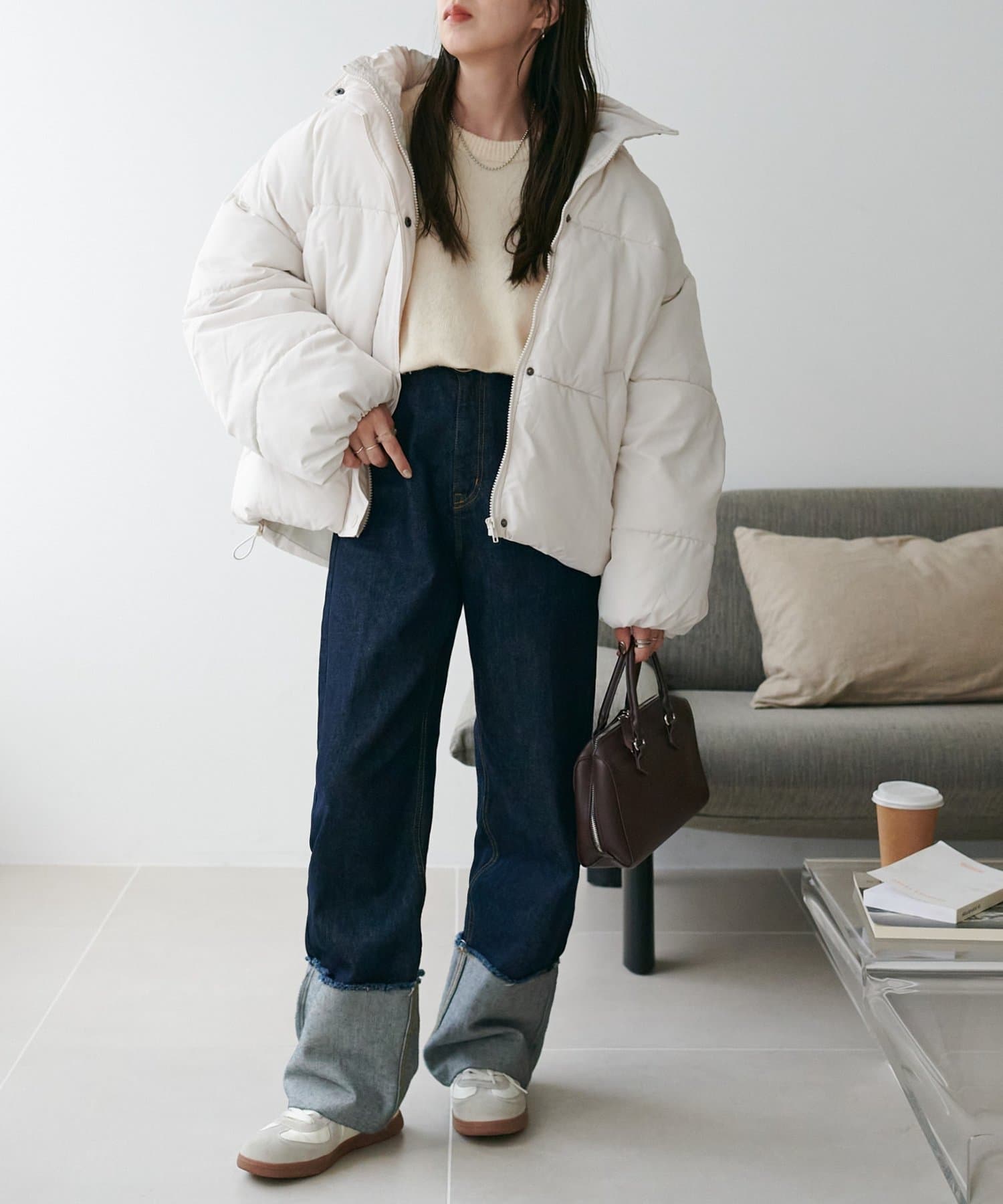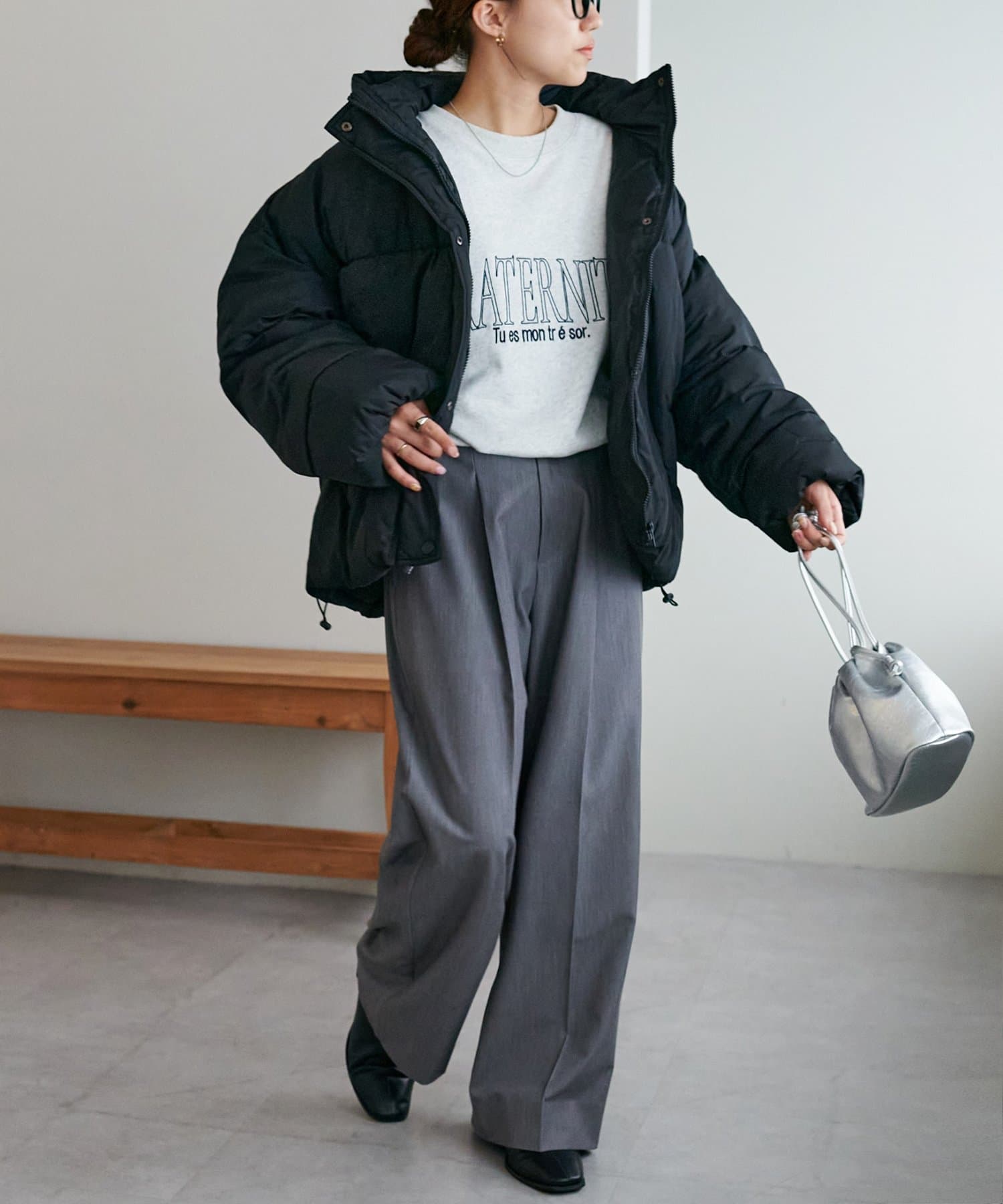 フロント部分を閉めればスタンドネックとしても着用でき、シンプルなスタイリングにもこなれ感がプラスされます。