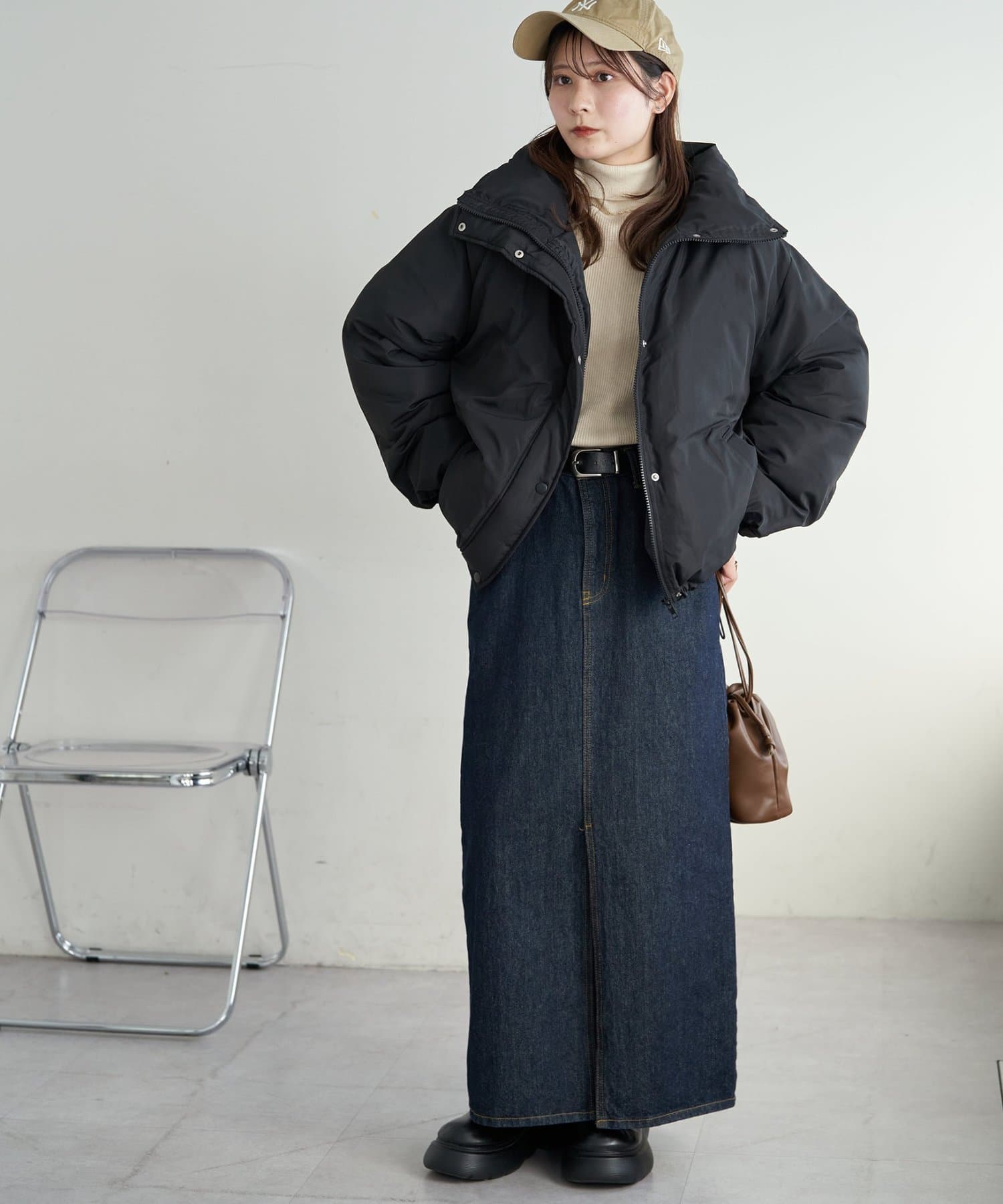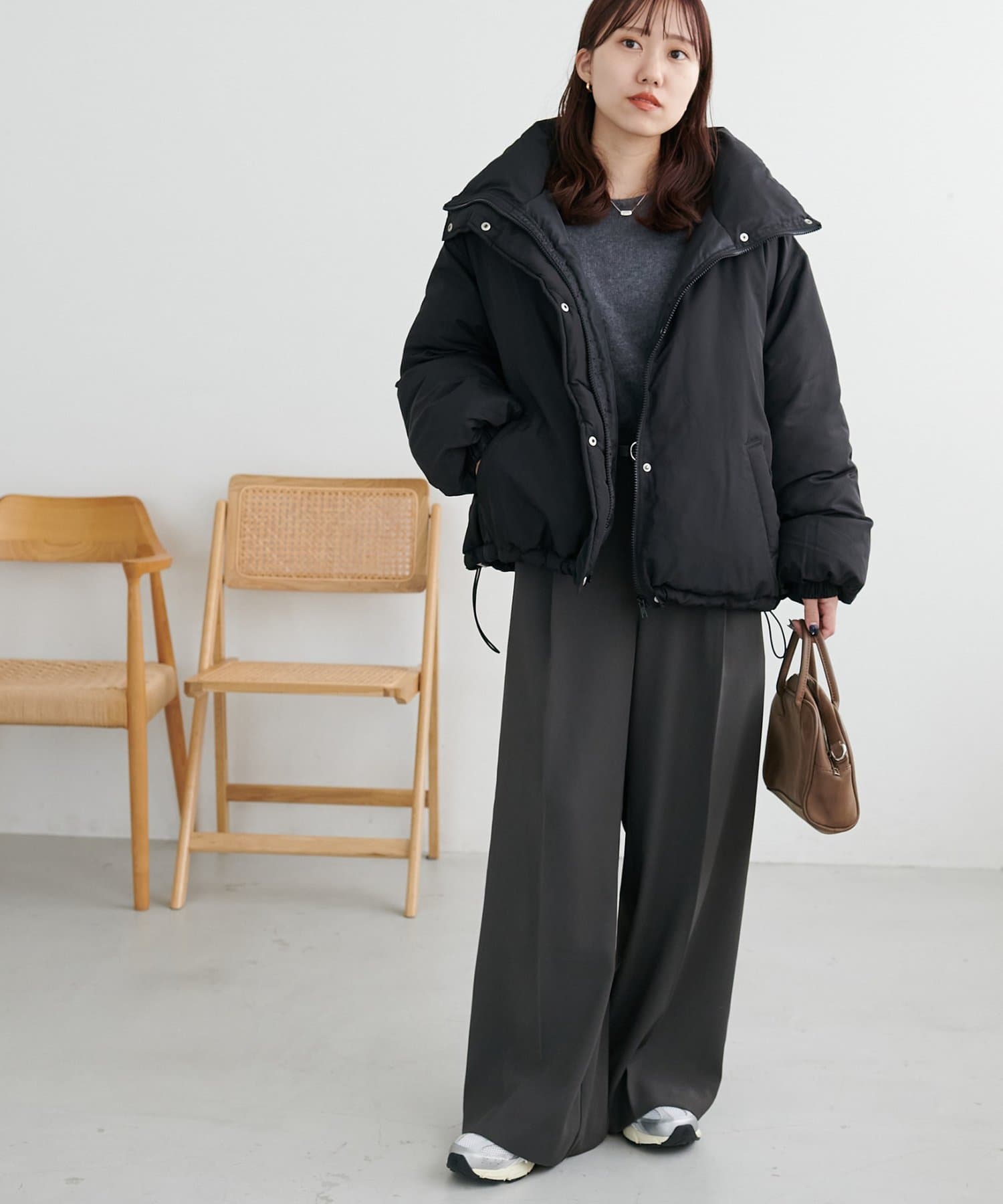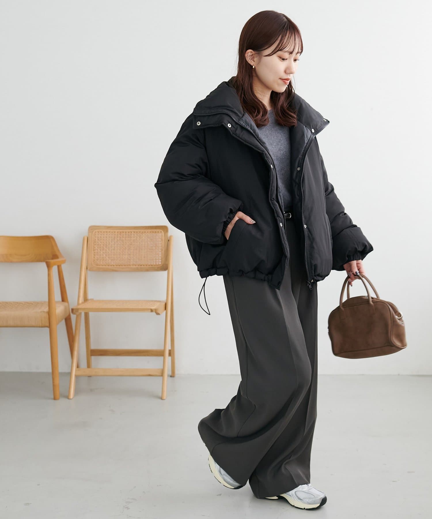 ・小ぶりバッグやすっきりボトムと合わせると、ボリューム感との対比でスタイルアップ