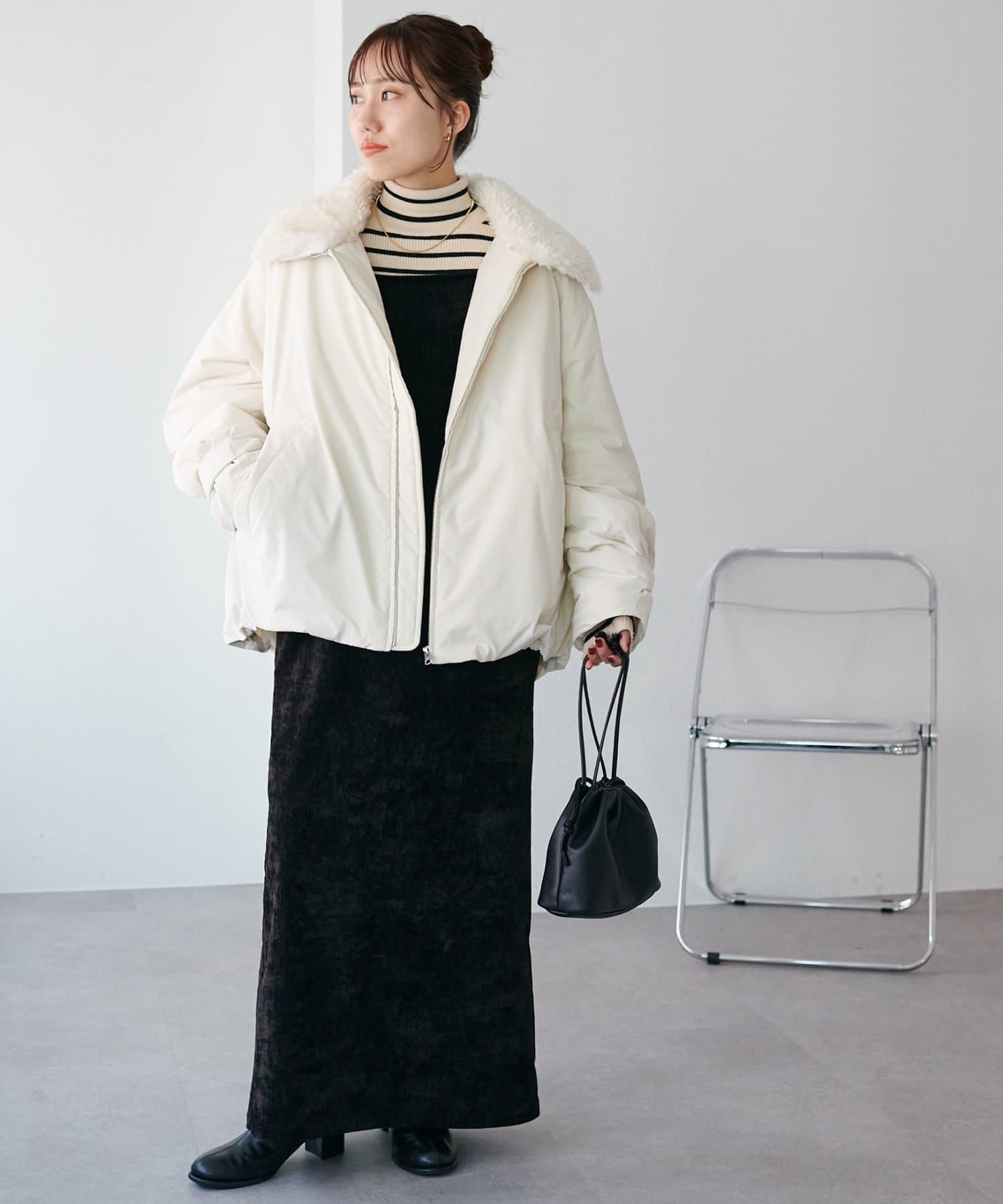 衿を付ければ華やかで冬らしい印象に、外せばシンプルでカジュアルな雰囲気にチェンジ。