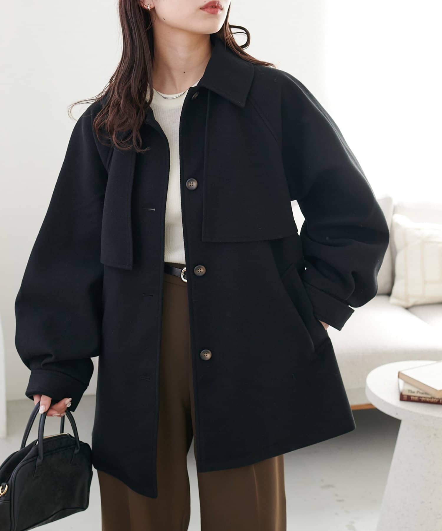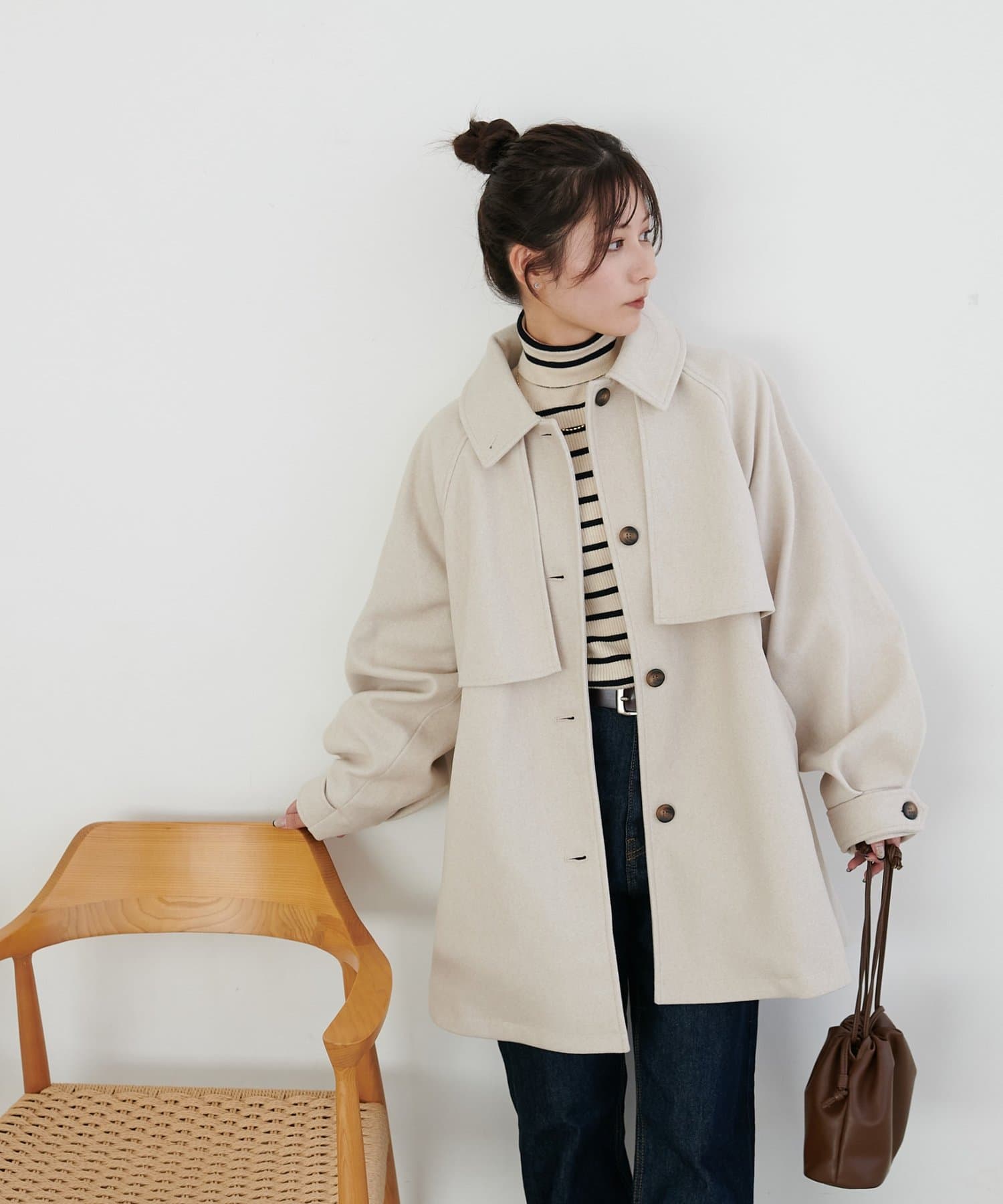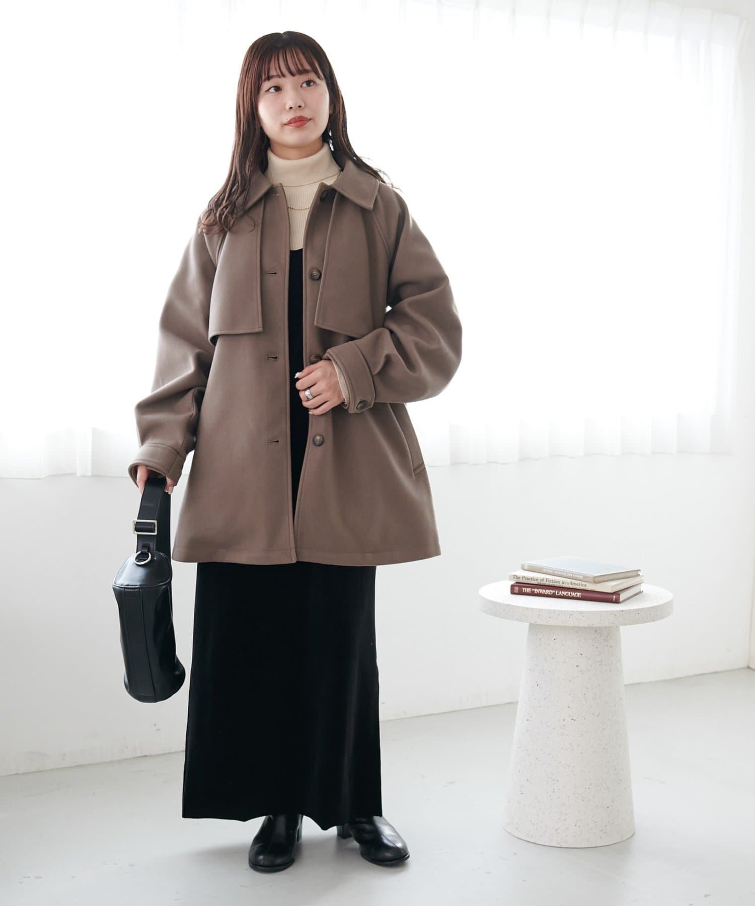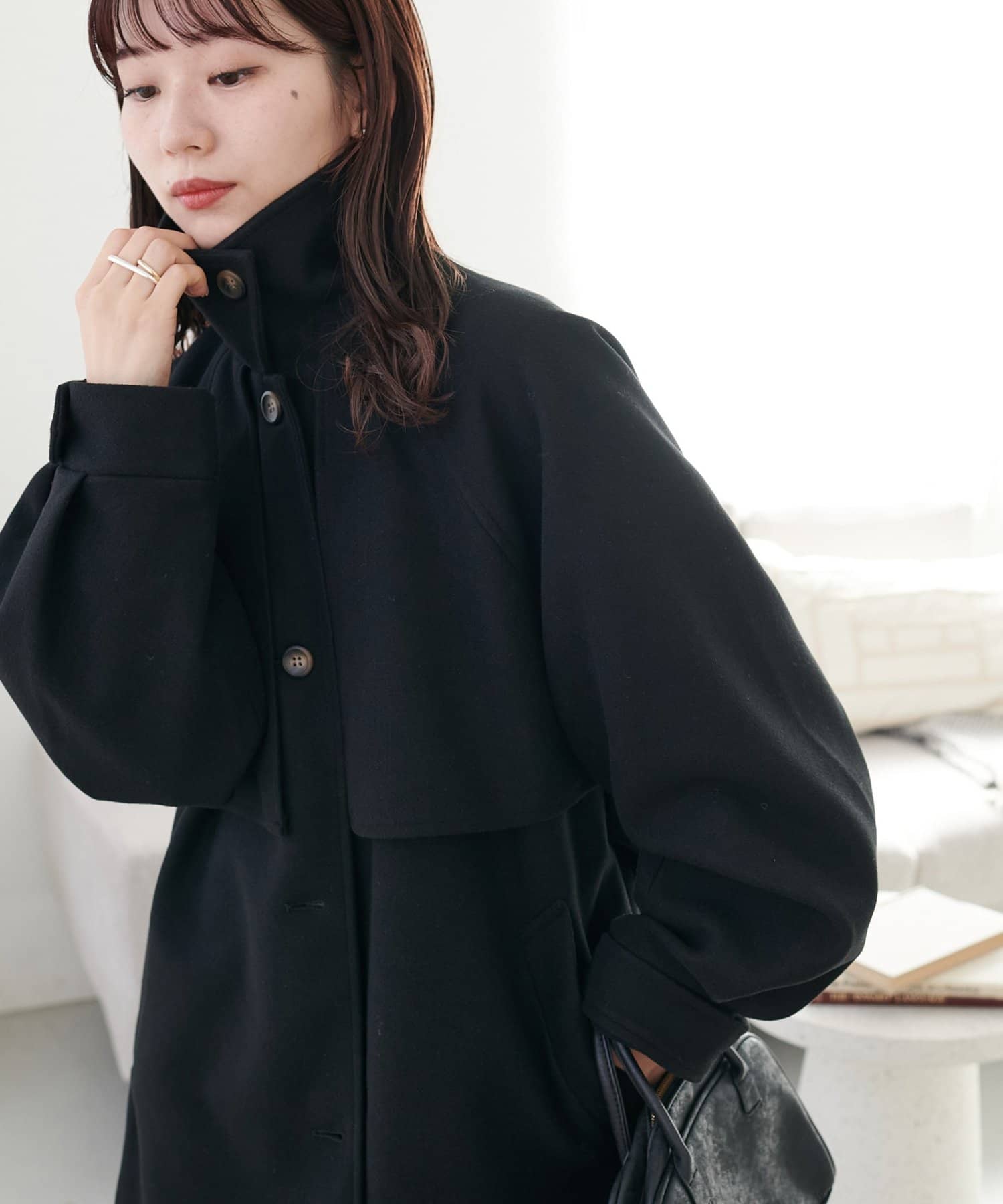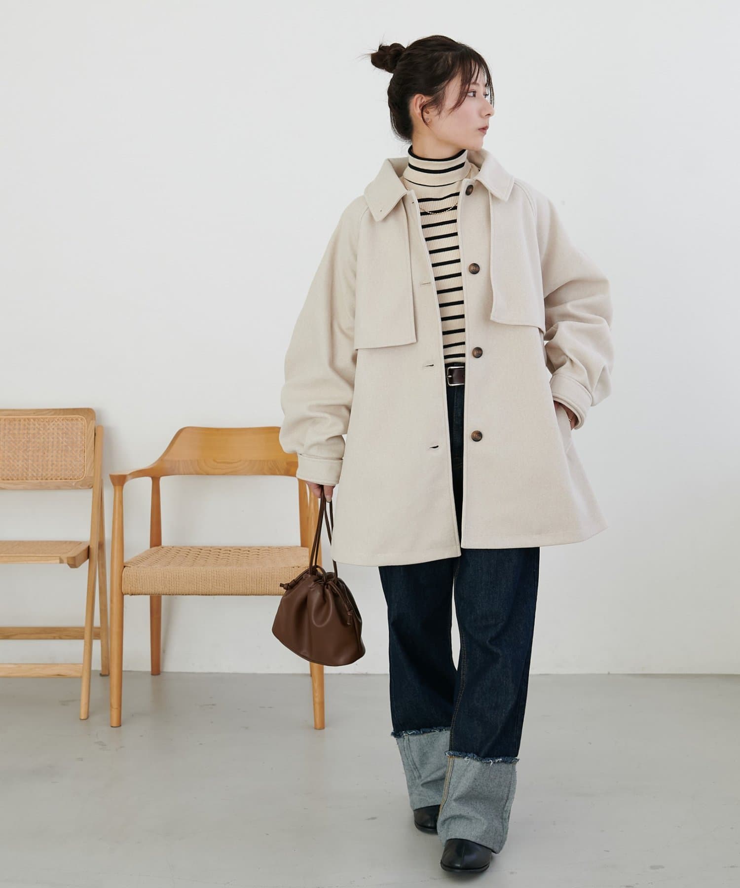 衿を立てても寝かせても着られる2WAYデザインが魅力のミドルコート。