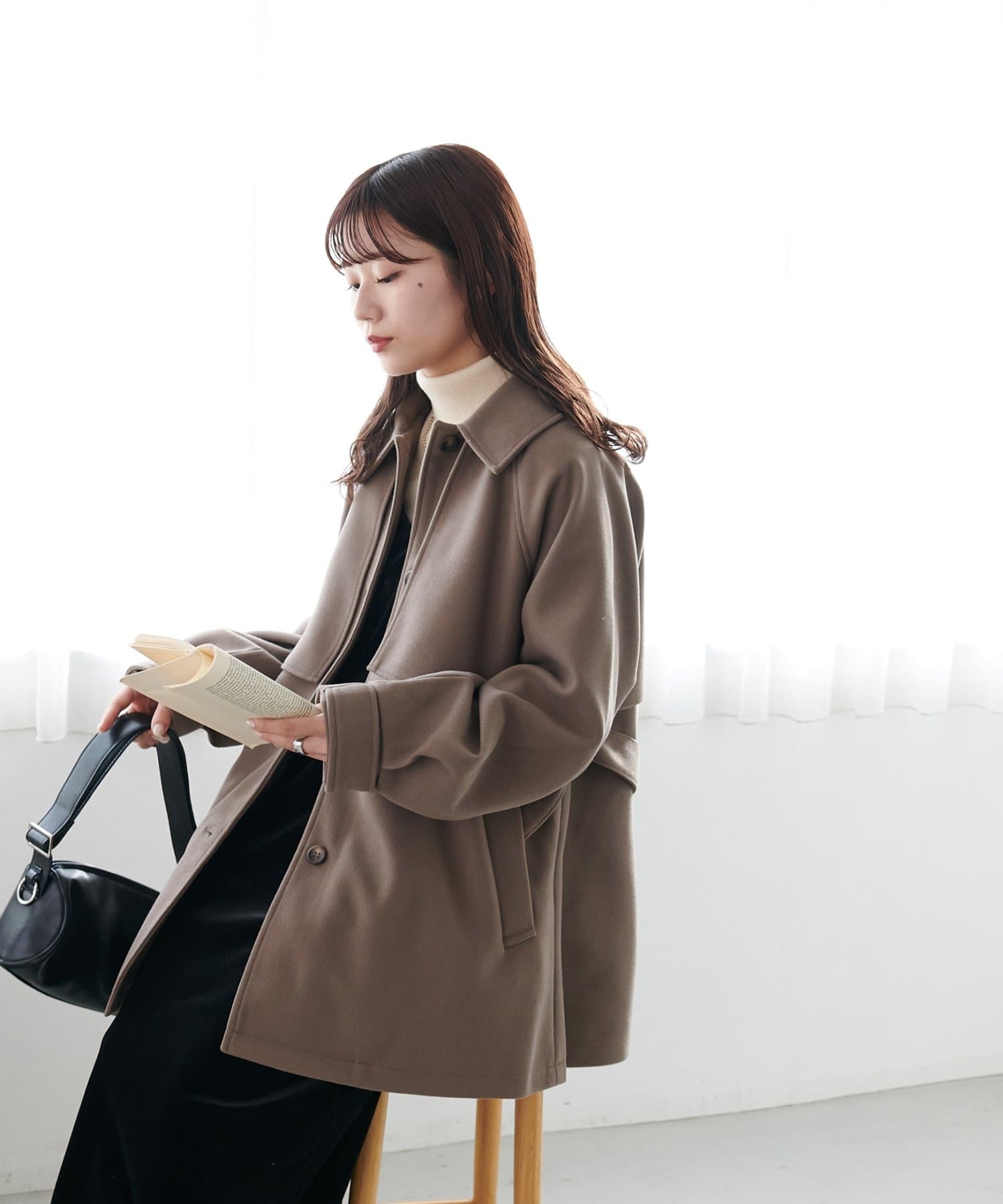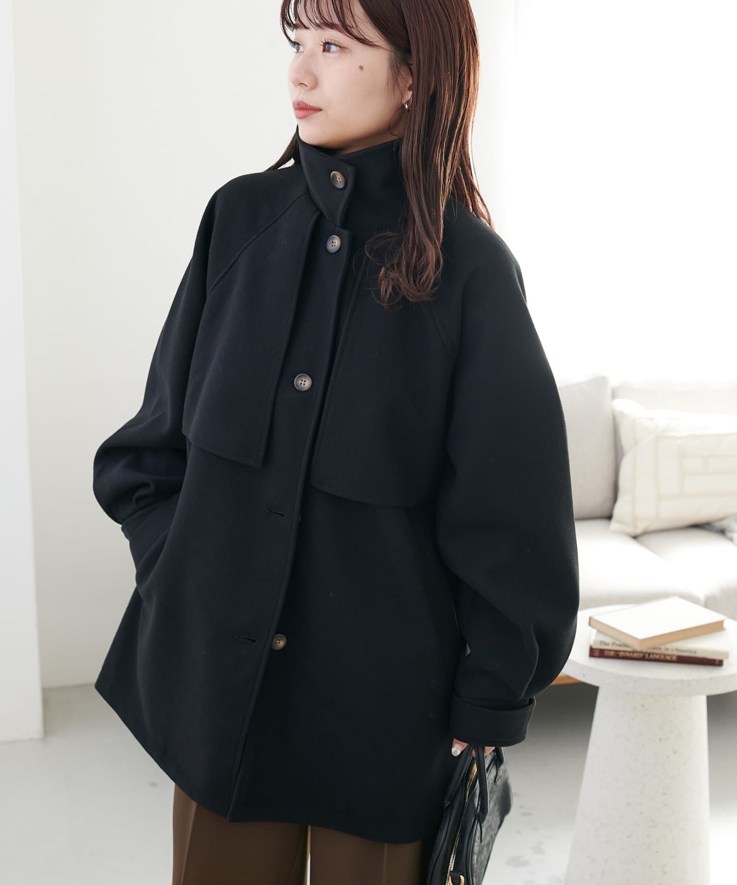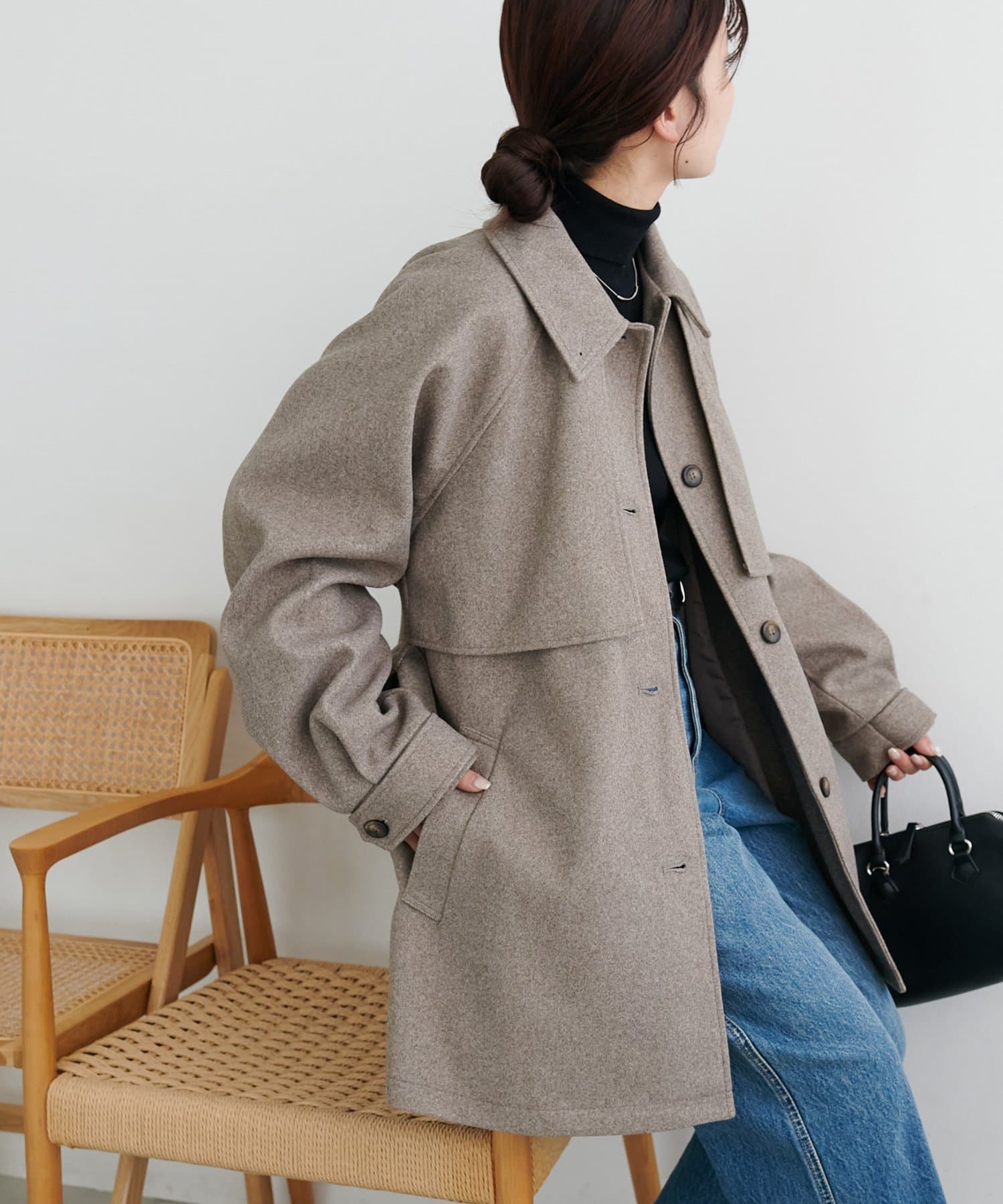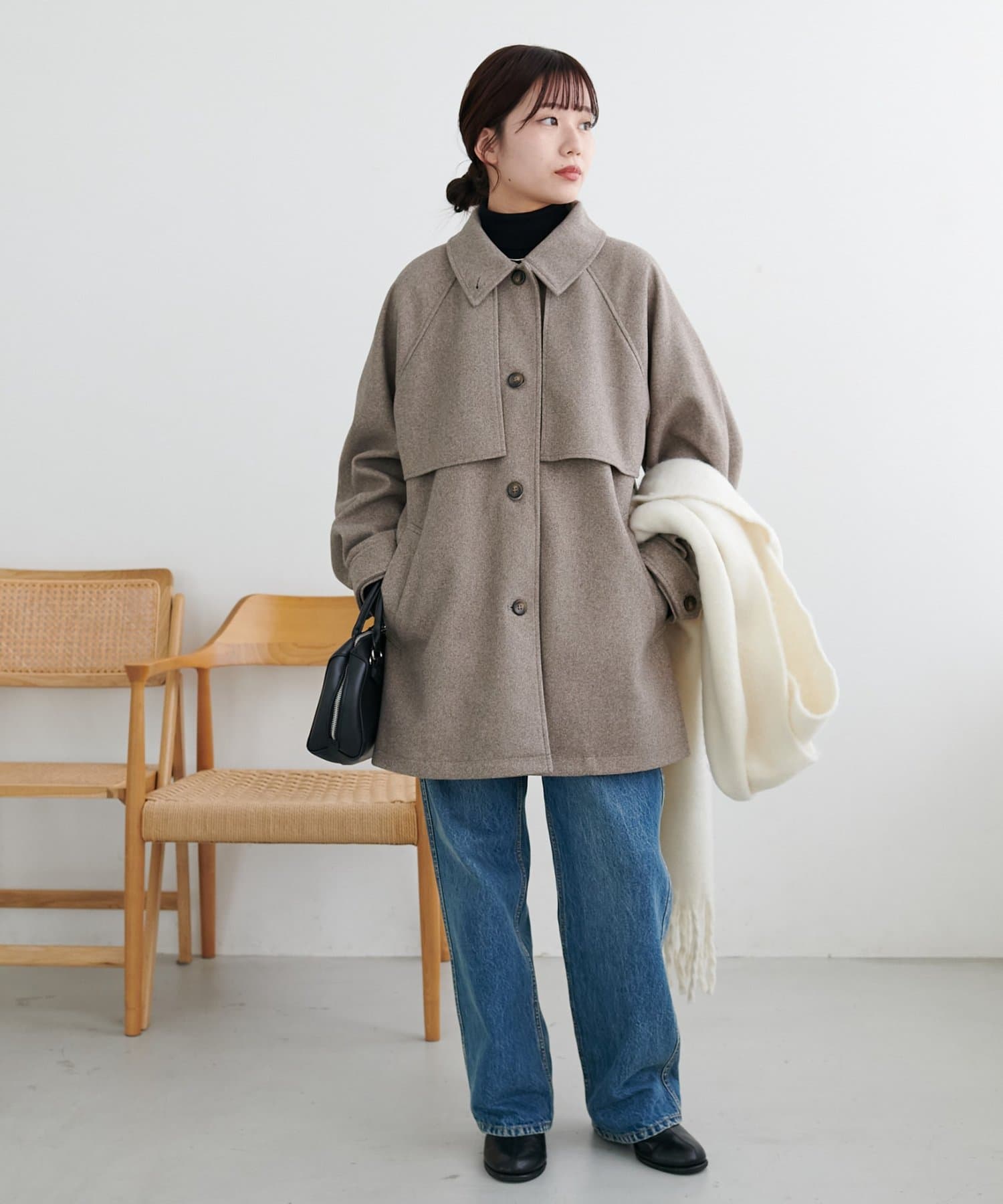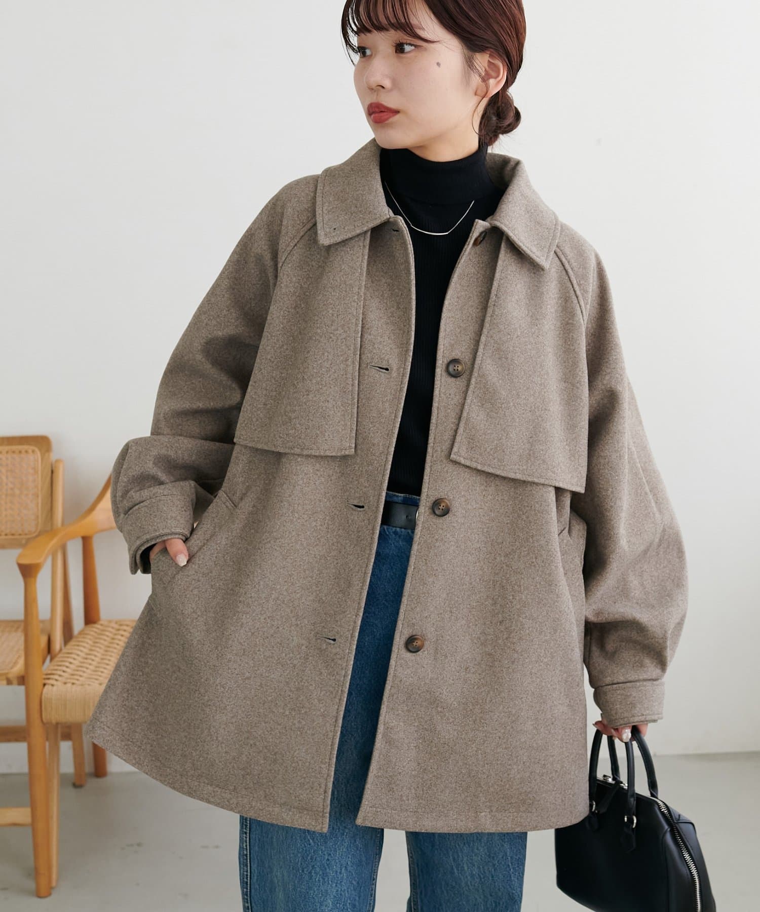 衿を立てても寝かせても着られる2WAYデザインが魅力のミドルコート。