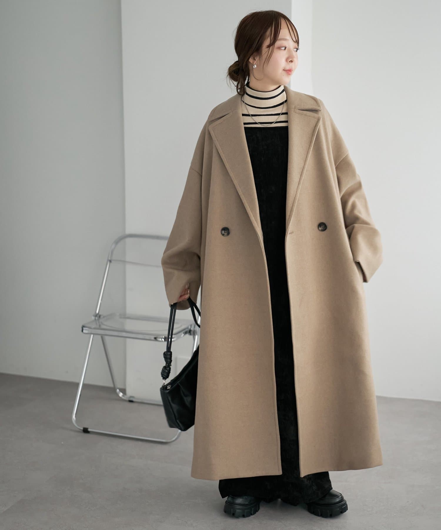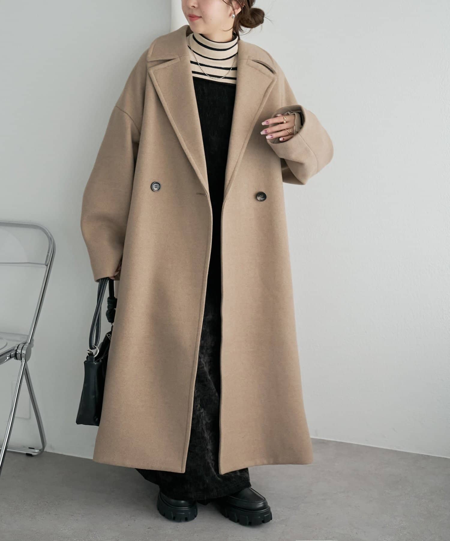 155cmスタッフ:ロングコートなので、スニーカーやバレーシューズよりもブーツや高さのある靴を合わせると足元に抜け感が出ます。