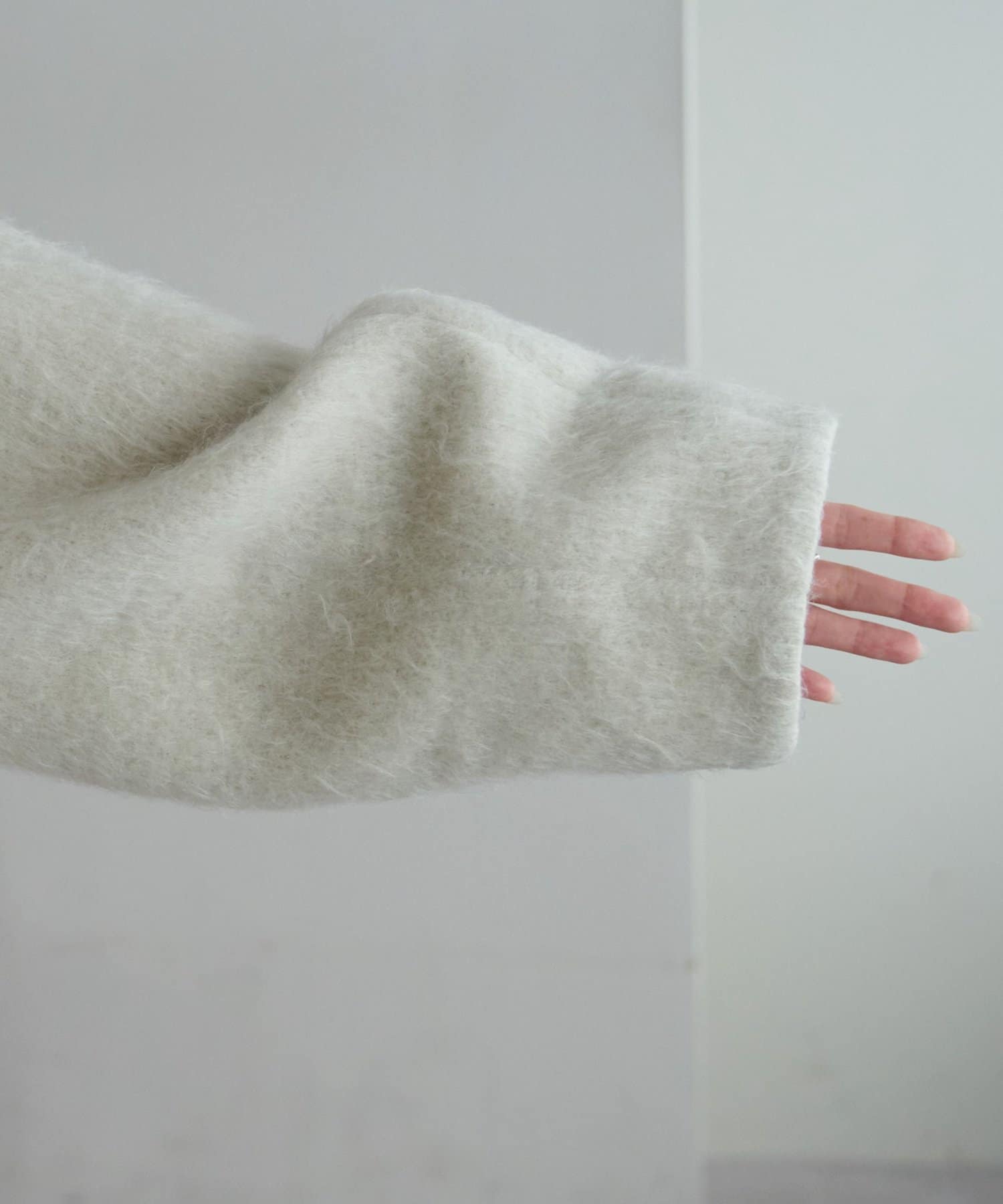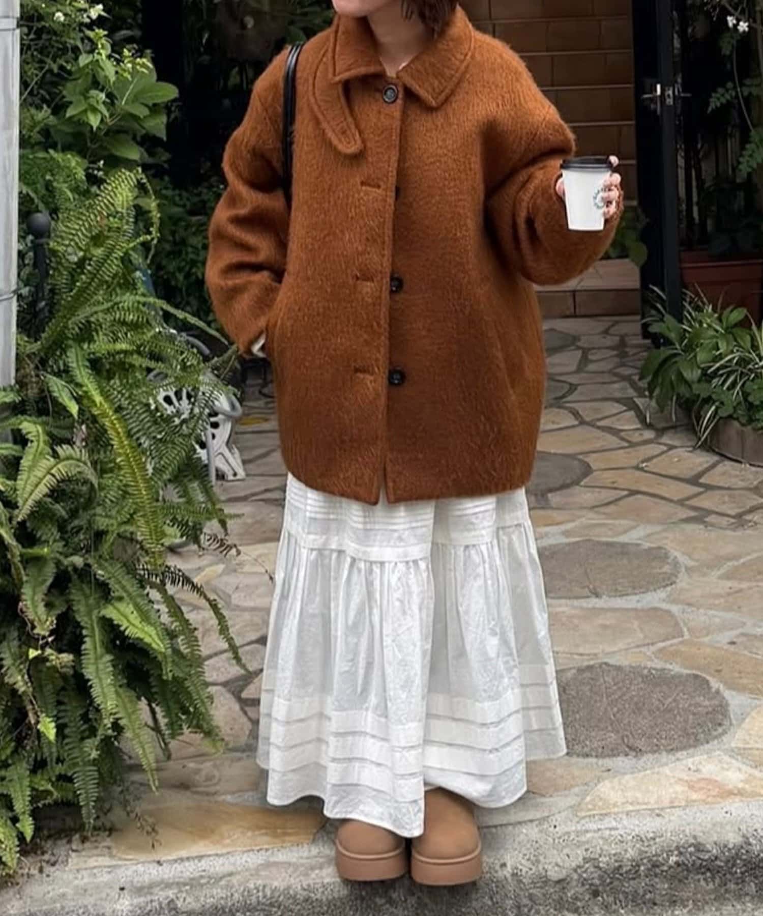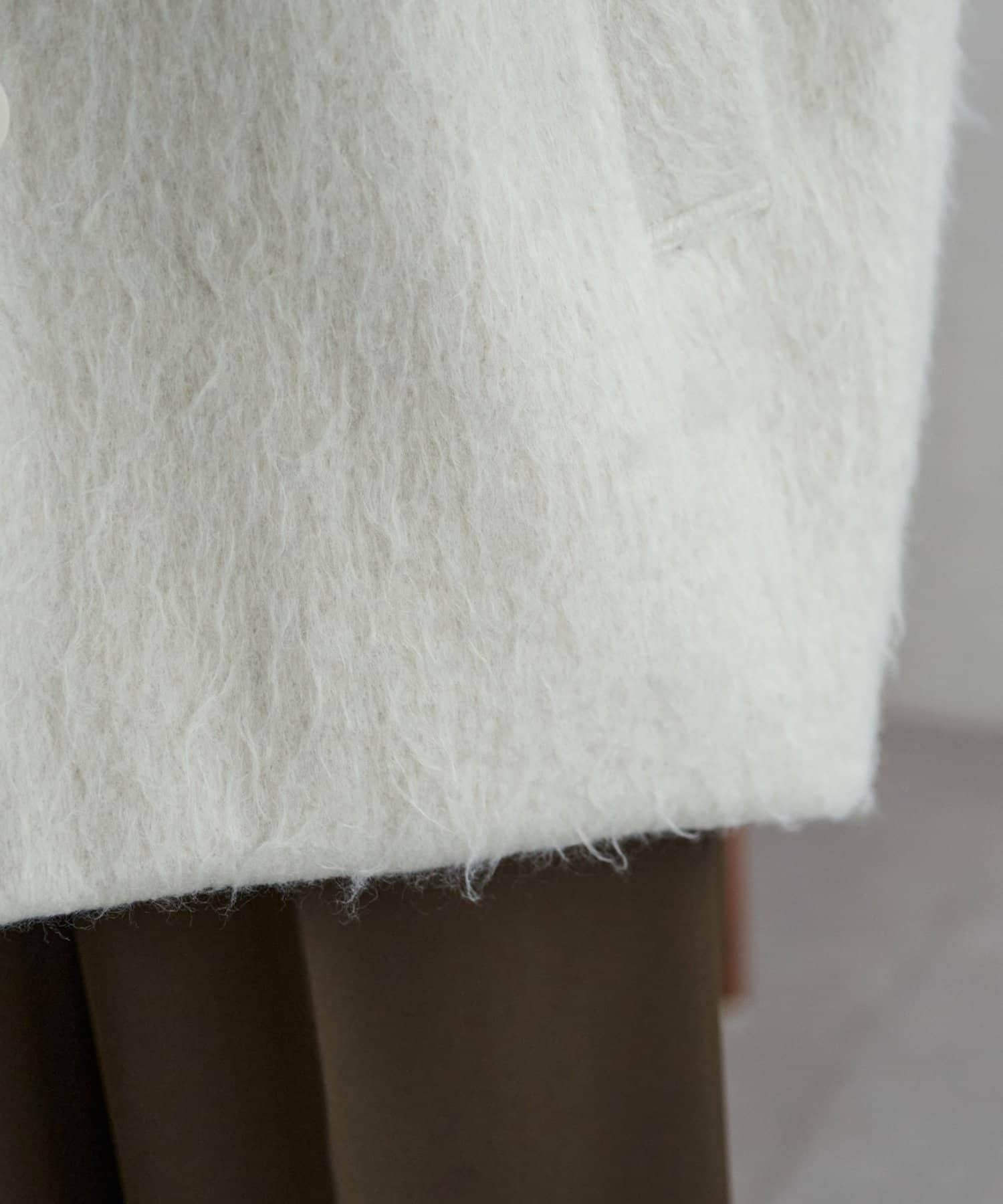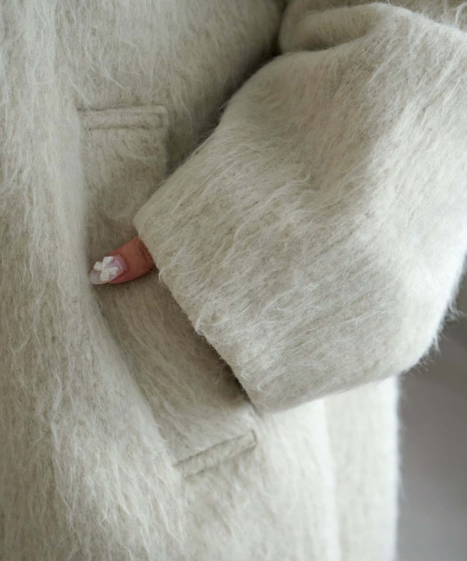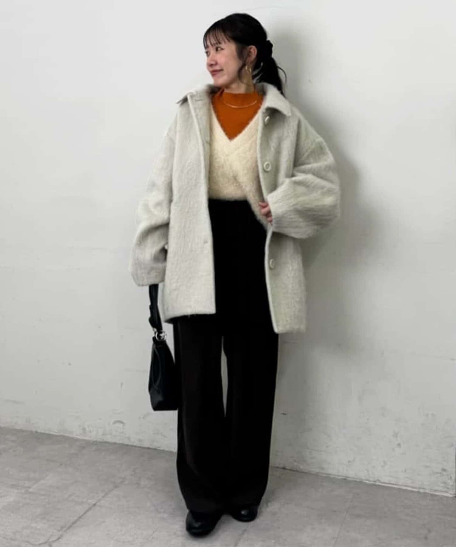 ふんわりとしたシャギー素材がシーズンムードを高めるミドルコート。