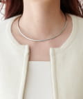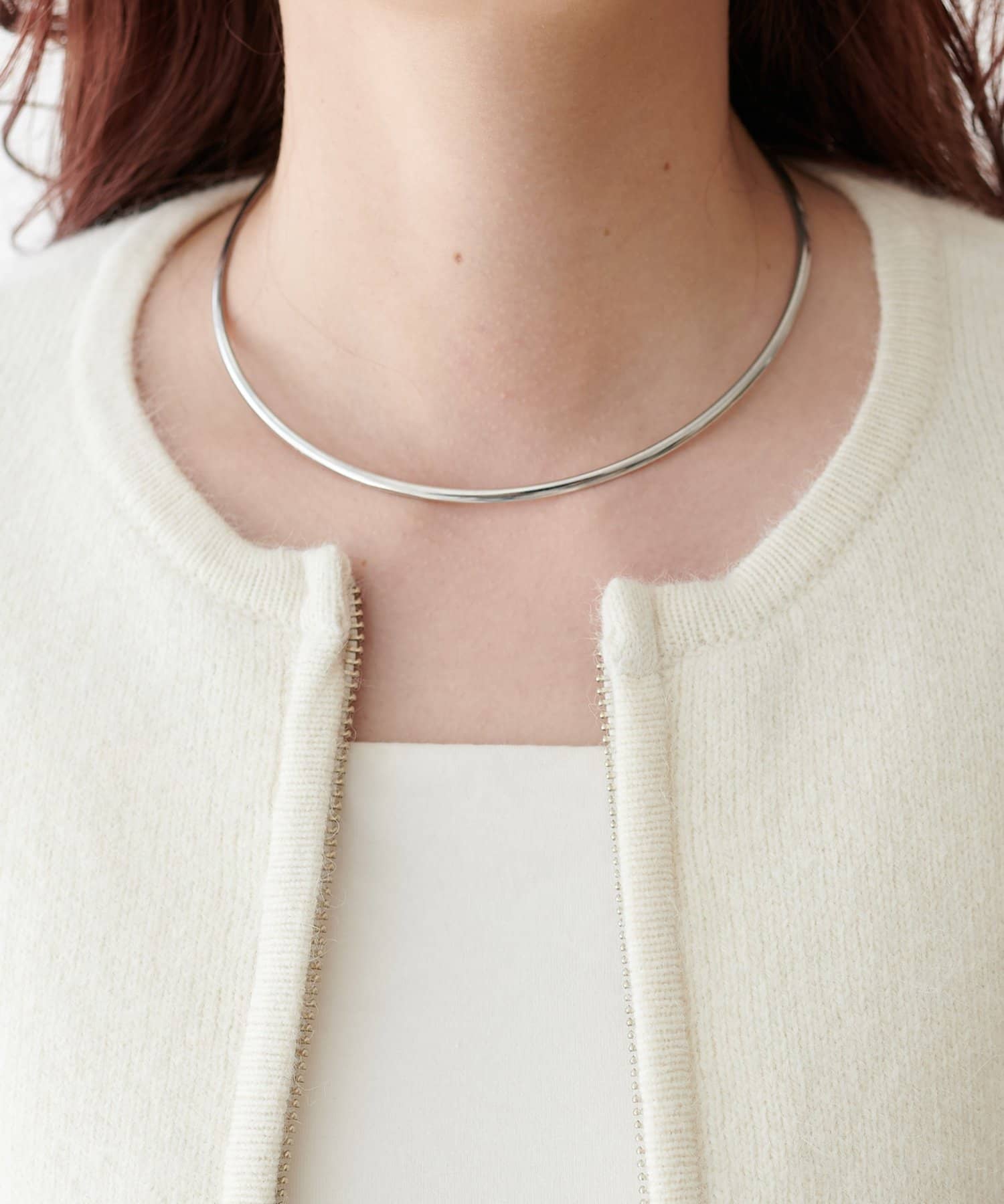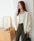 首元はすっきりとしたノーカラーデザインでシンプルながらもモード感を演出。