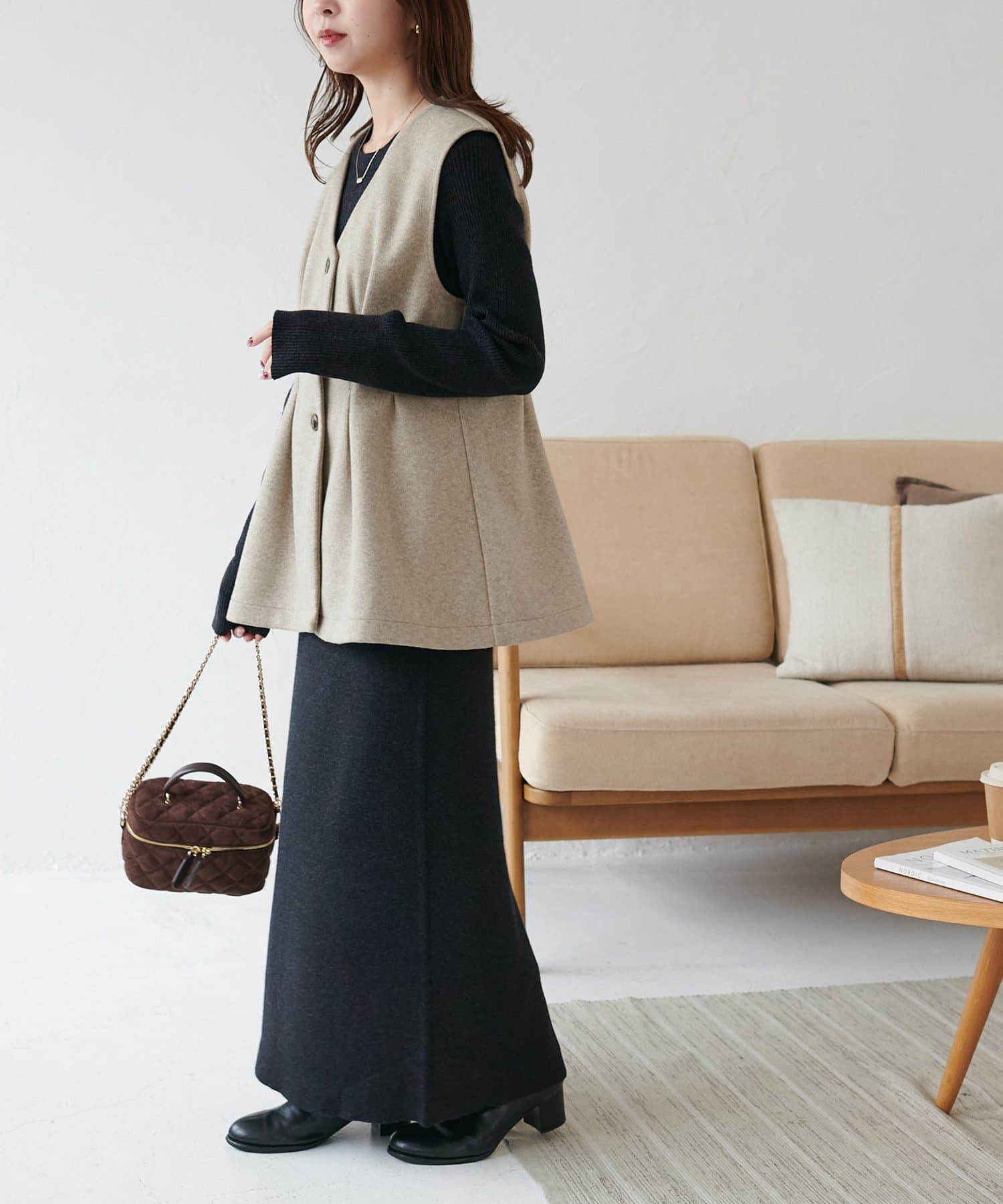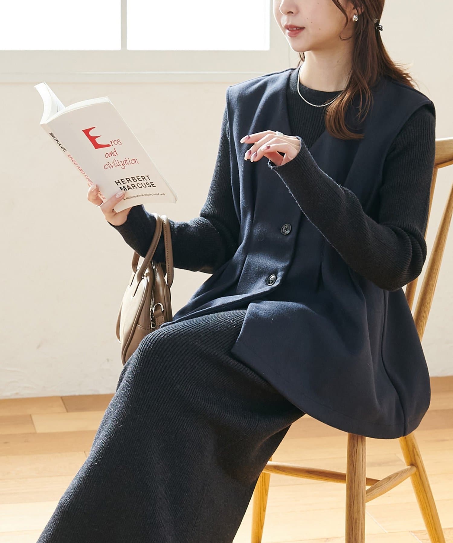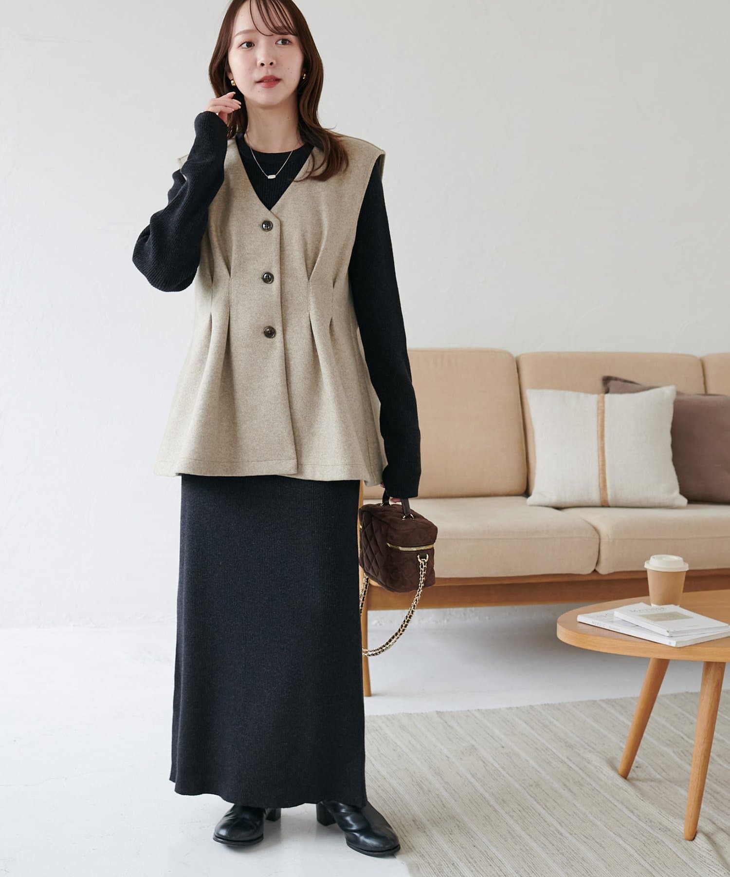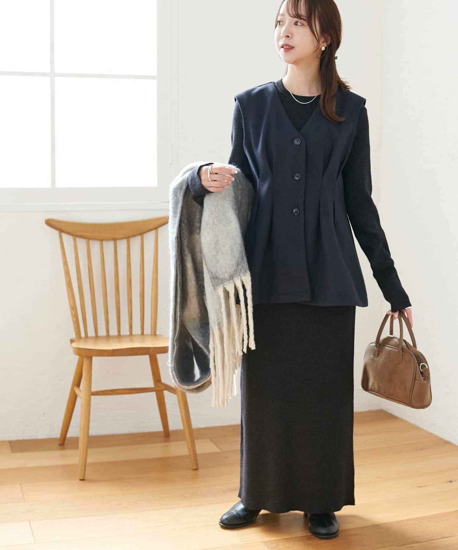 ジレを外せばシンプルなニットセットアップとして、ジレ単体をデニムやワンピースに重ねて着回すのもおすすめ◎