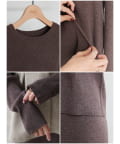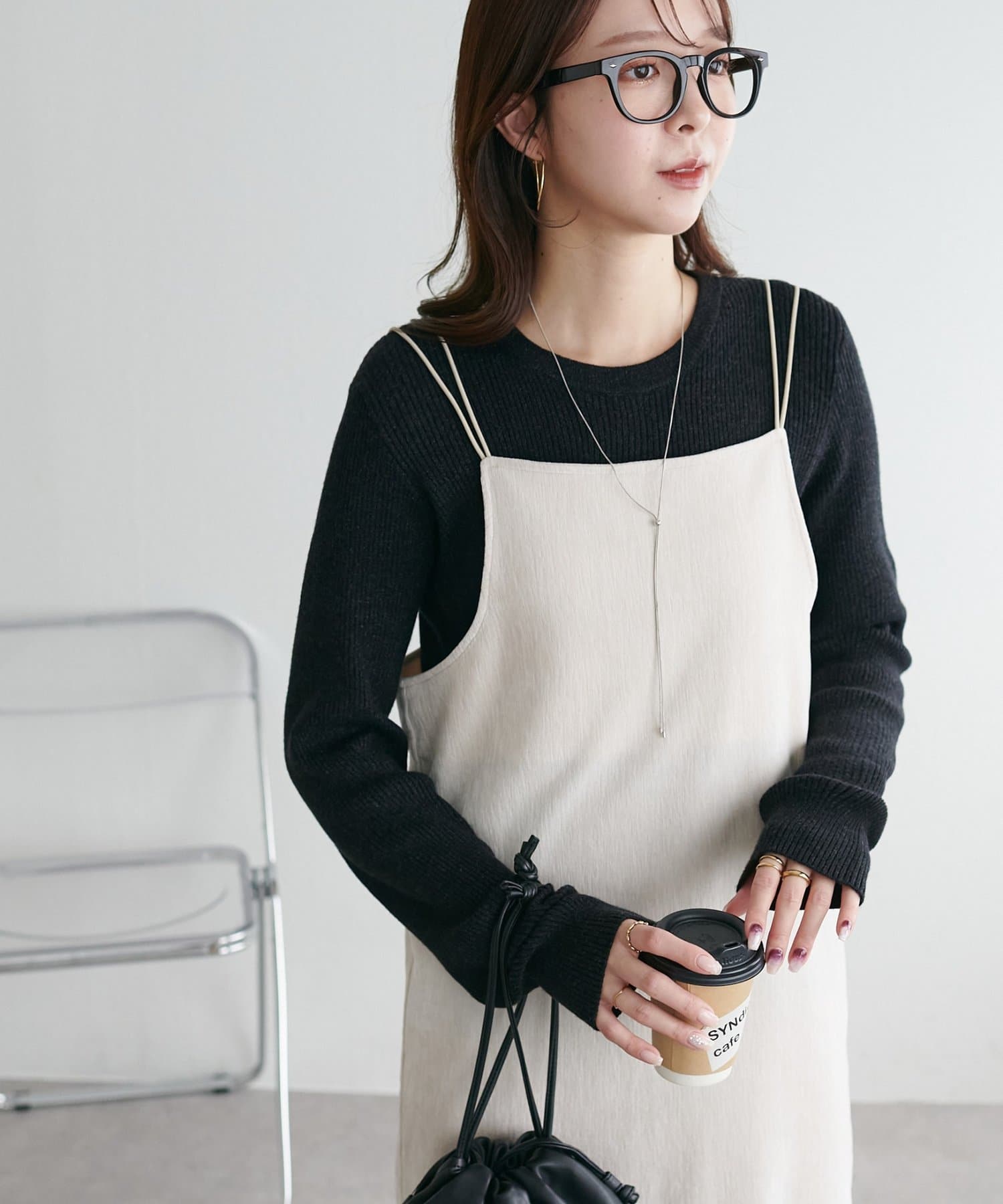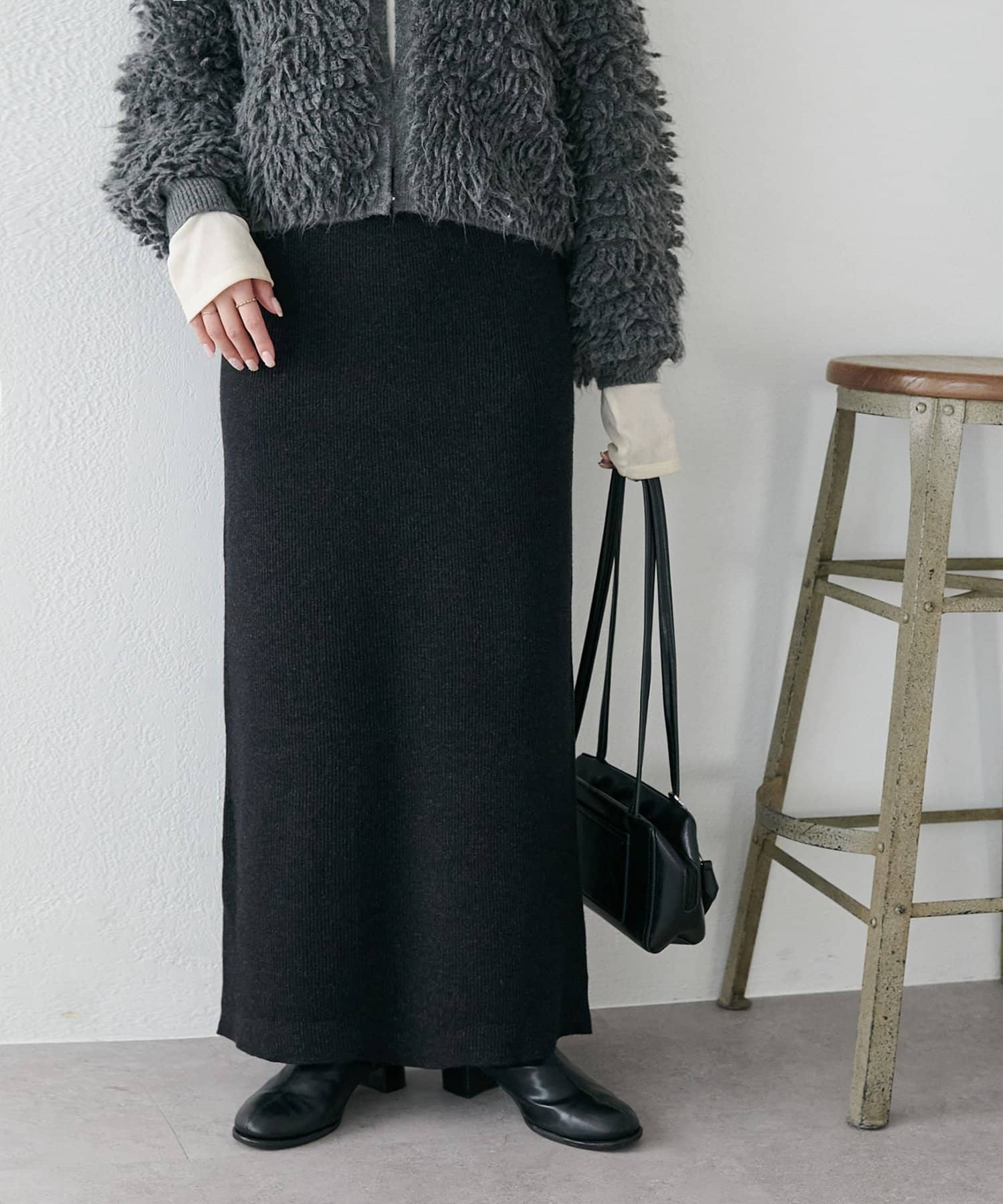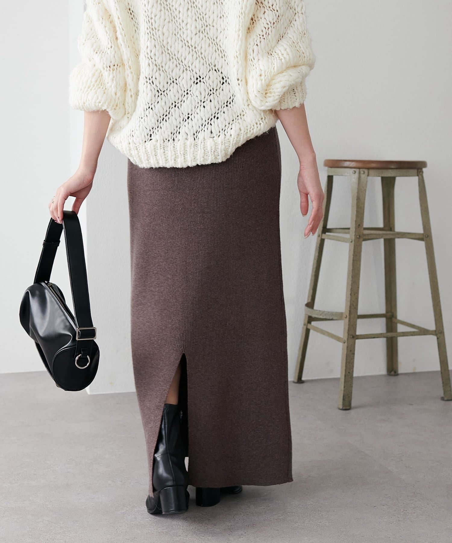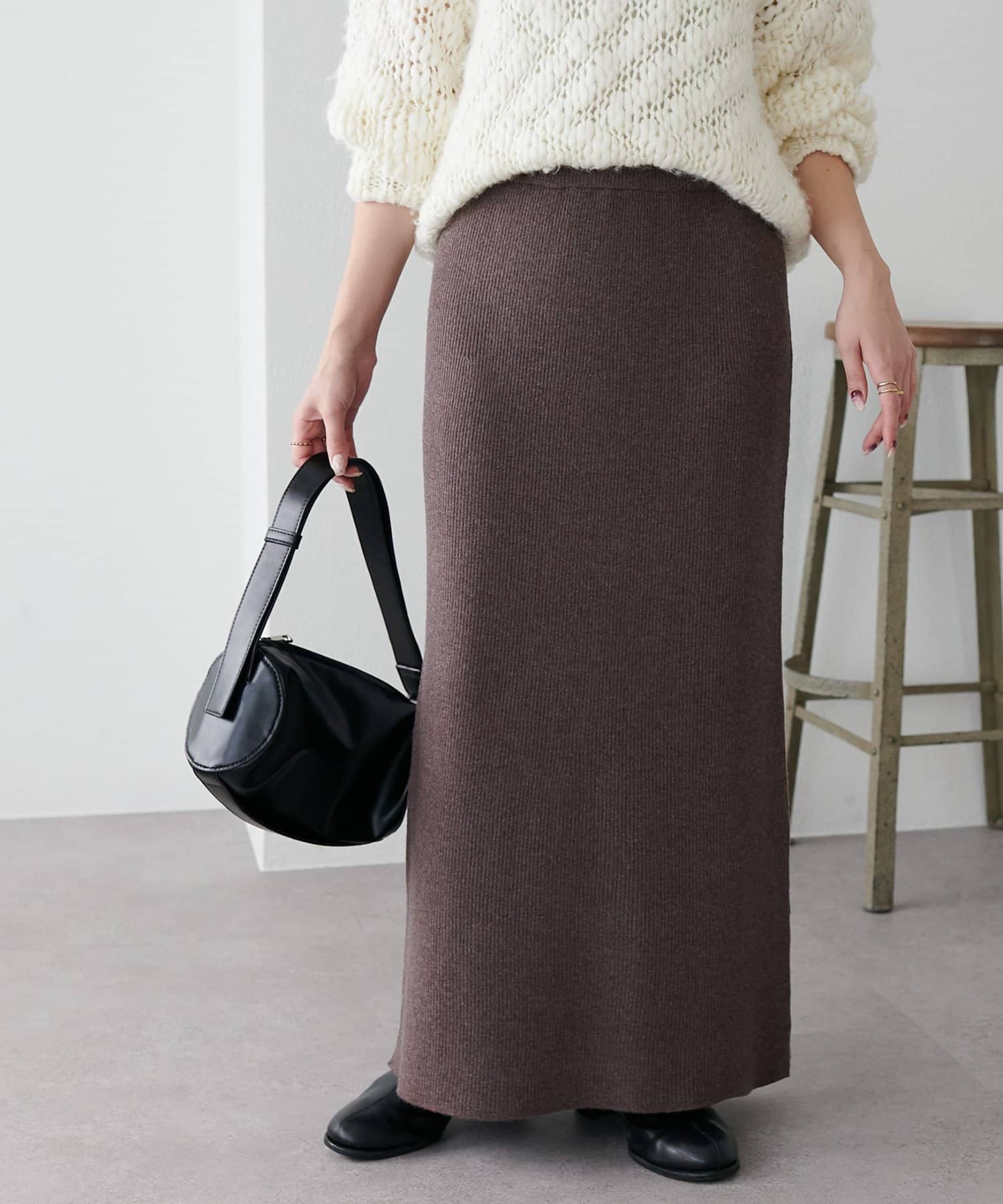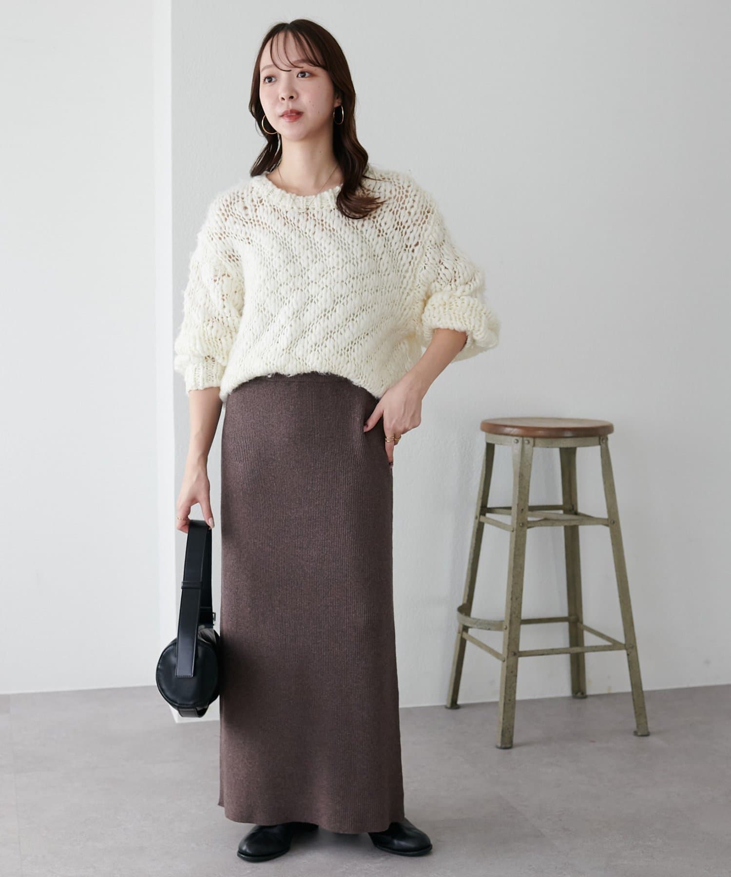 体のラインを拾いすぎないリブ編みで、すっきりとしたシルエットを演出。