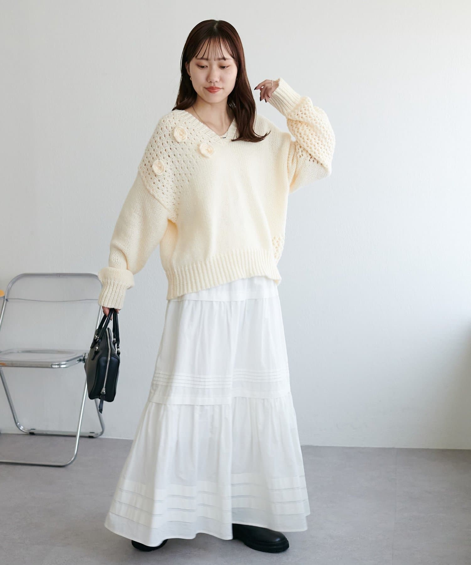 同色で編まれた小さなフラワーモチーフがアクセントになったプルオーバー!