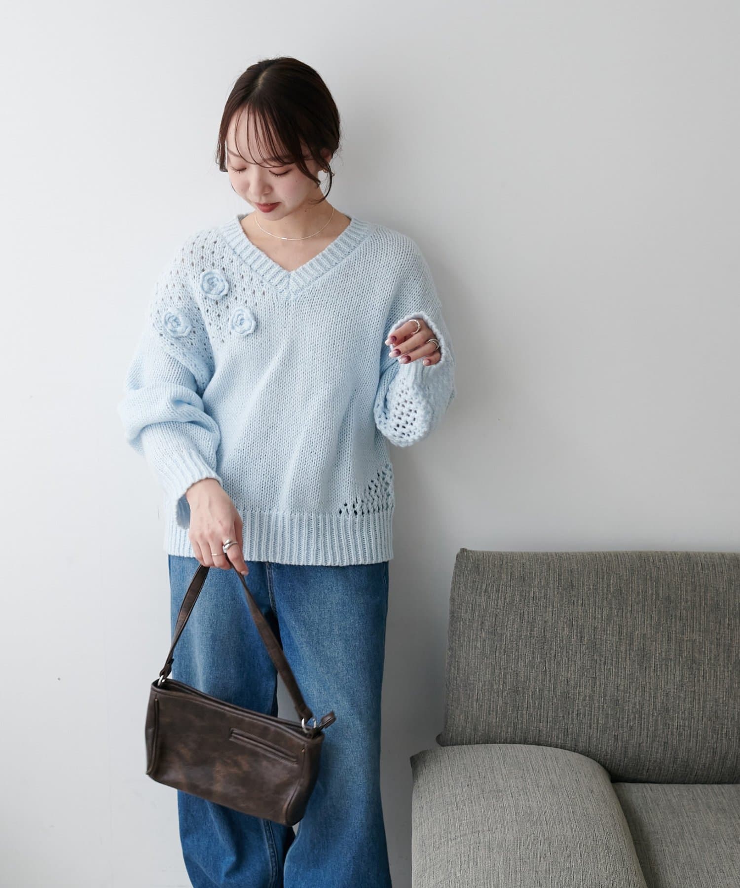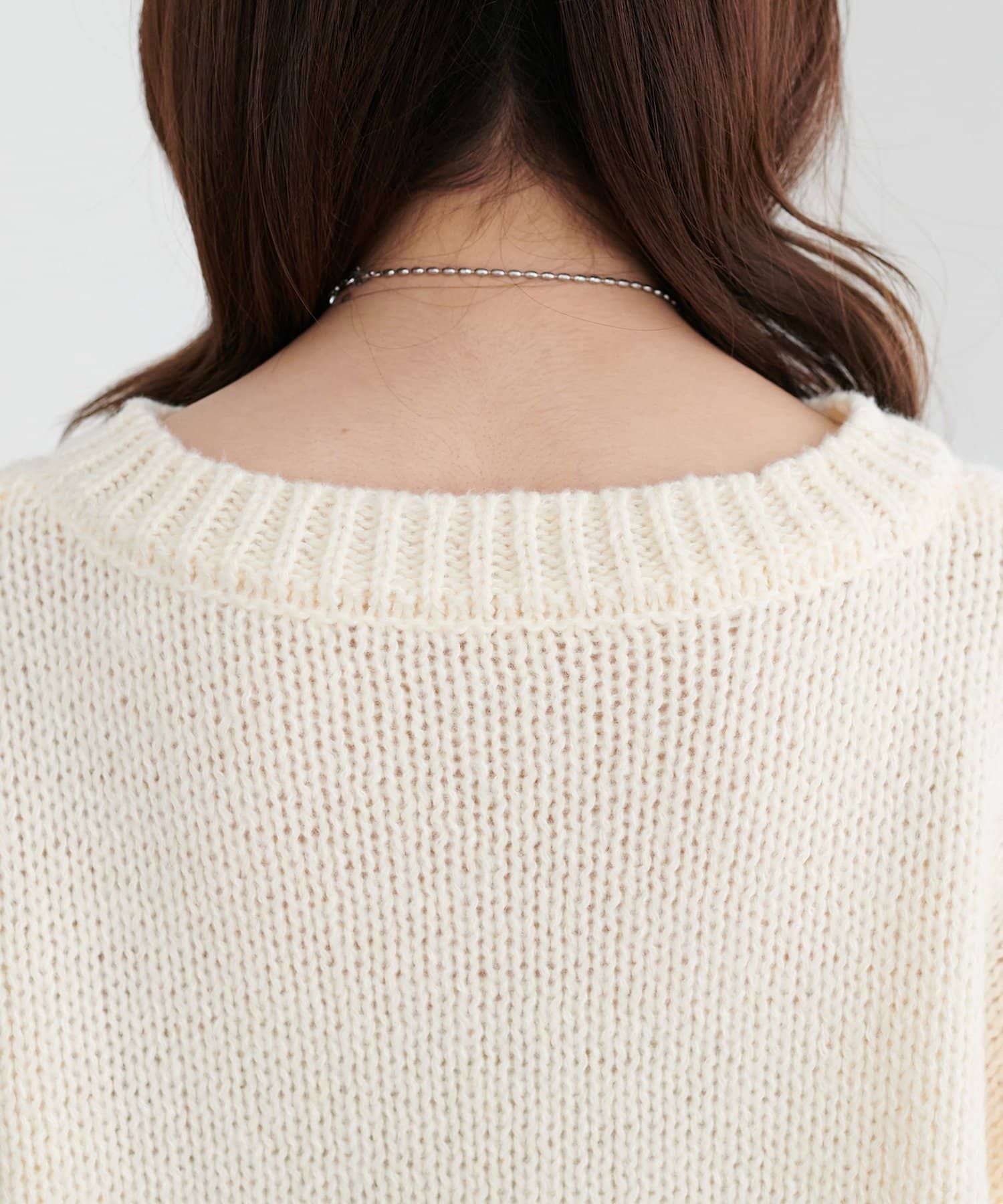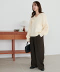 首元がVネックのため、チェーンネックレスやパールネックレスを合わせると顔周りが華やかになりおすすめです♪