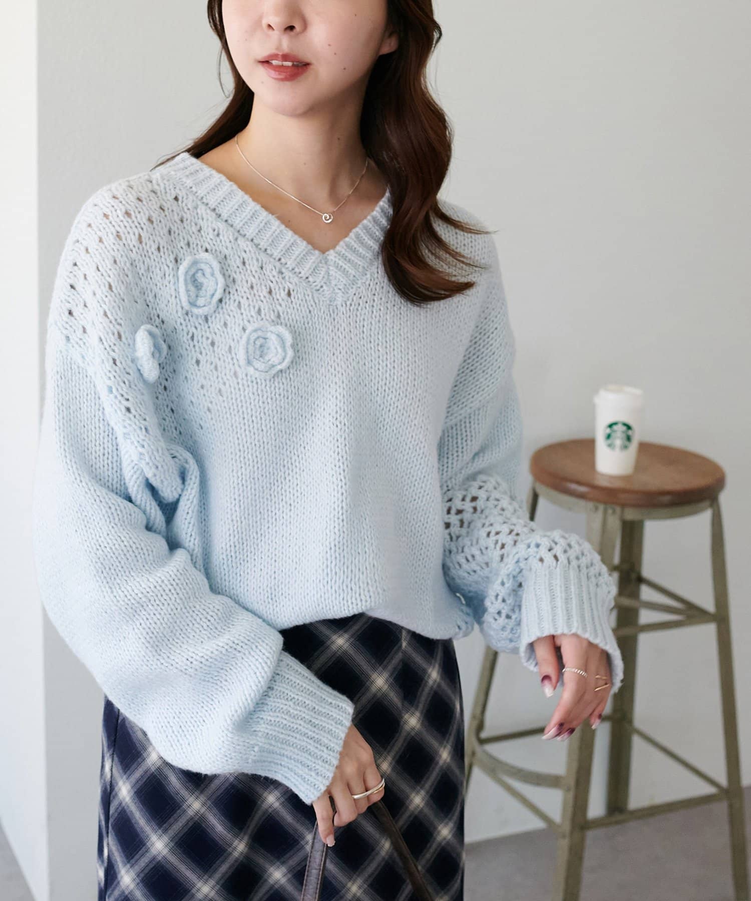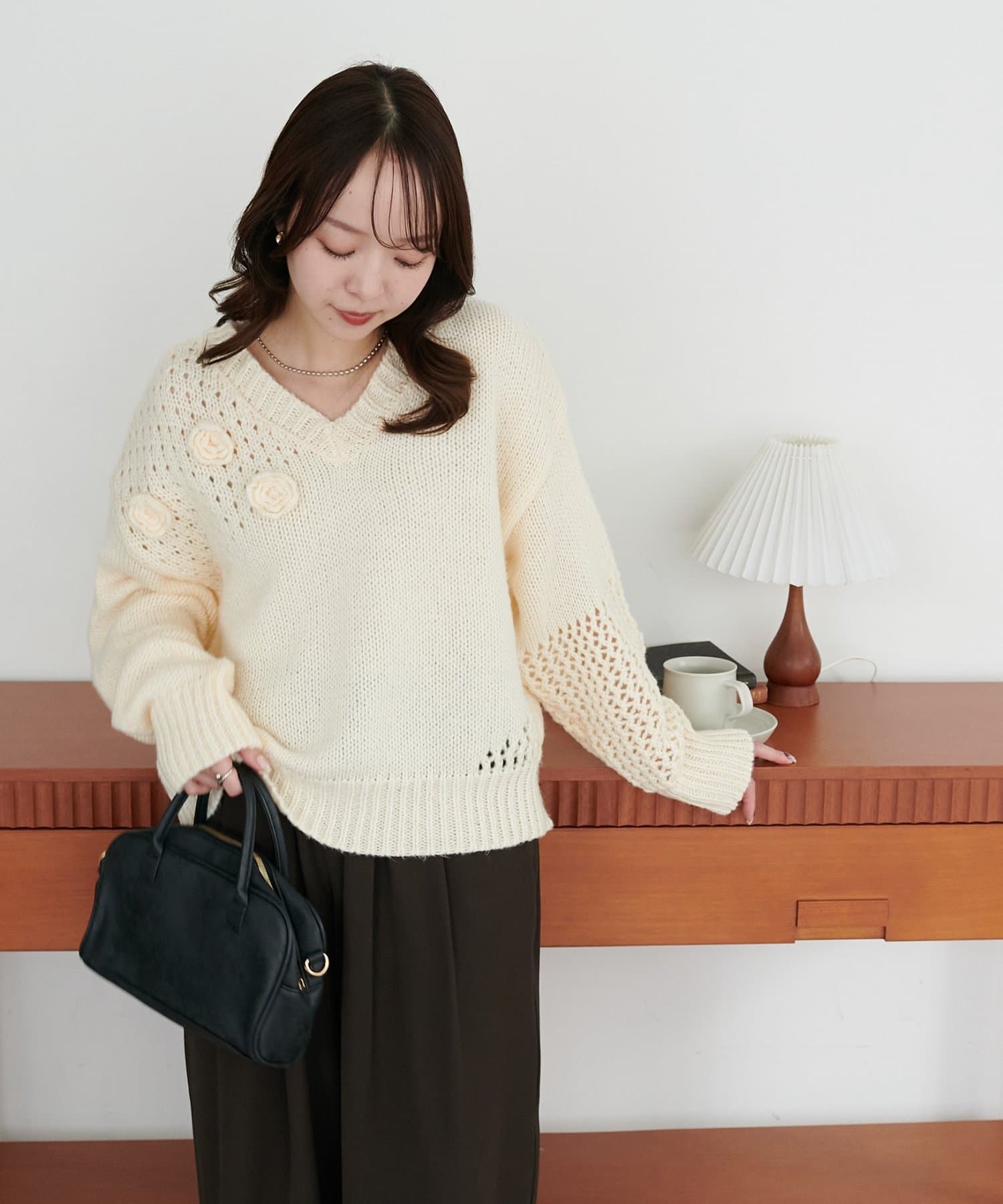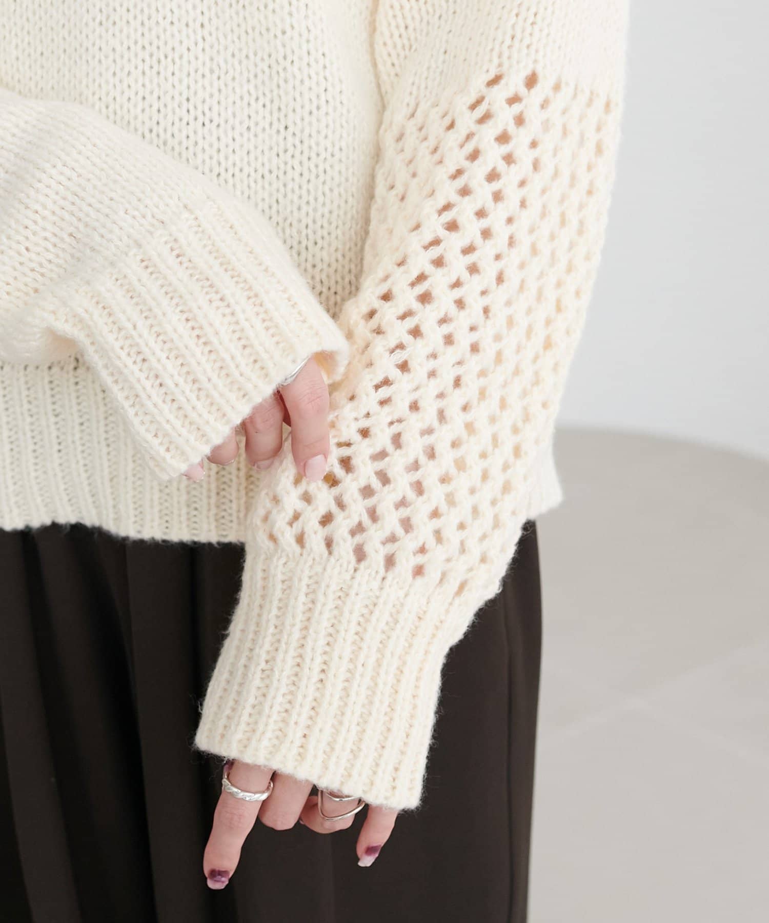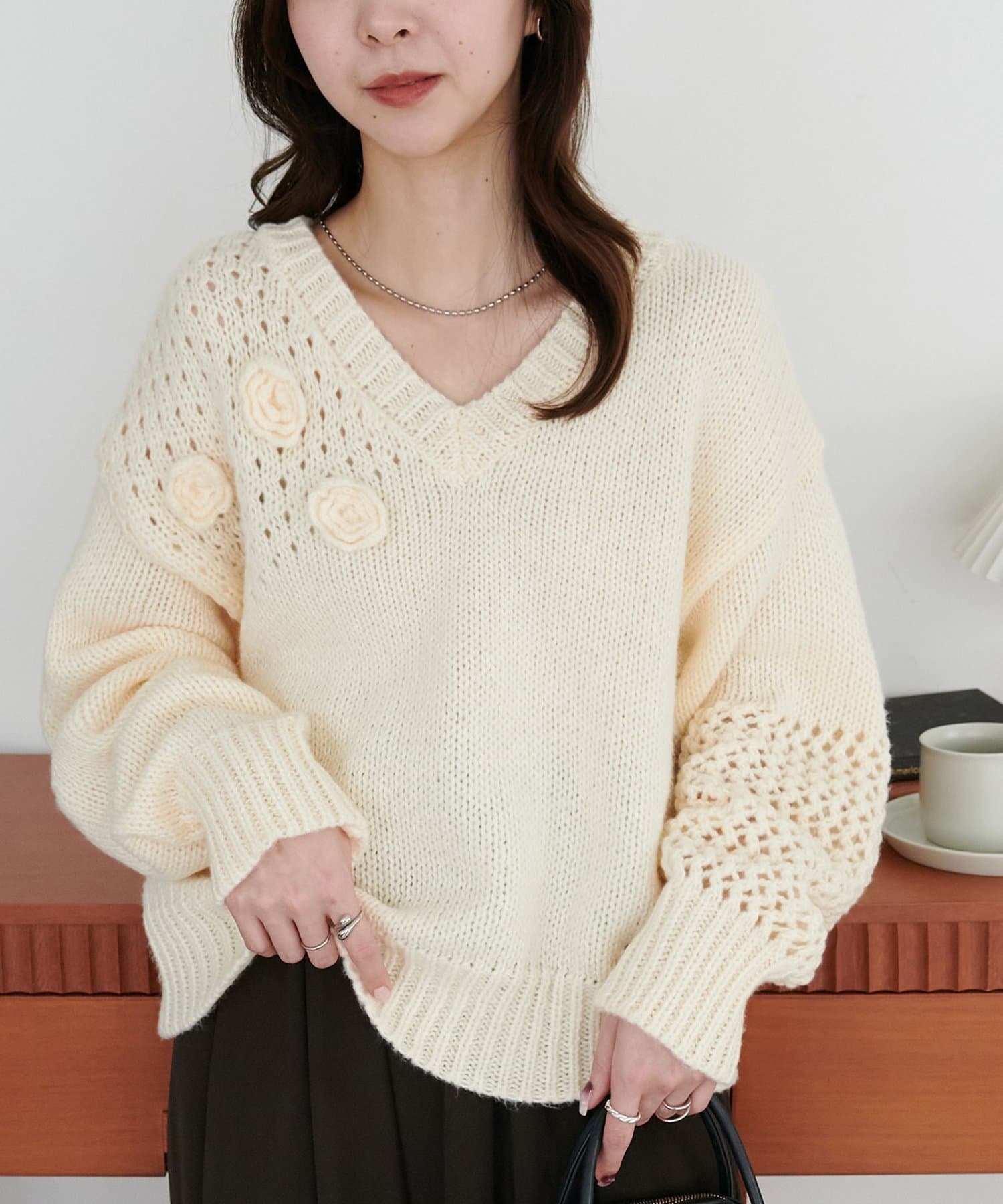 袖や肩部分には透かし編みを取り入れており、軽やかな抜け感を演出♪