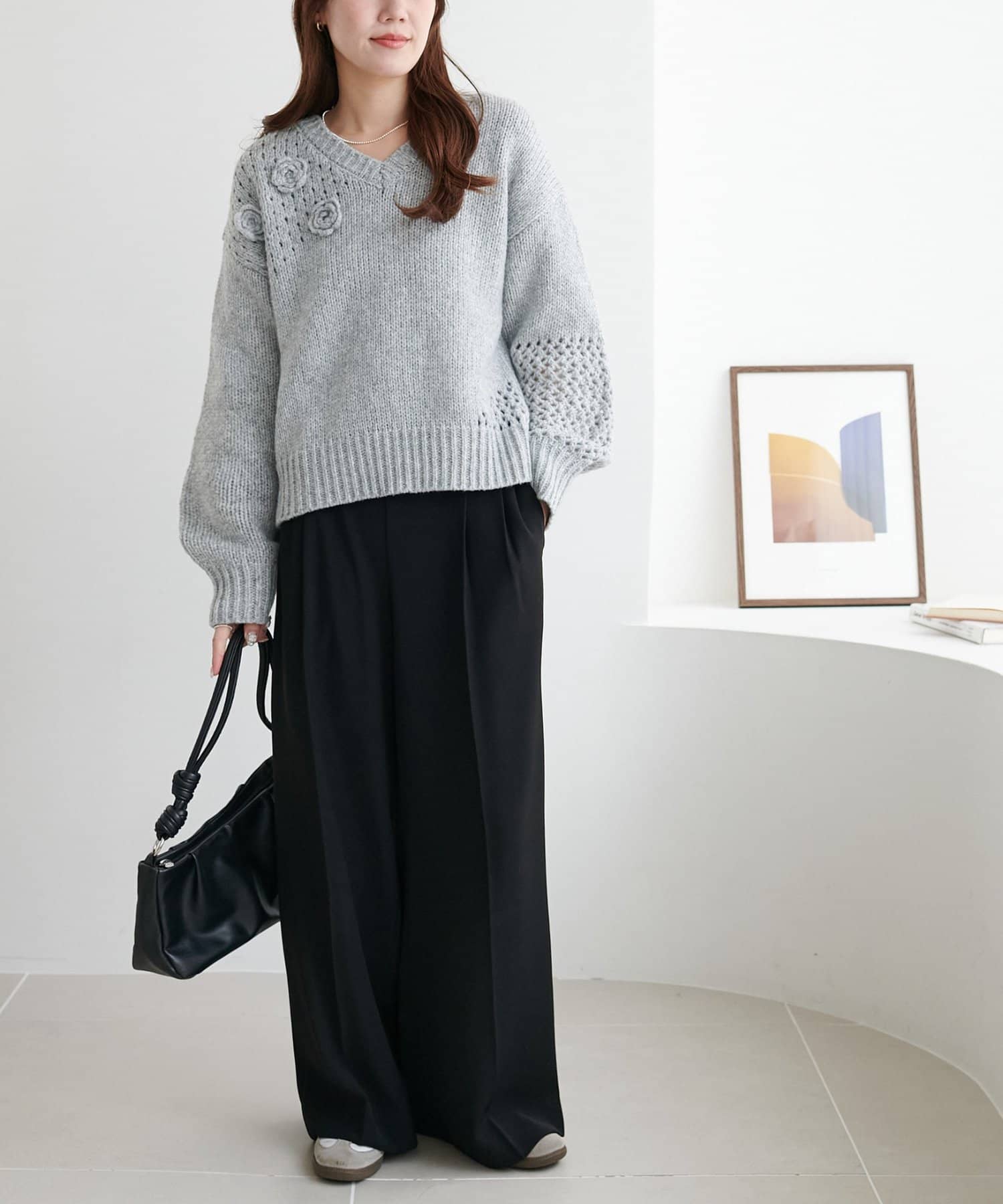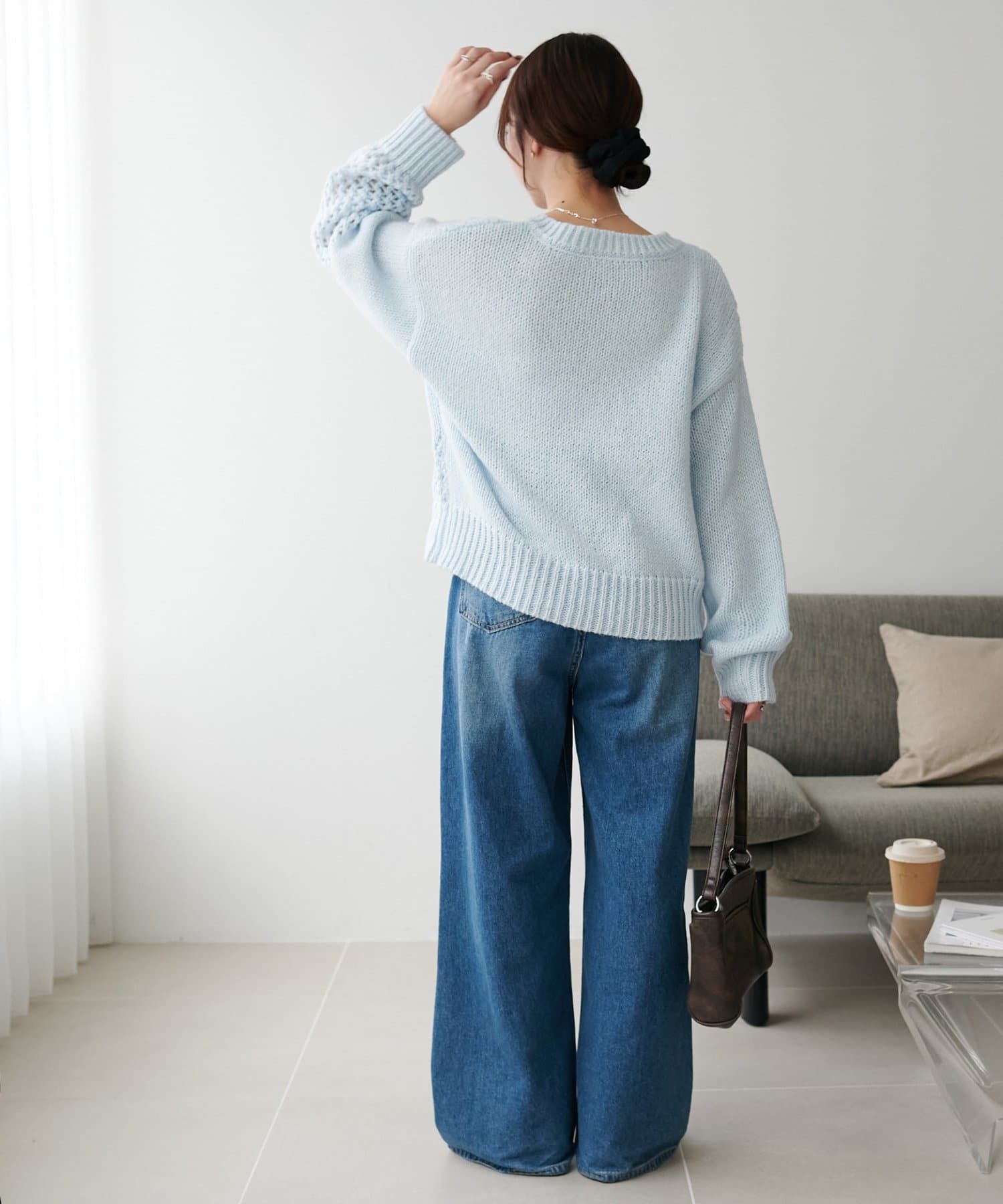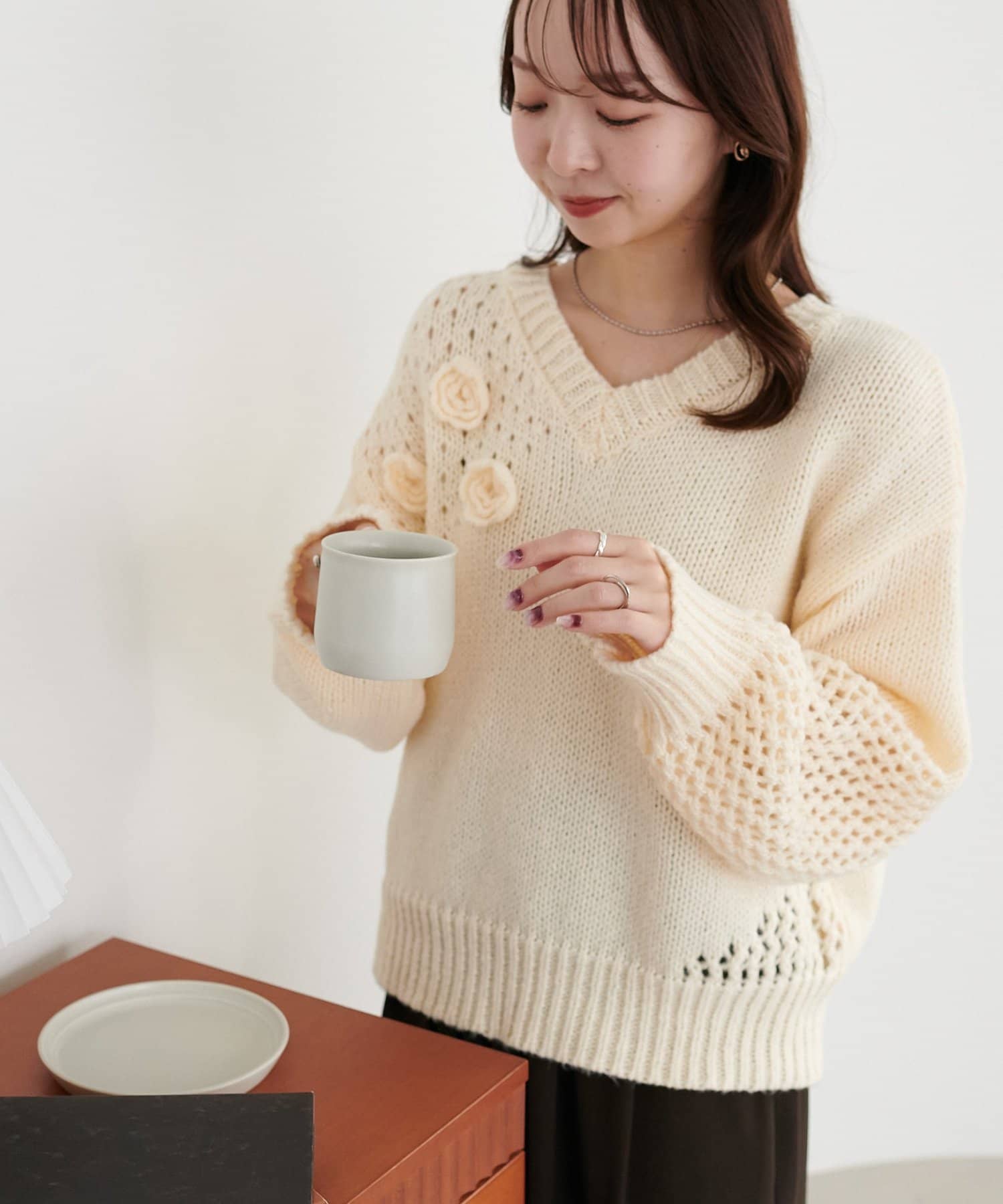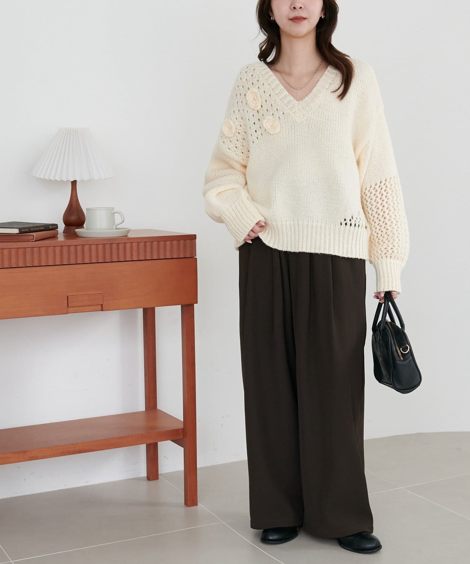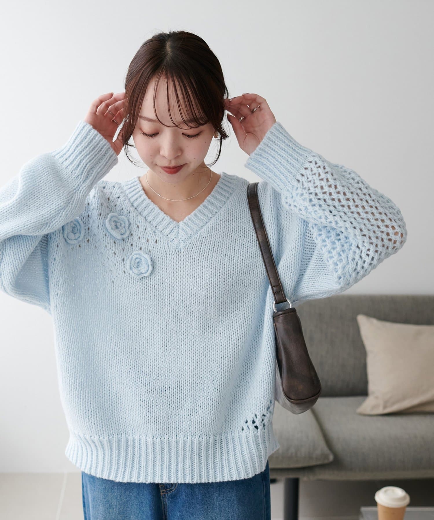 袖や肩部分には透かし編みを取り入れており、軽やかな抜け感を演出♪