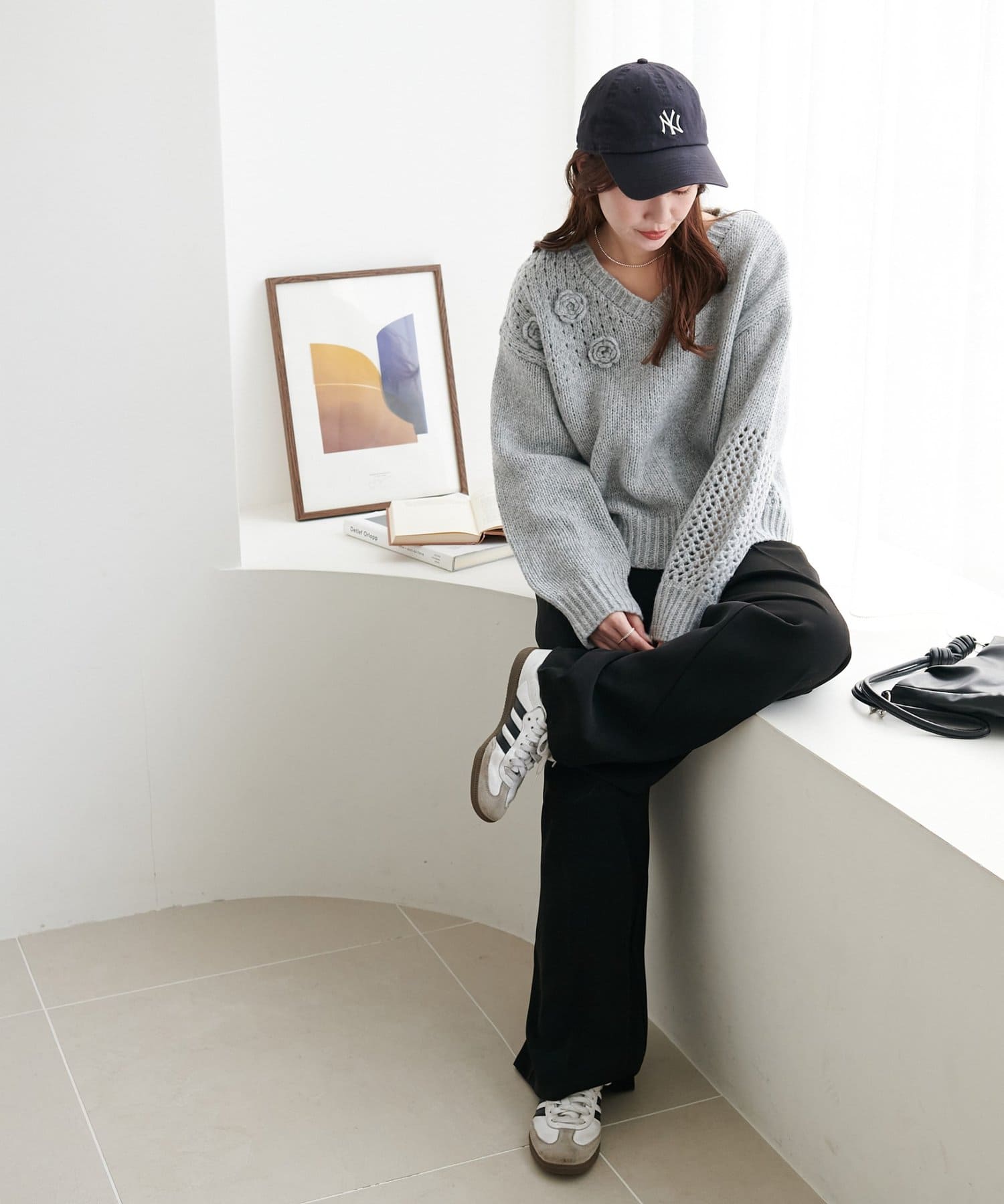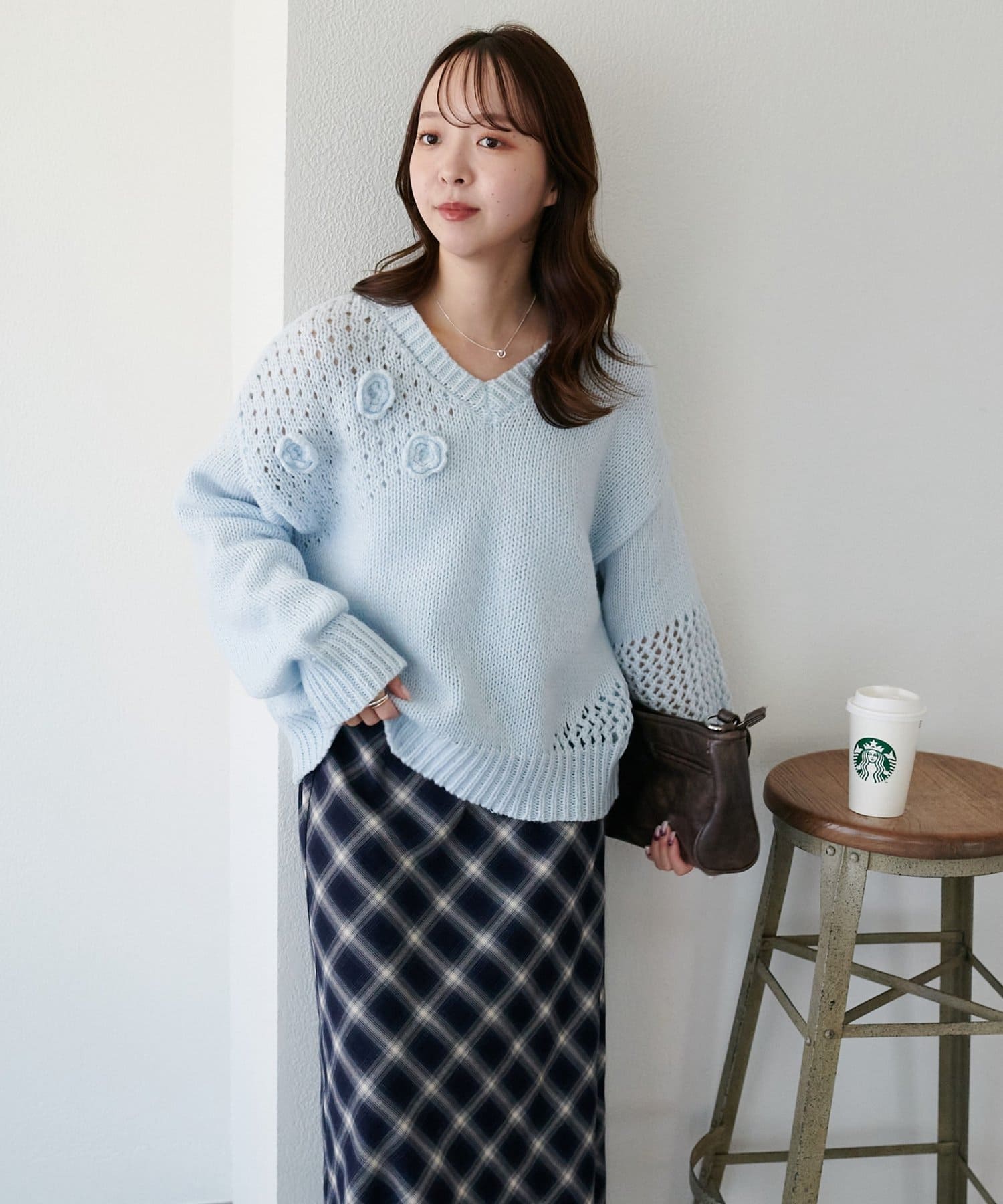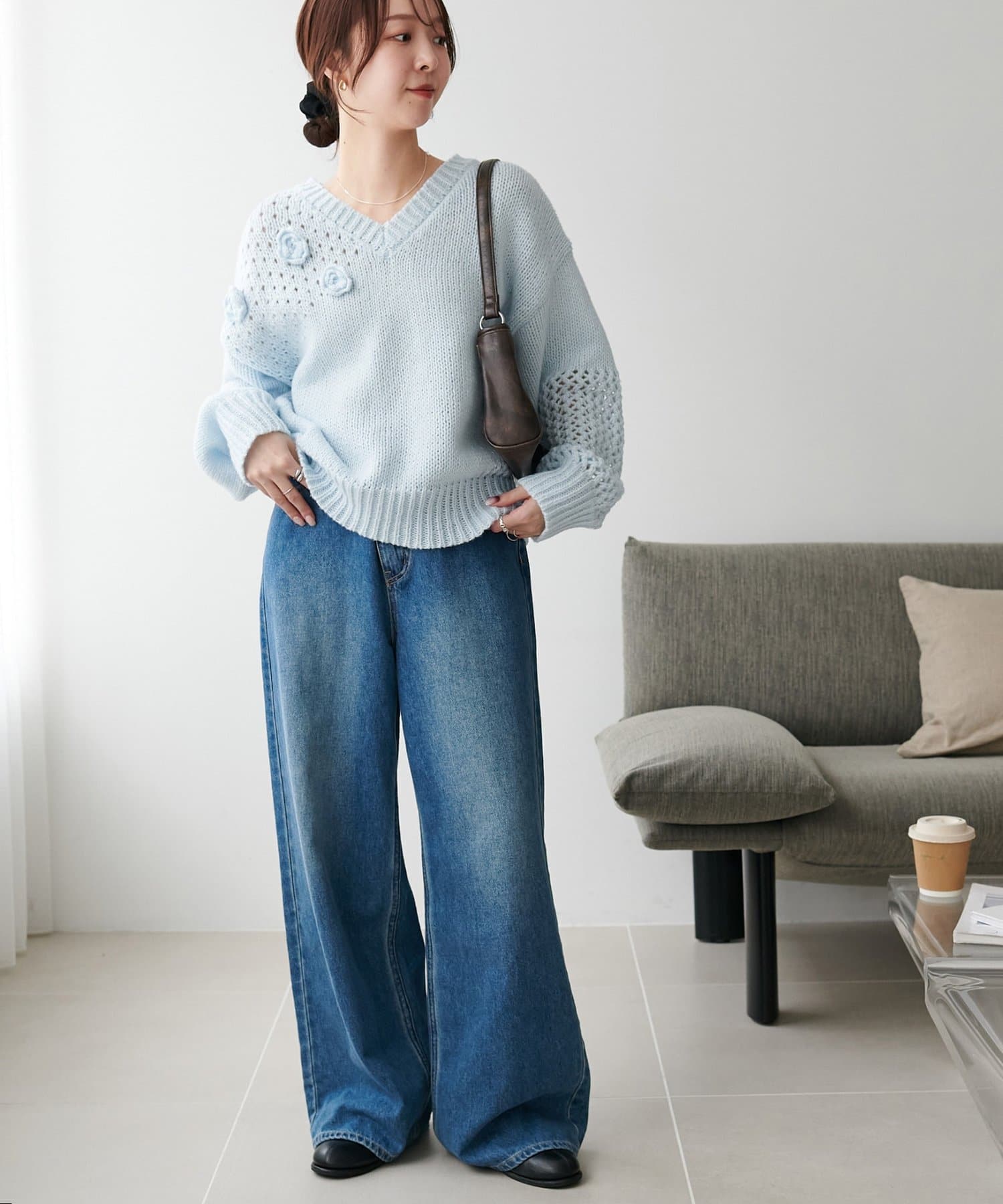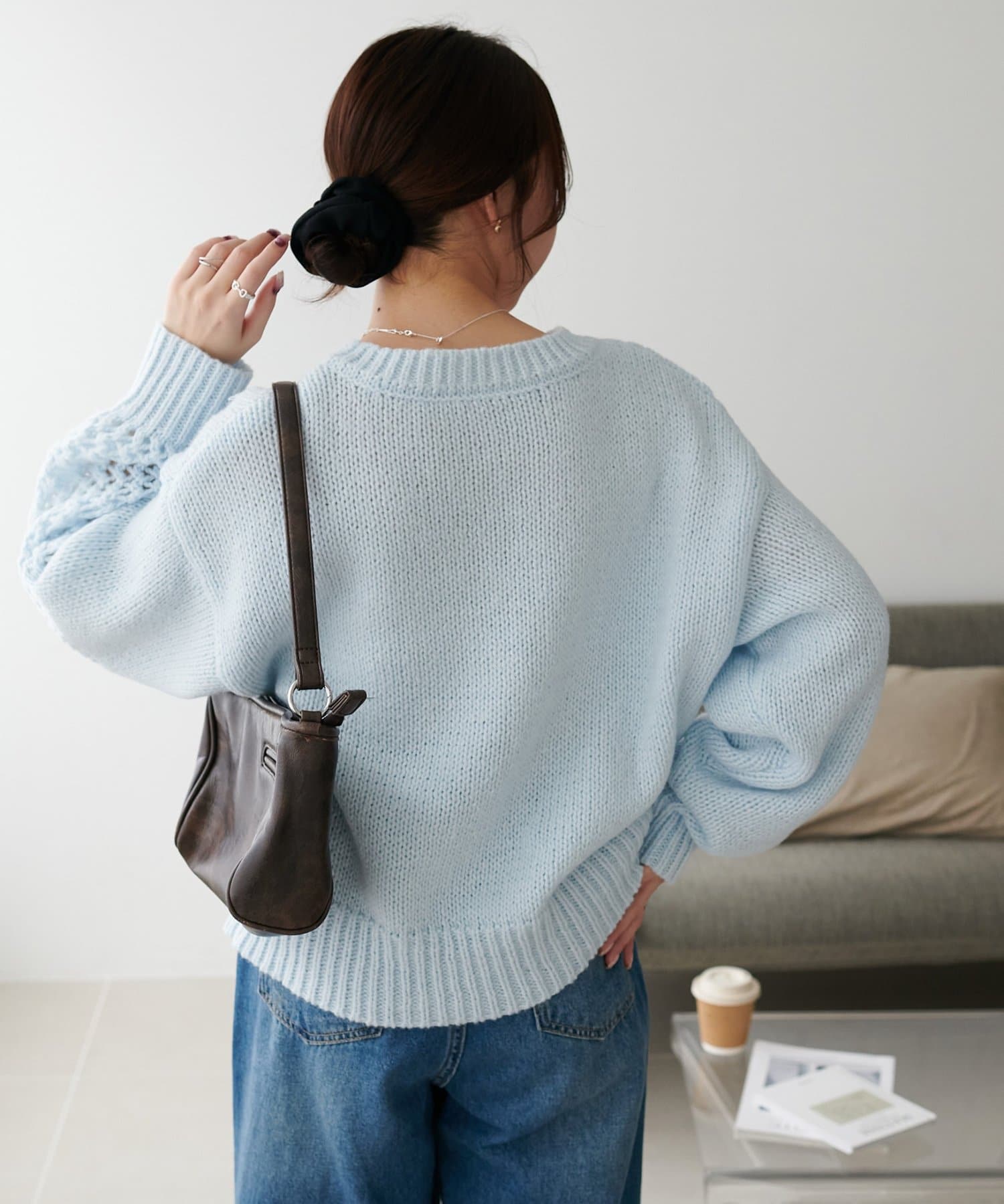 袖や肩部分には透かし編みを取り入れており、軽やかな抜け感を演出♪