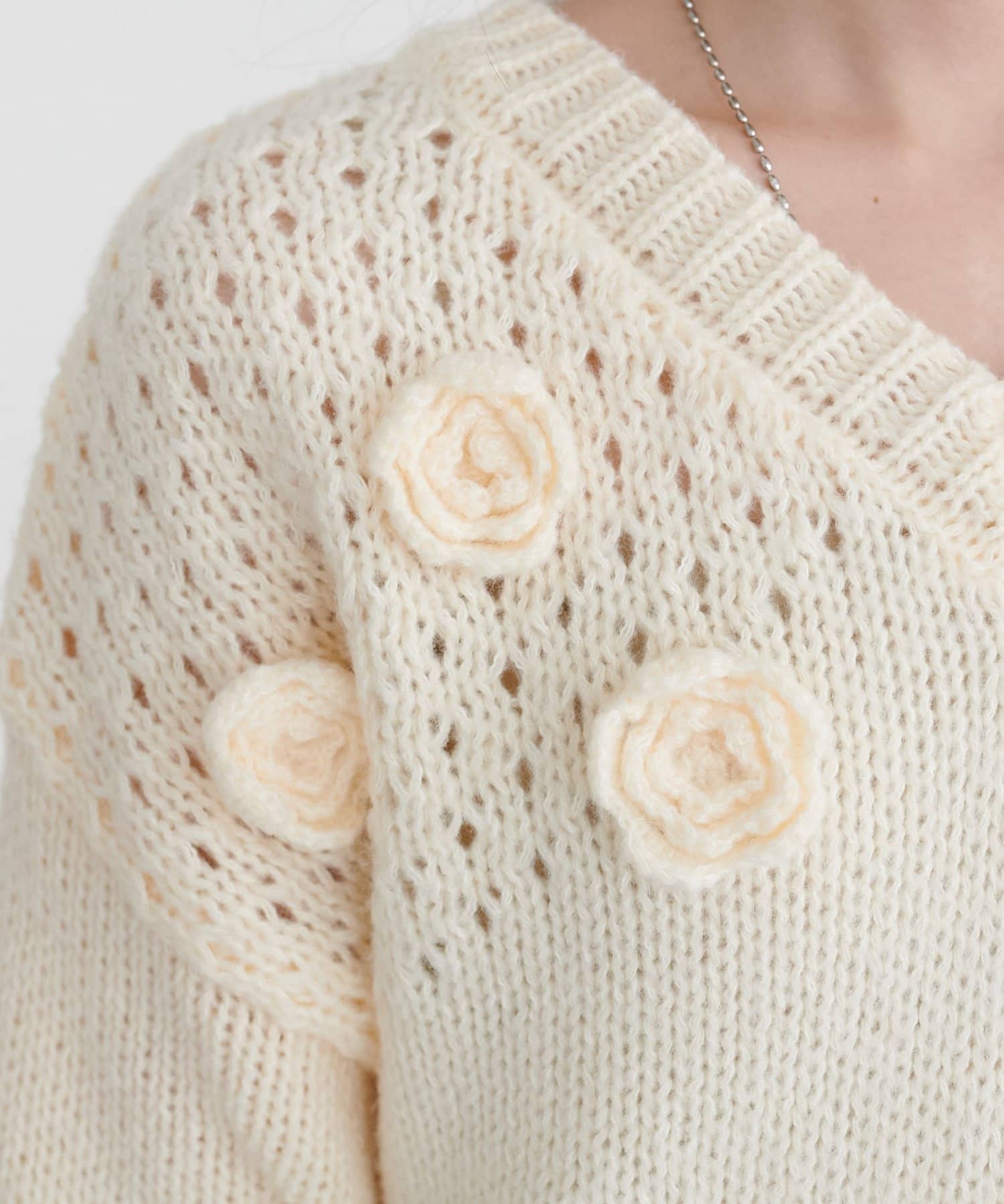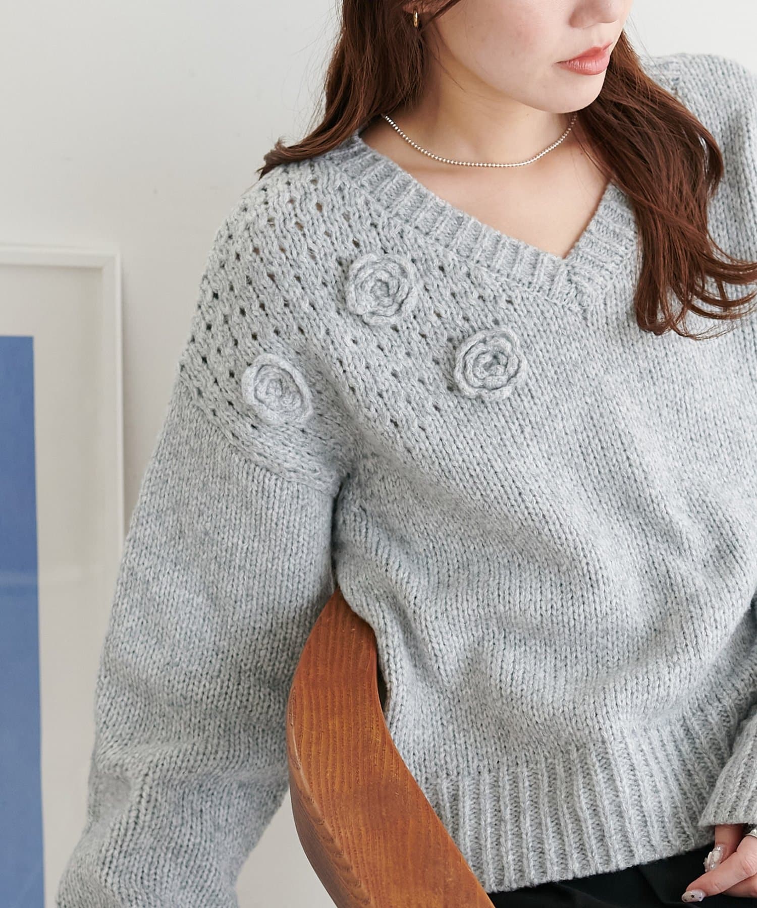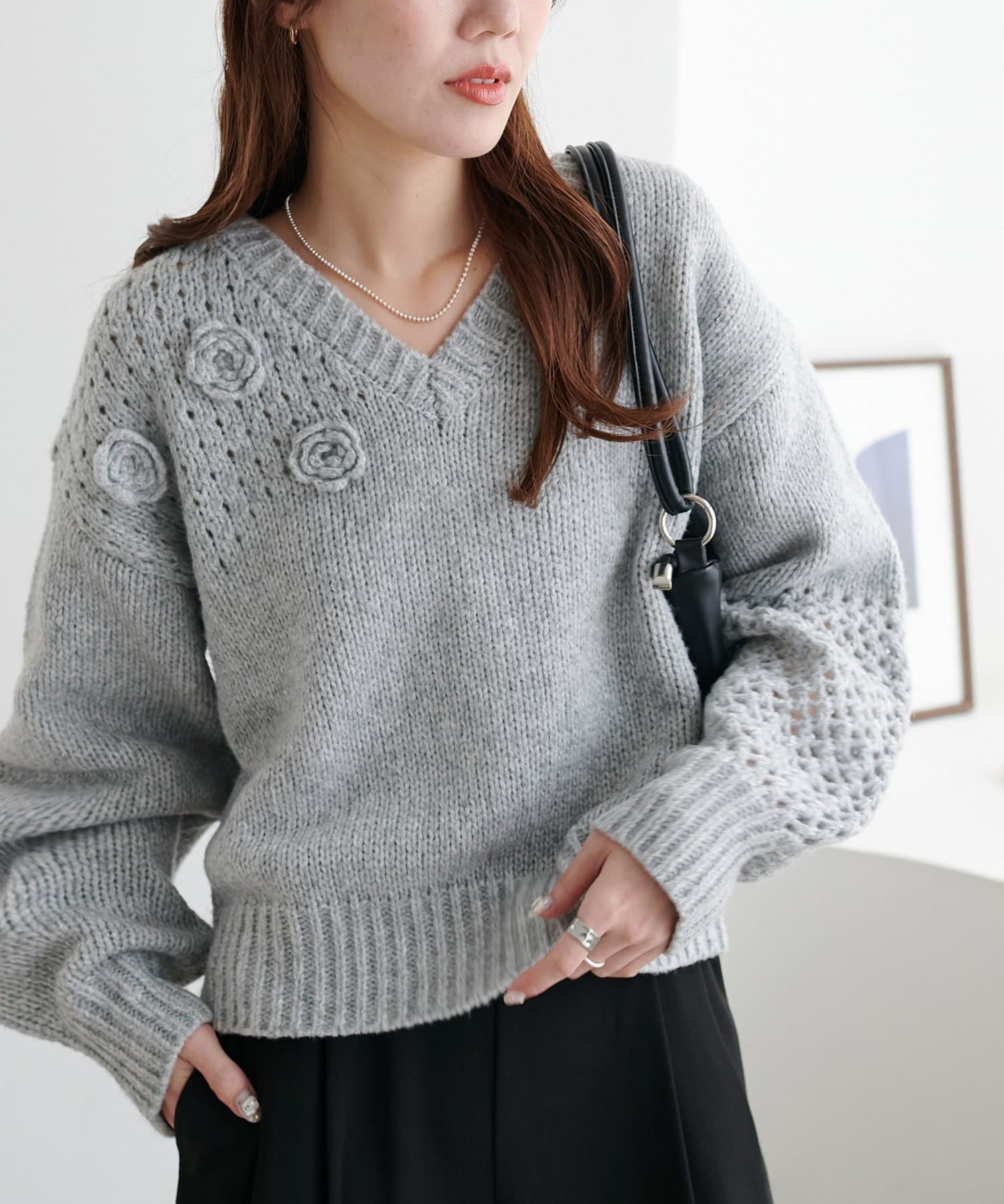 同色で編まれた小さなフラワーモチーフがアクセントになったプルオーバー!