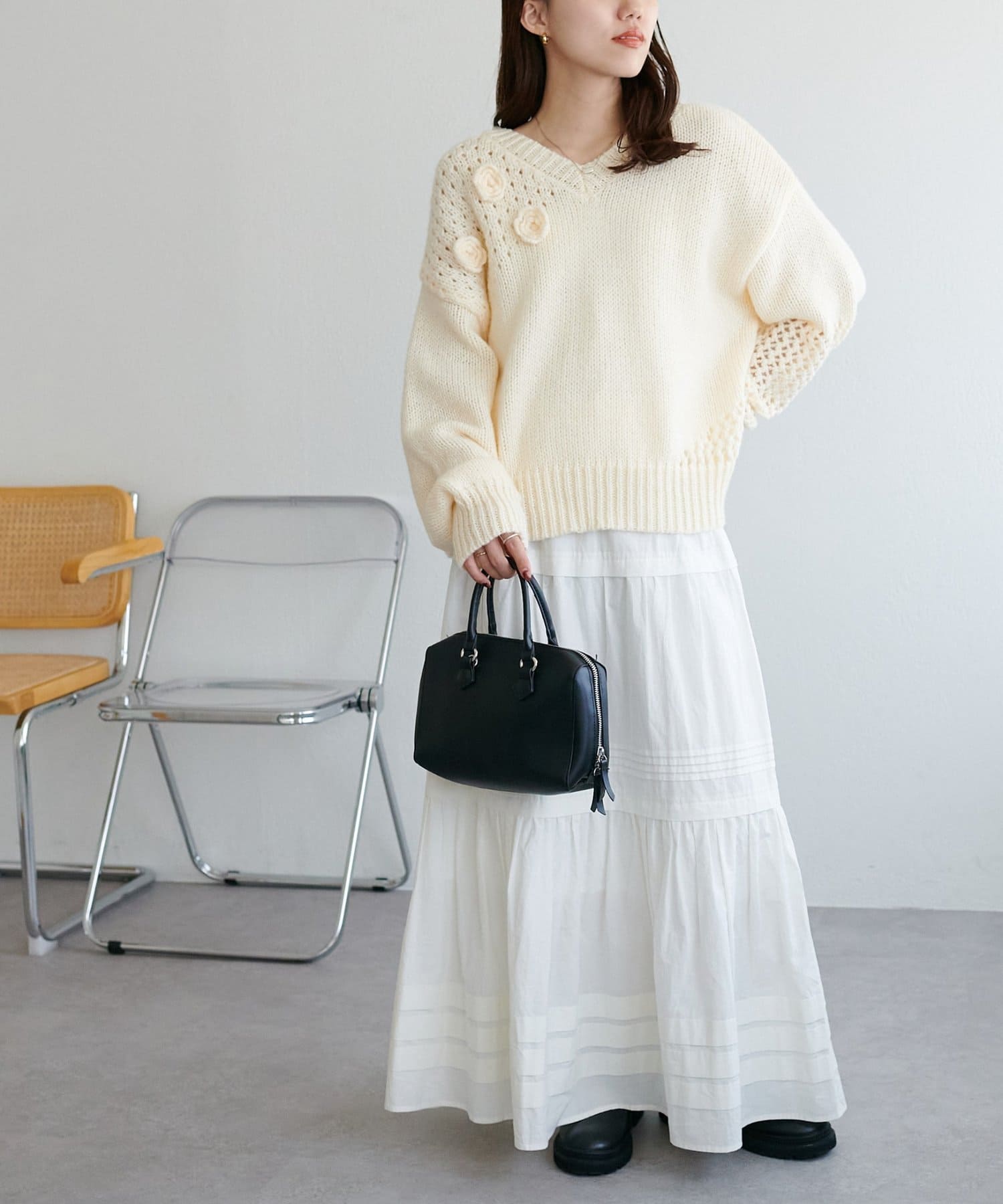 1枚で主役になるデザインなので、シンプルなボトムスと合わせるだけでも雰囲気のあるスタイリングが完成します◎