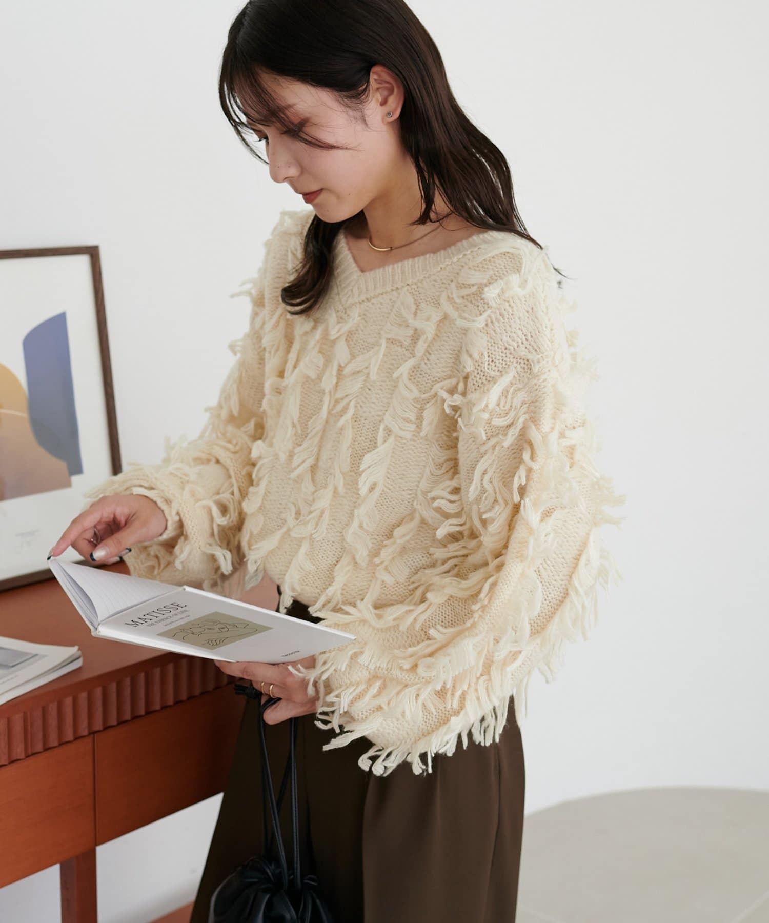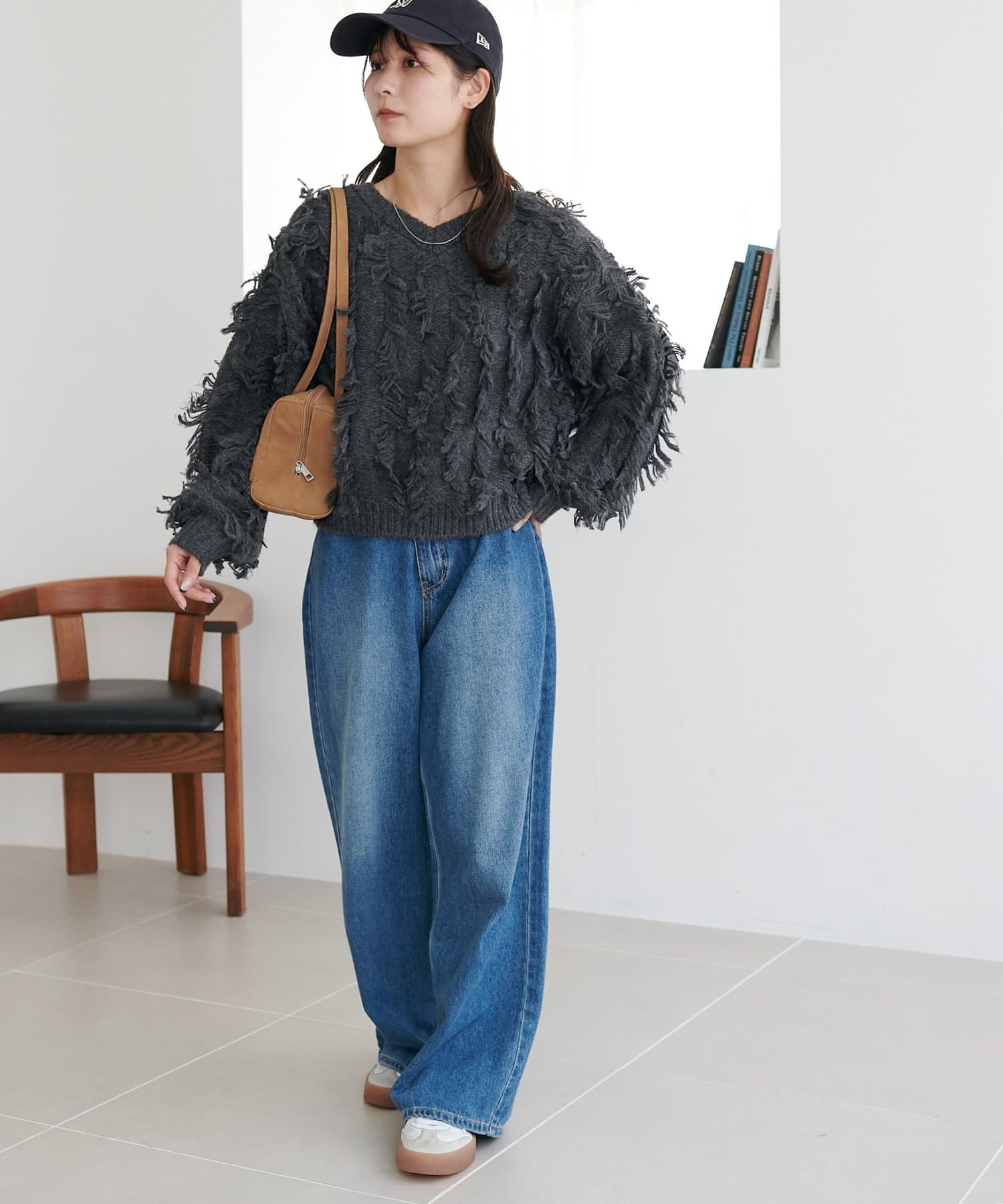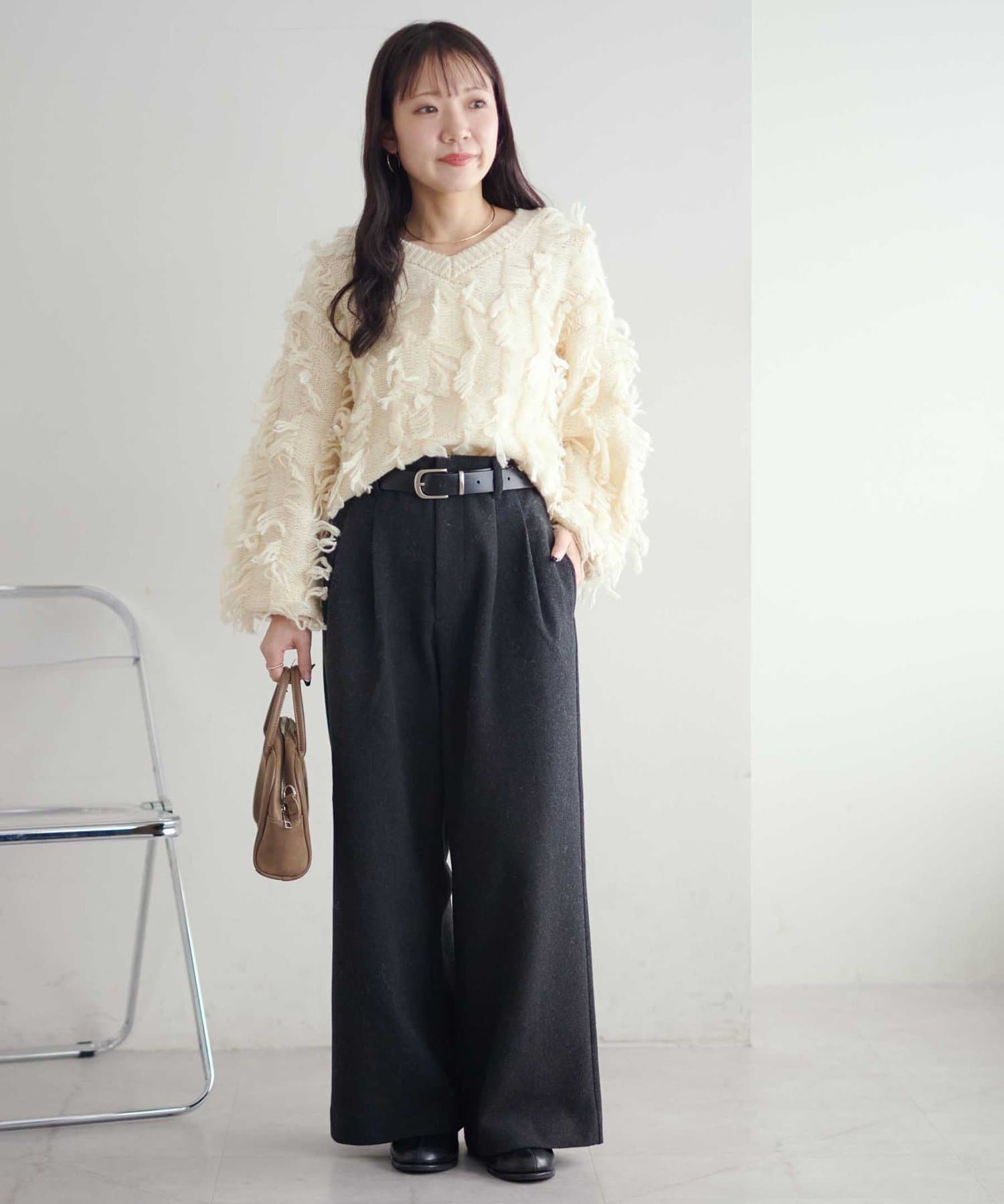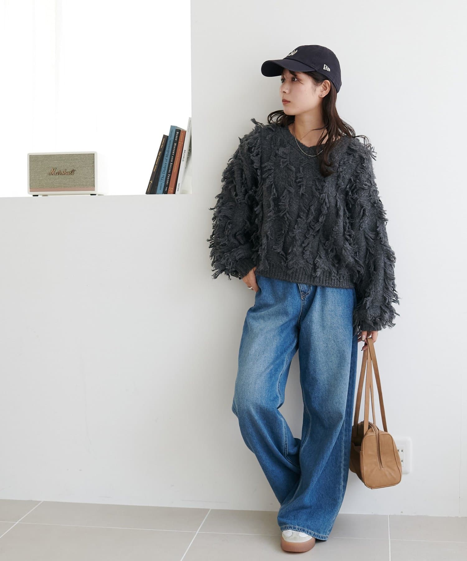 153cmスタッフ:フリンジのデザインがあることで、ボリューム感があるように思いますが、長すぎない着丈とvネックのデザインになっていることで抜け感があります◎
