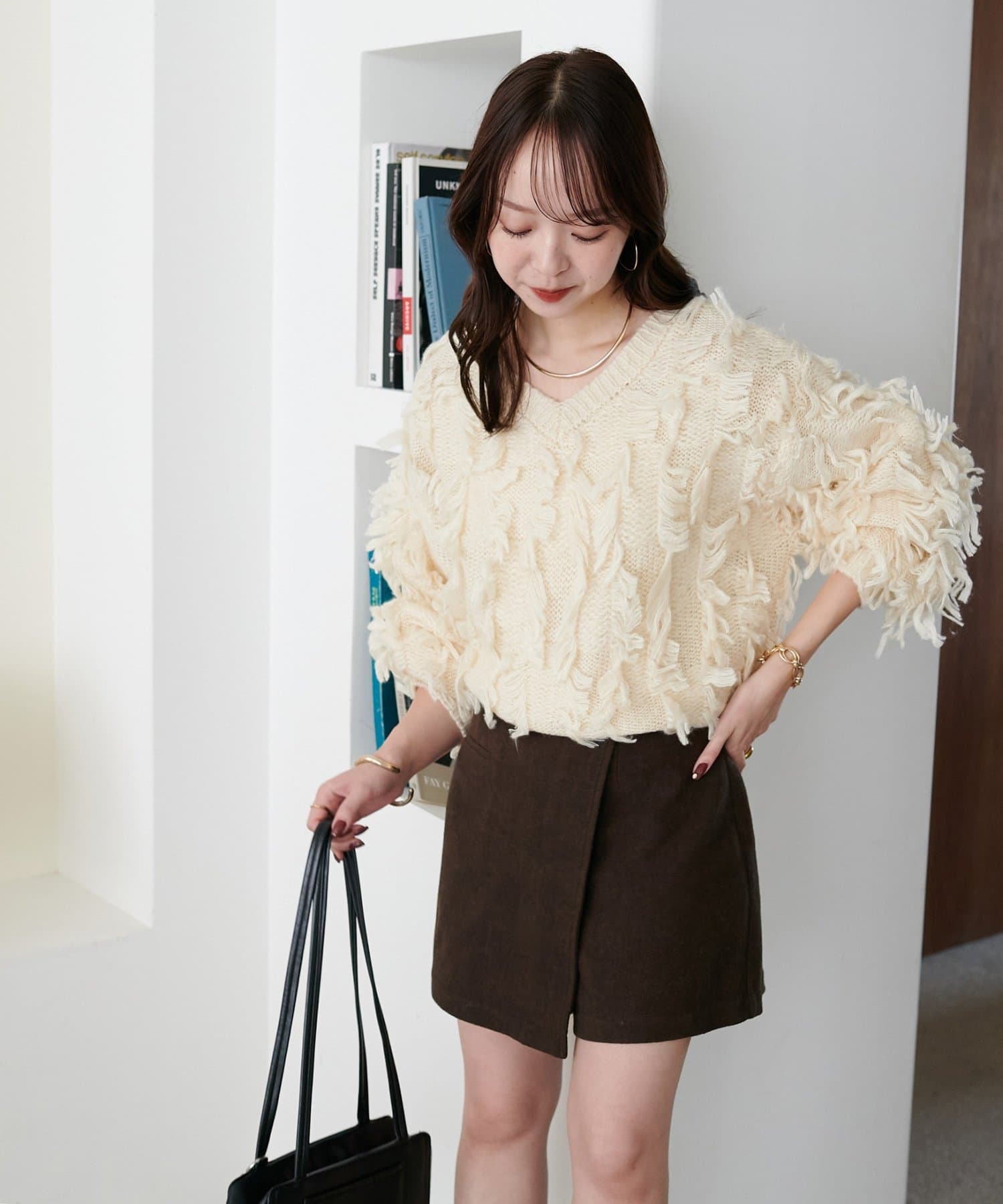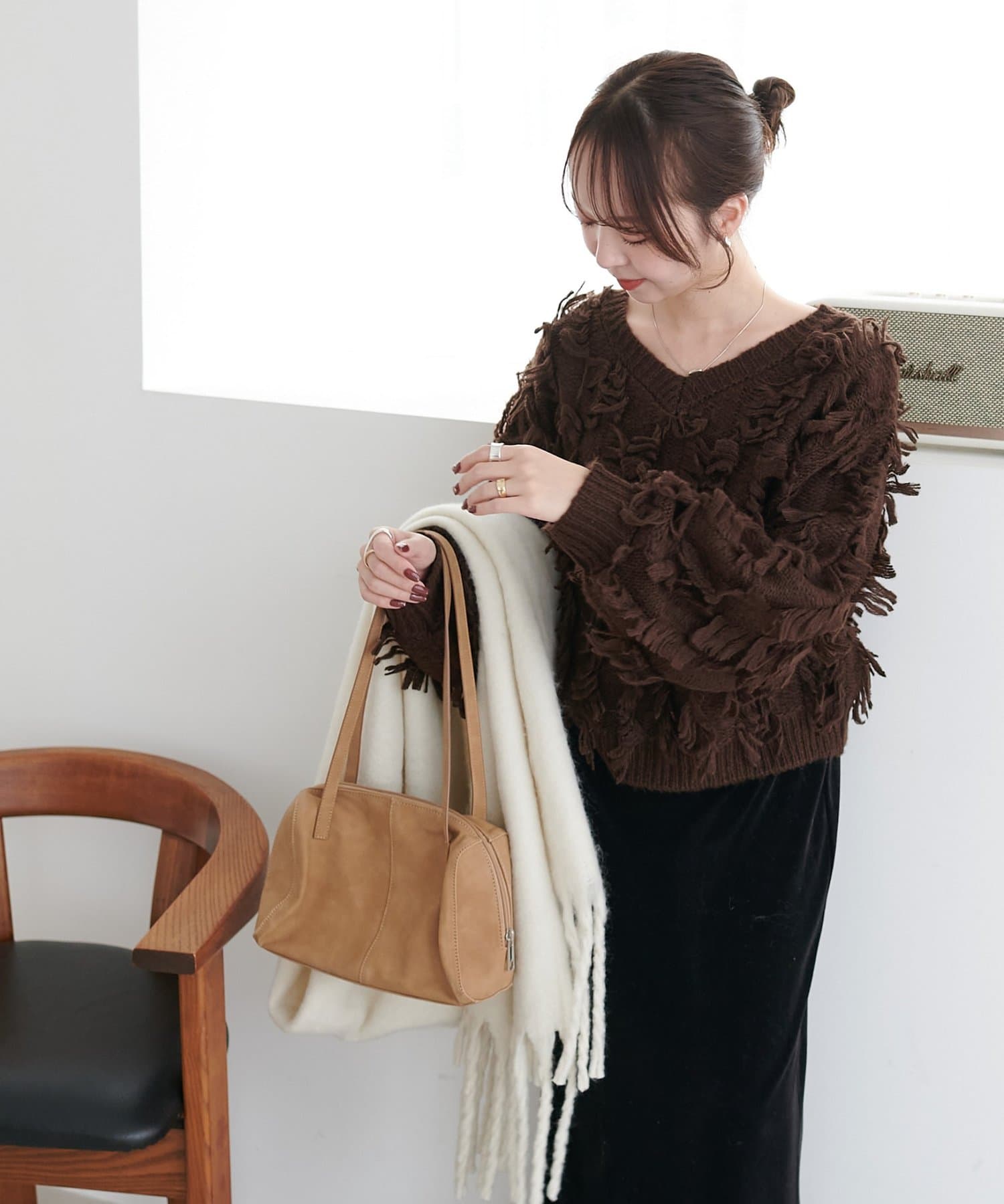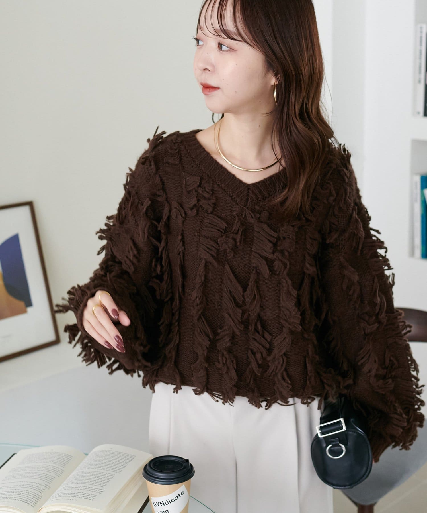 153cmスタッフ:フリンジのデザインがあることで、ボリューム感があるように思いますが、長すぎない着丈とvネックのデザインになっていることで抜け感があります◎