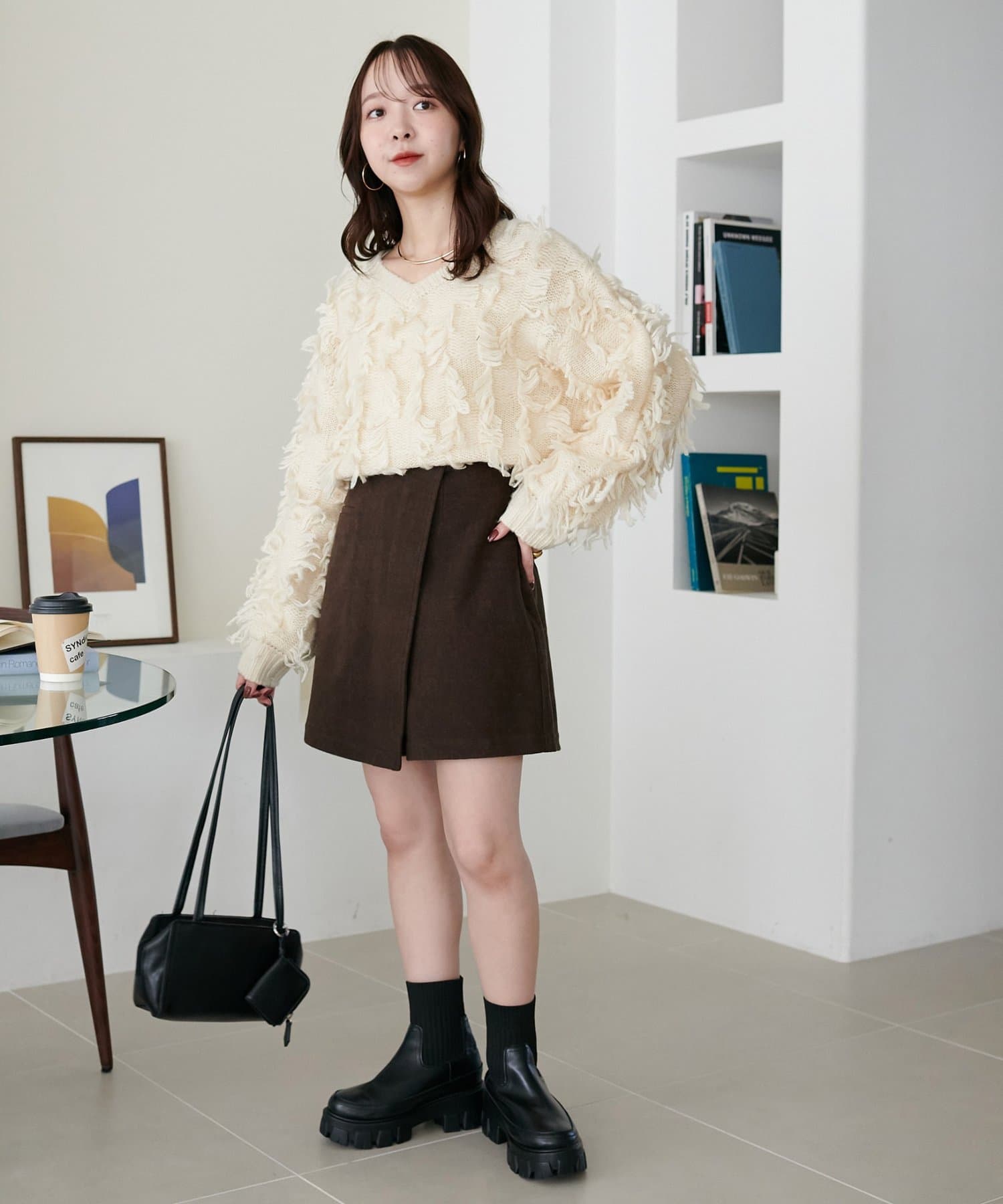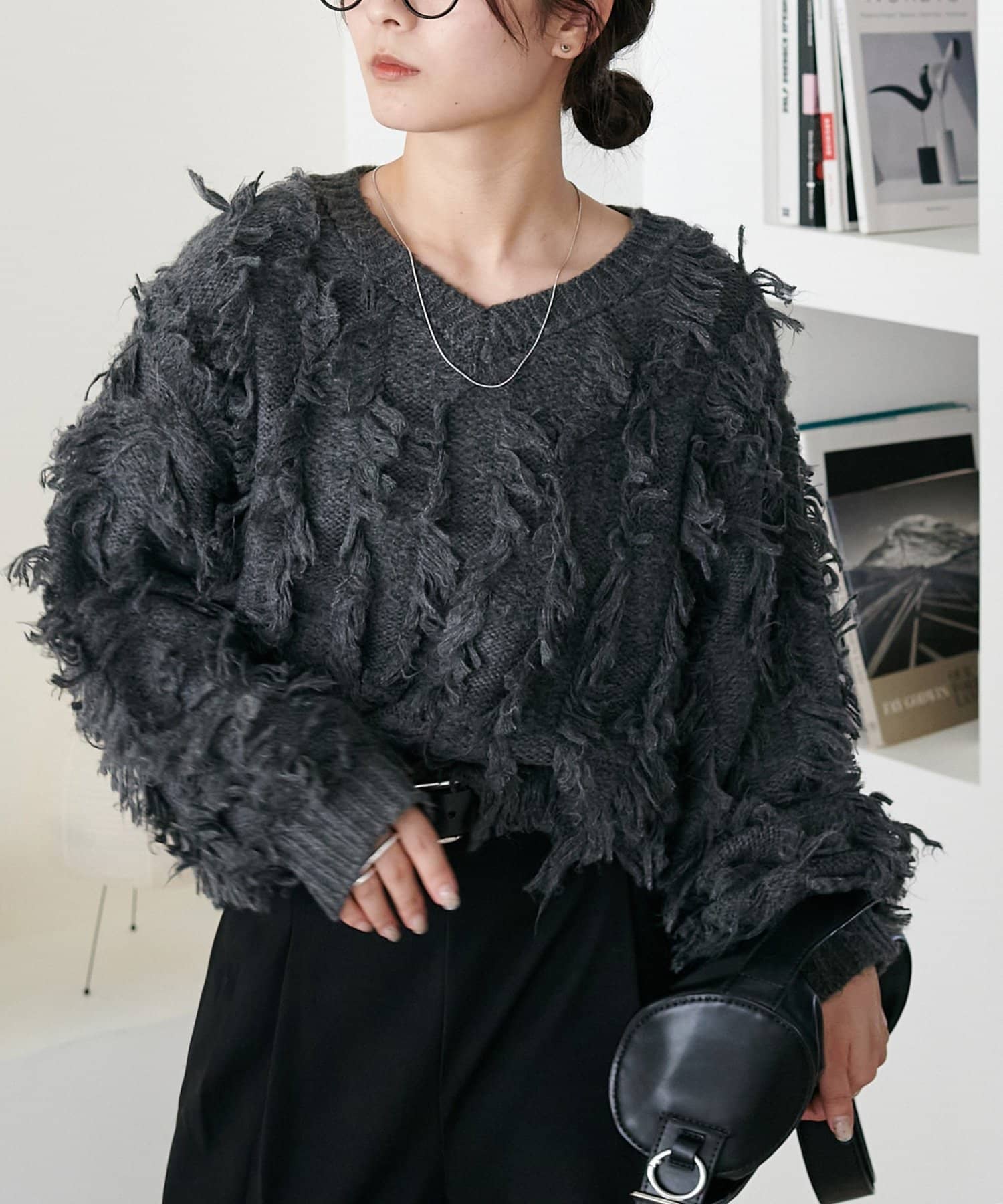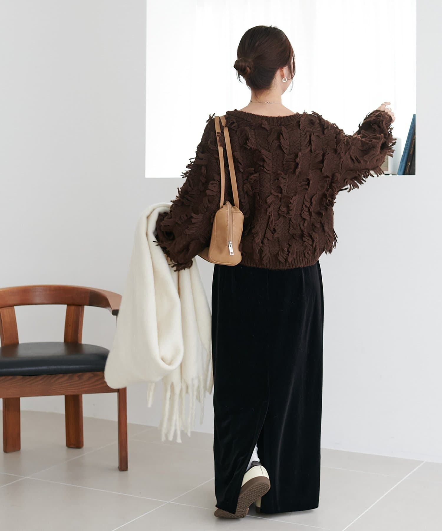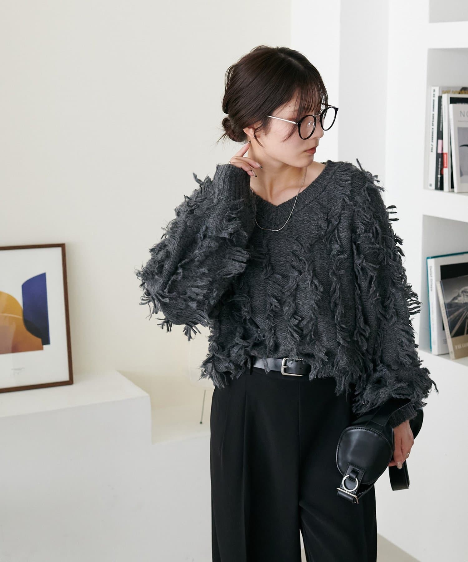 153cmスタッフ:フリンジのデザインがあることで、ボリューム感があるように思いますが、長すぎない着丈とvネックのデザインになっていることで抜け感があります◎
