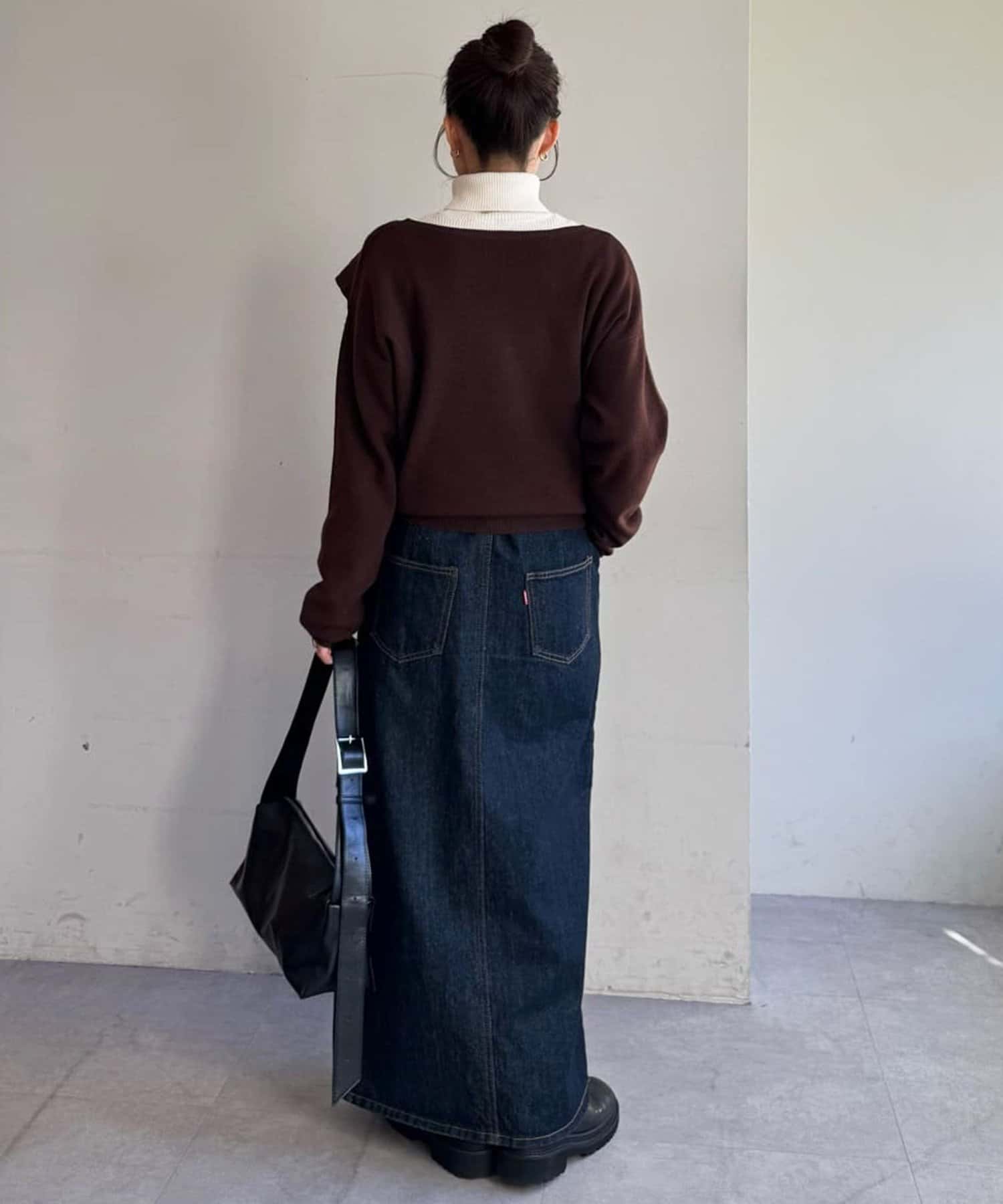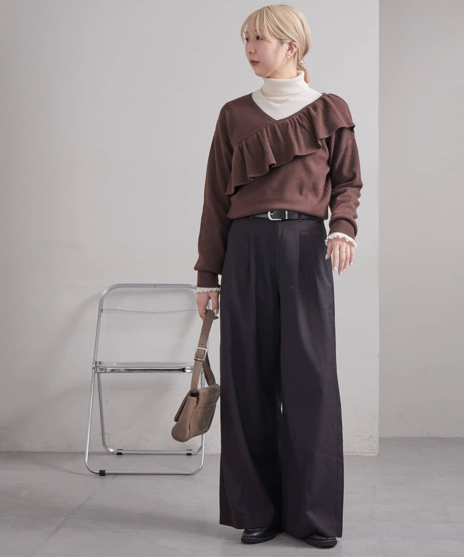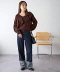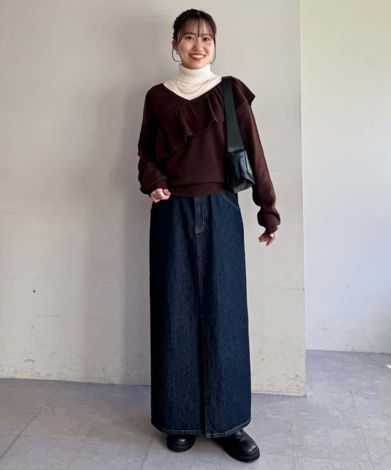 vネックなので、インナーにタートルネックを合わせて暖かさをUPするのもおすすめ!
