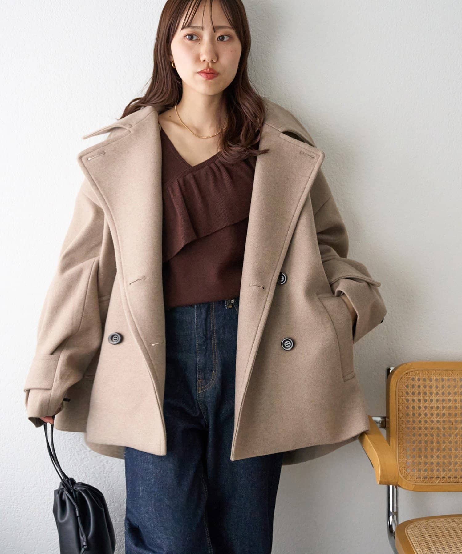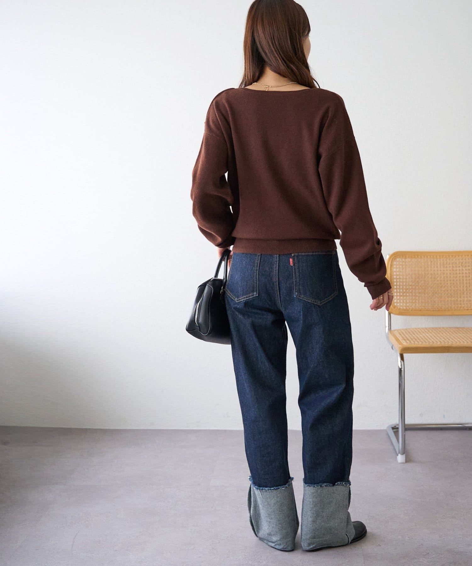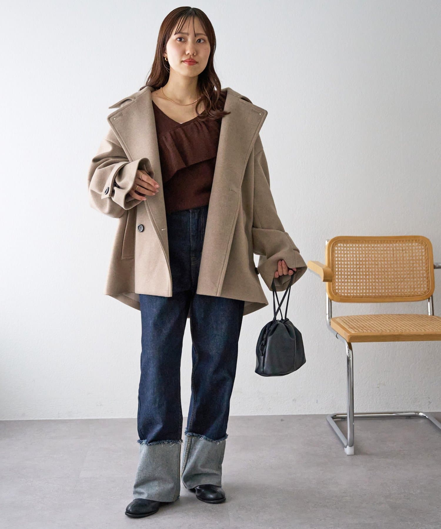 vネックなので、インナーにタートルネックを合わせて暖かさをUPするのもおすすめ!