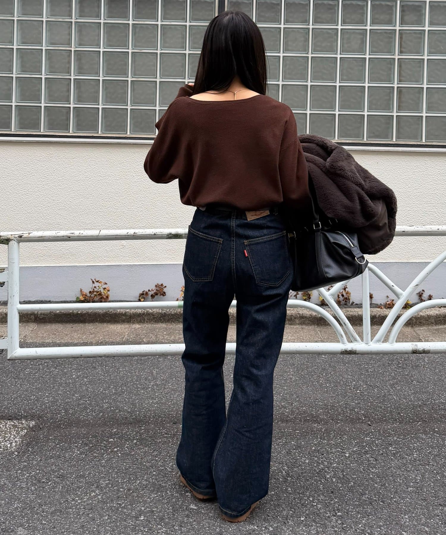 ・ストレートなシルエットを合わせるとメリハリのあるコーデに。