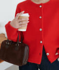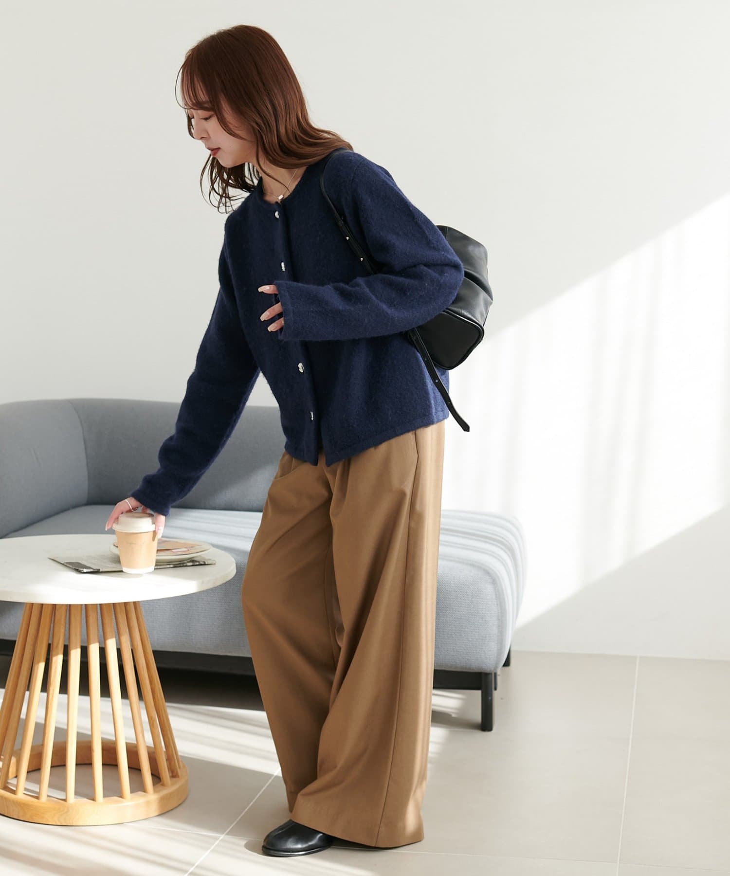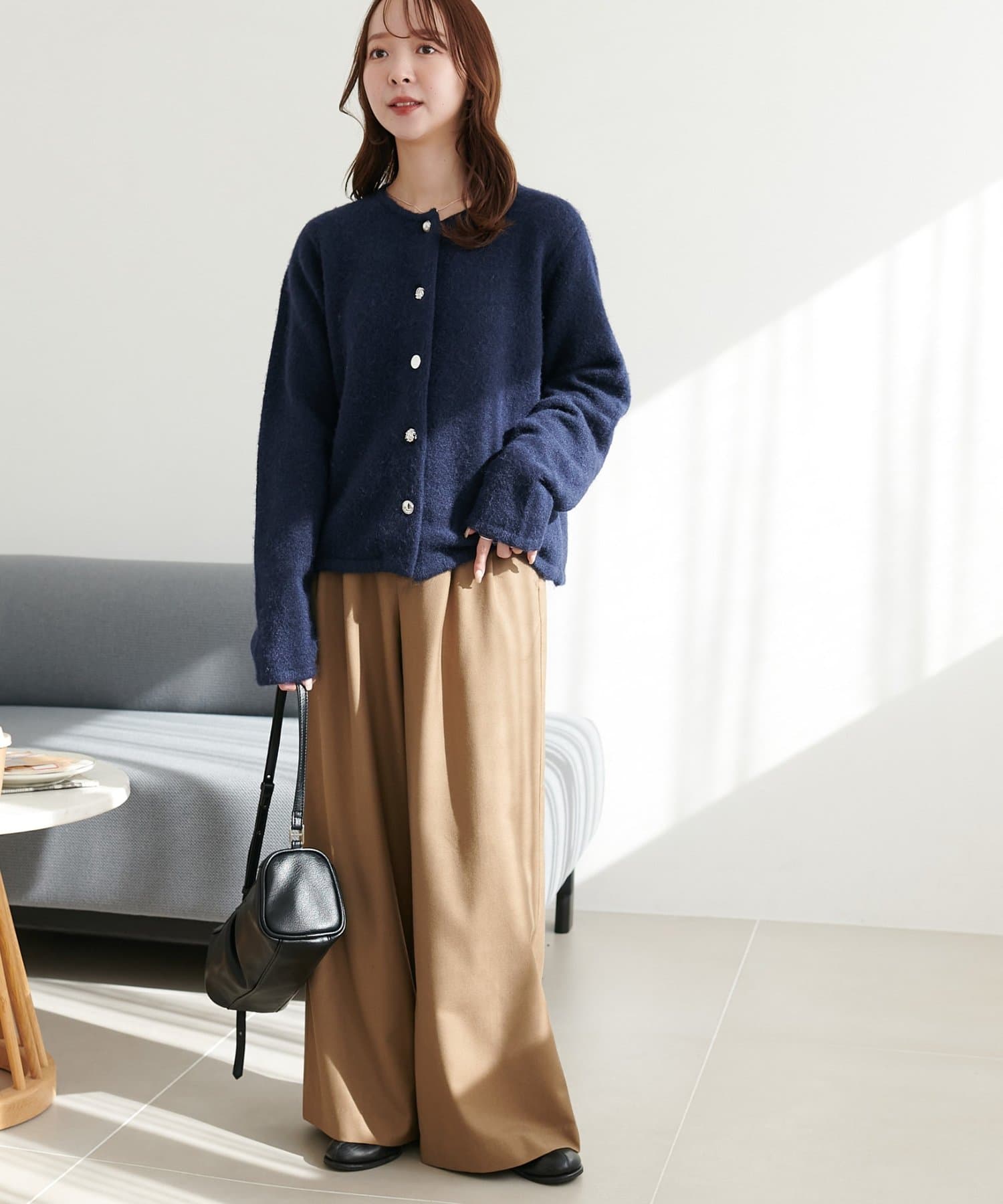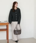 ・女性らしいスカートやワンピースと合わせることで、カーディガンの柔らかな表情がより引き立ち、やさしい雰囲気のスタイルに。