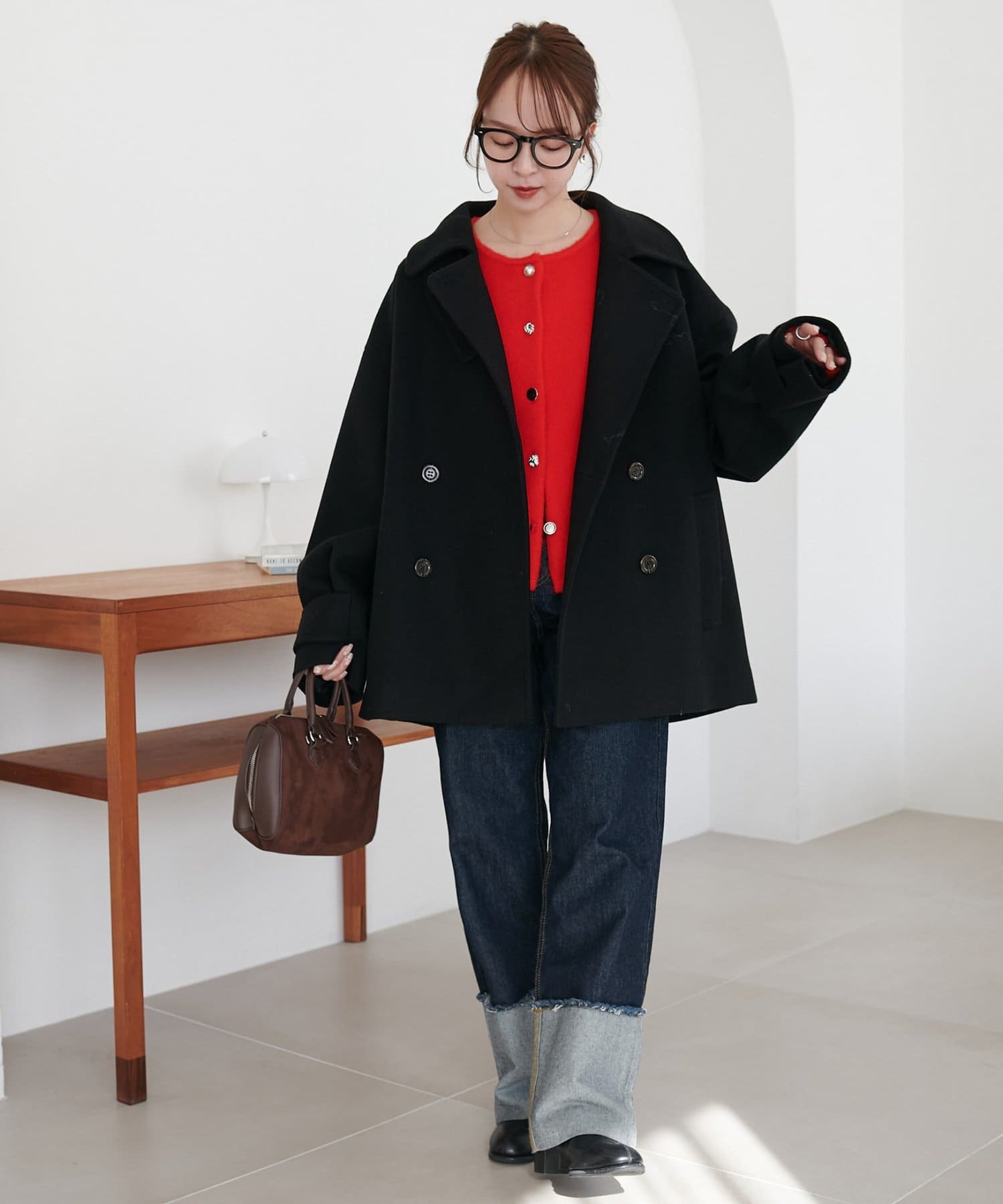 153cmスタッフ:手の甲までしっかりと隠れる袖丈です。全体的に程よいゆとりがあり、インナーにタートルやTシャツを重ねてももたつきません。