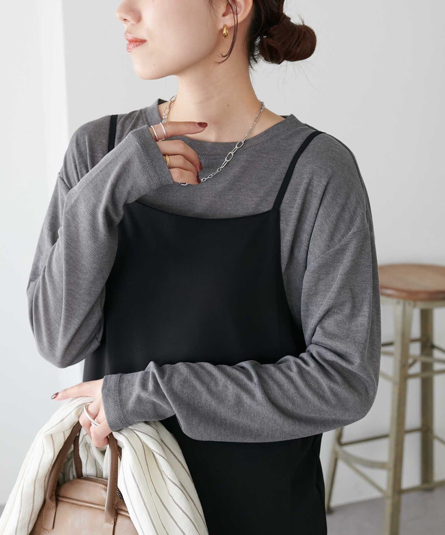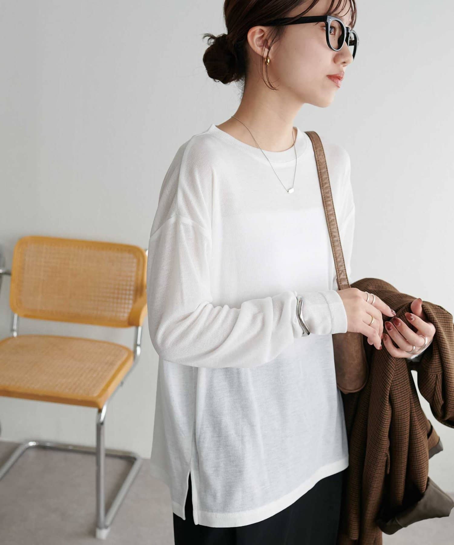 ほんのりと透け感があるデザインは、インナーとしても一枚着としても着てもヘルシーな印象に!
