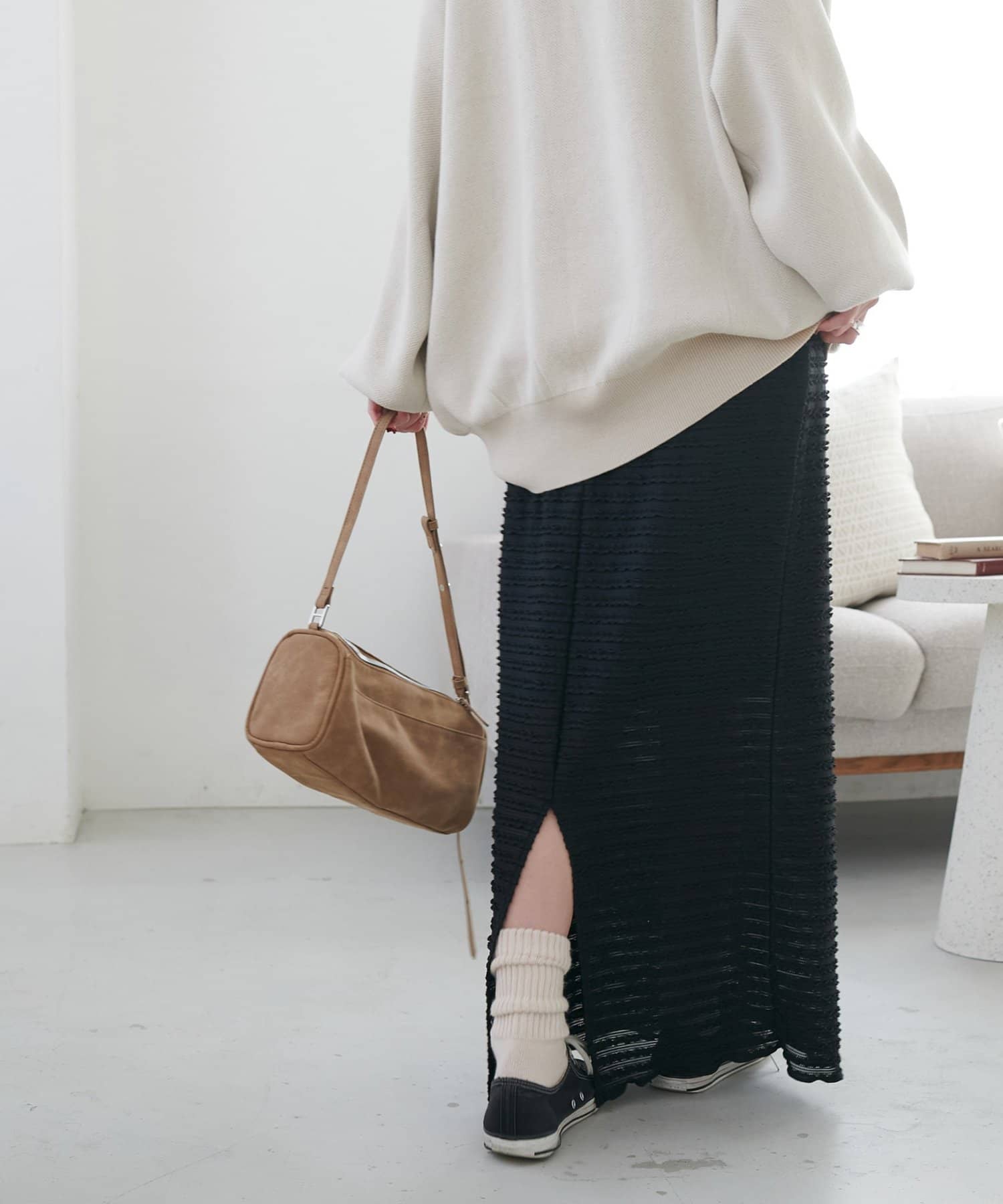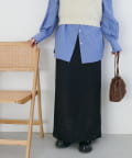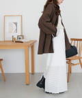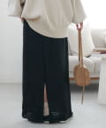 158cmスタッフ:足首が隠れる丈感で、フラットシューズでも引きずらずに着用できました。ナローシルエットですが、素材に表情があるので重たく見えにくいです◎