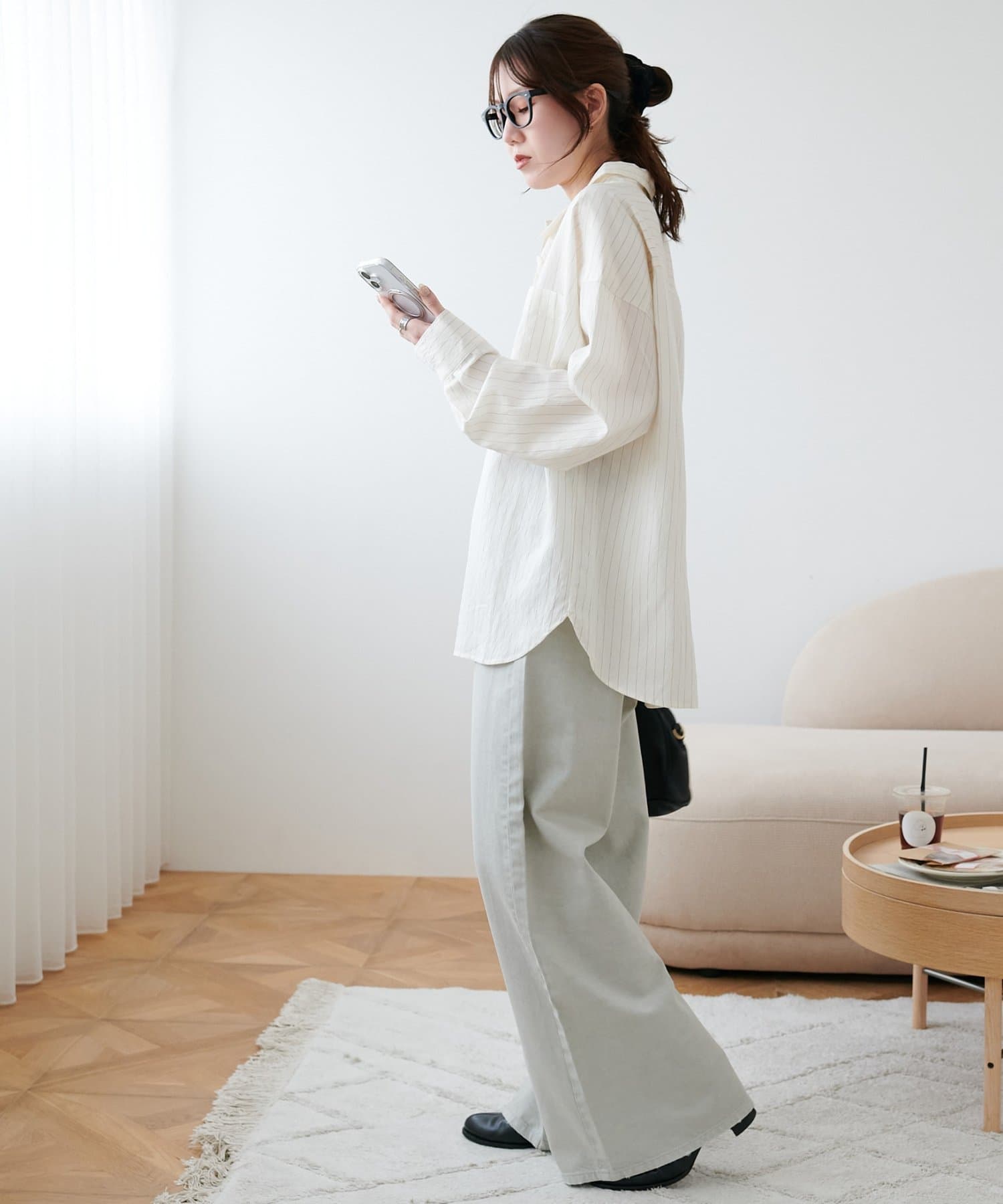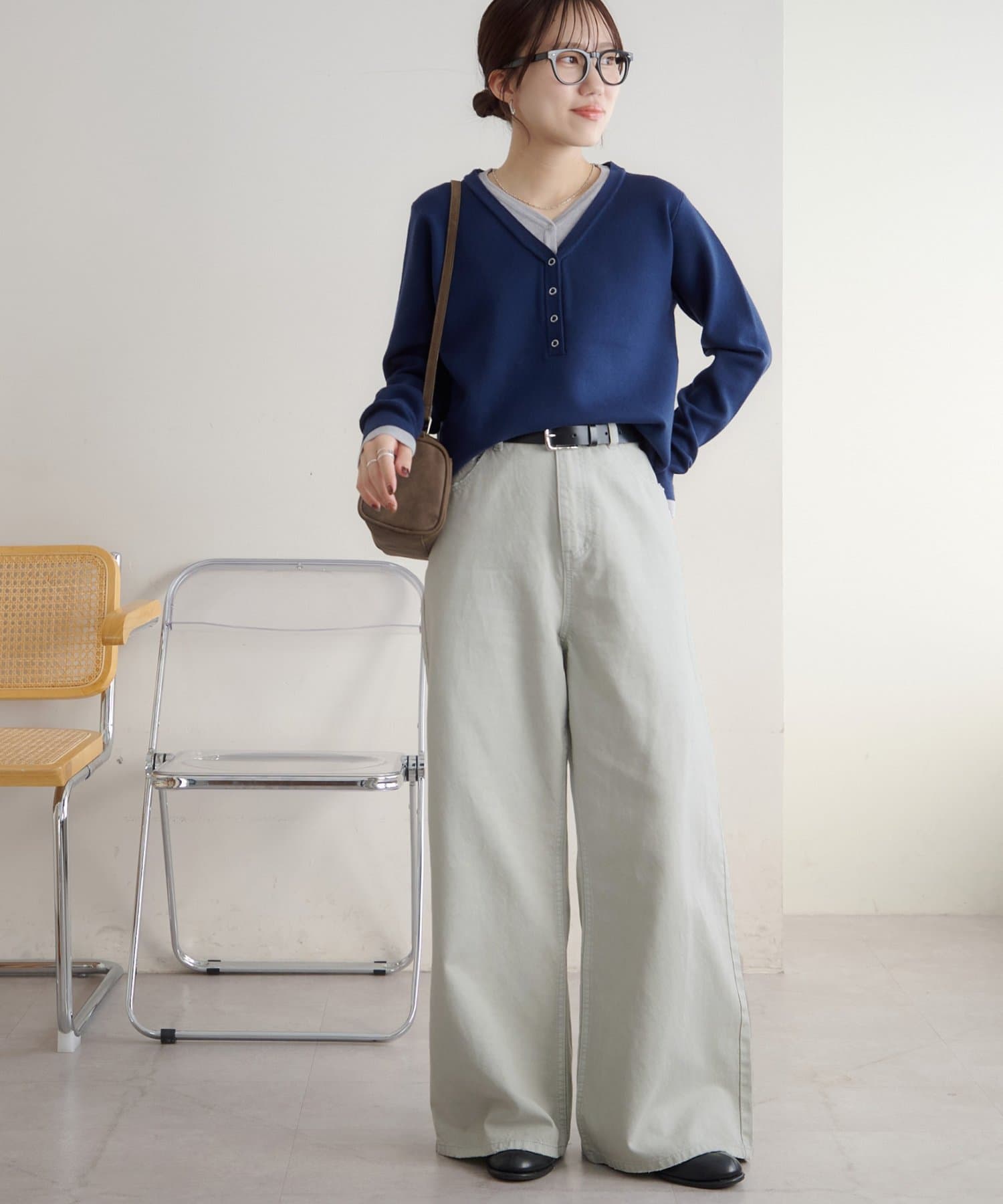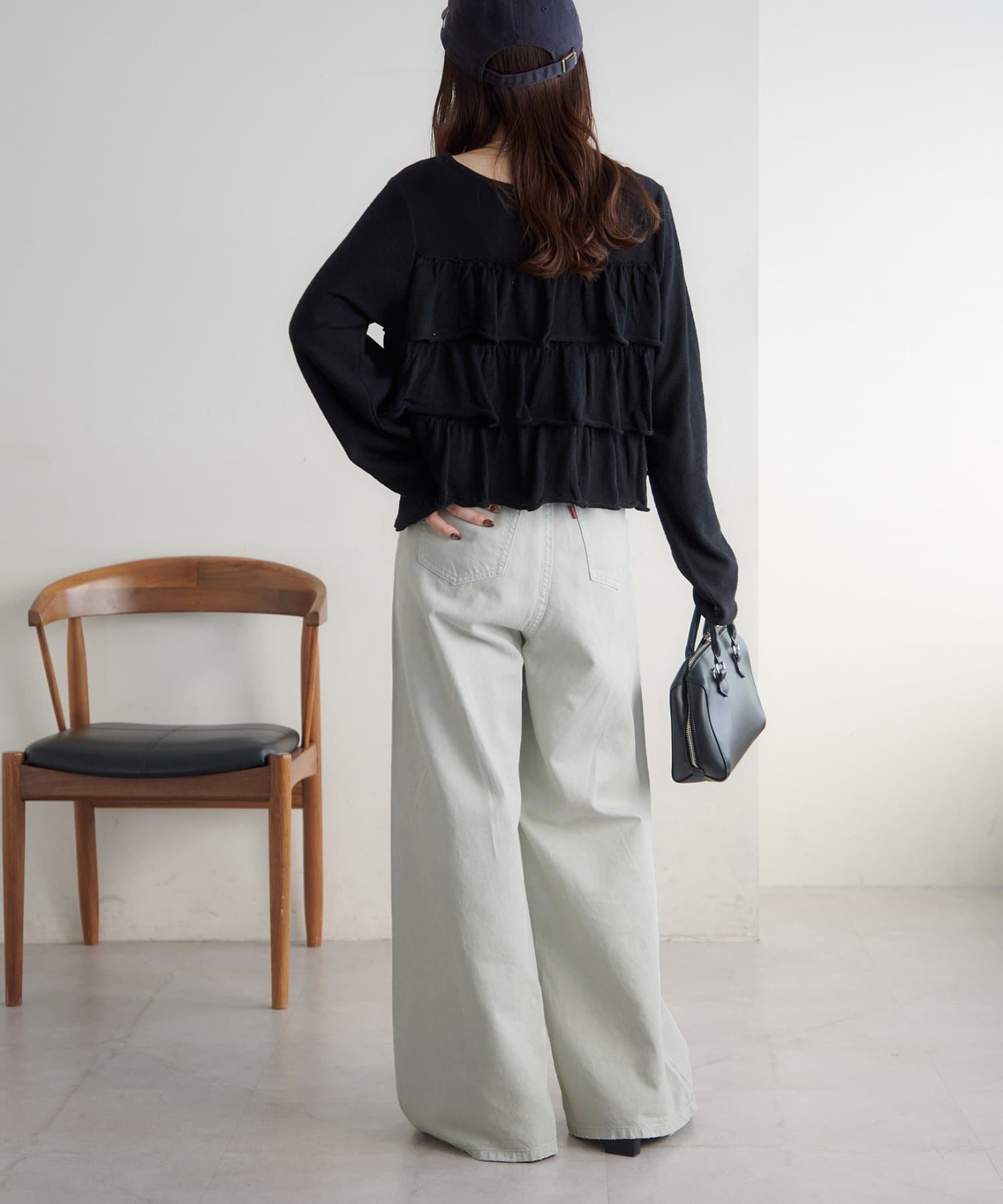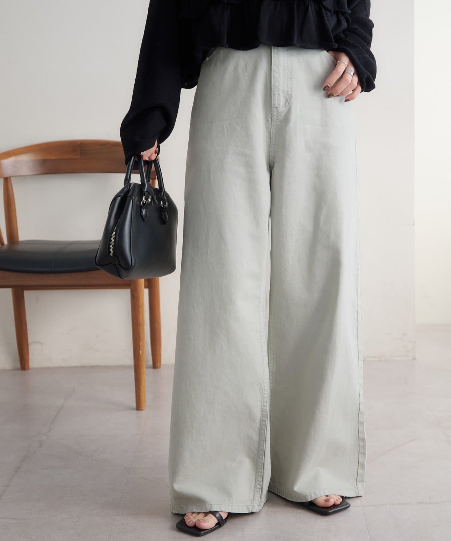 153cmスタッフ(Sサイズ着用):少し太めのフレアシルエットはこなれ感が出ます!コンパクトな着丈のトップスと合わせると腰回りがスッキリと見えて、足長効果もあるコーデになるのでおすすめです♪