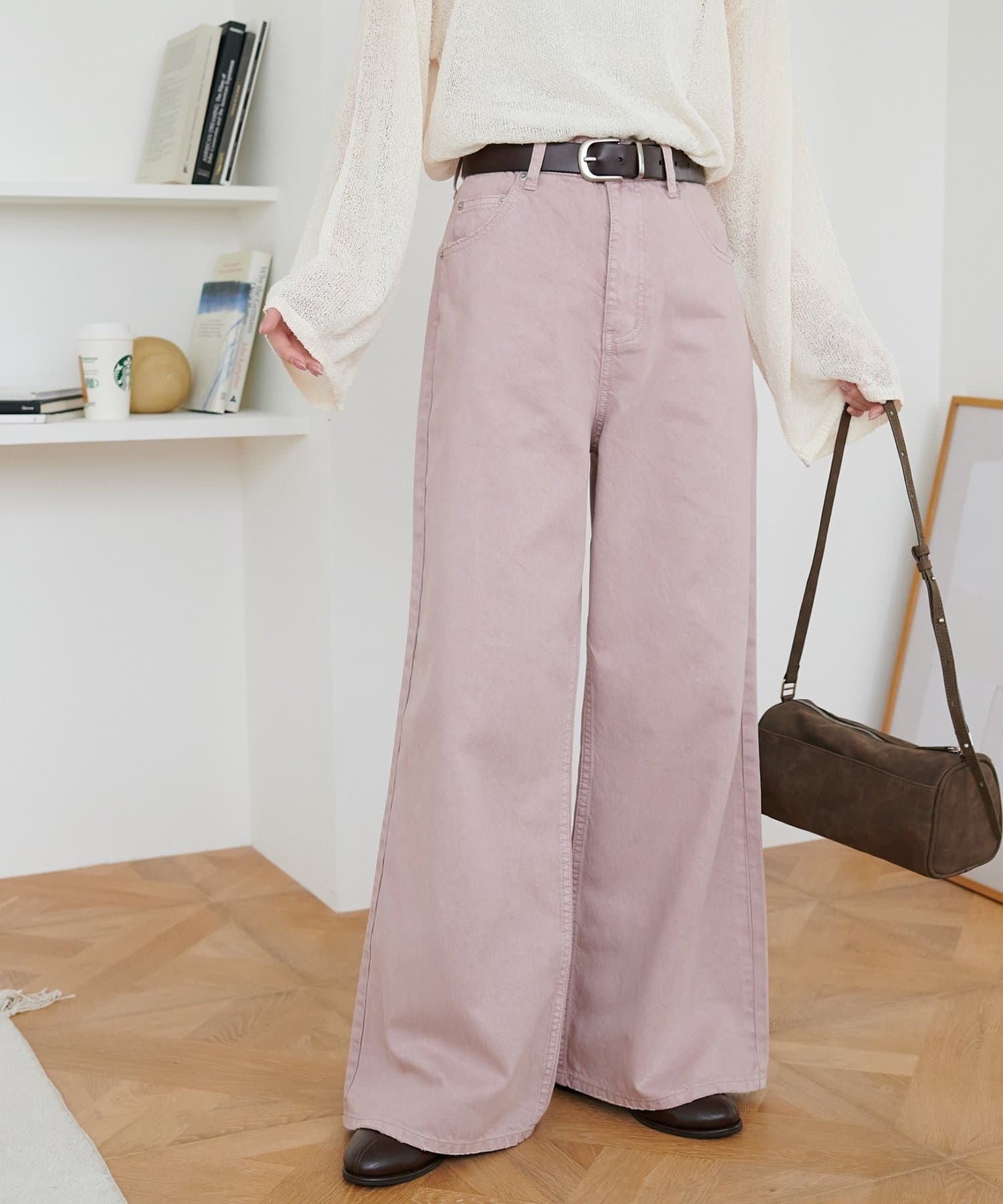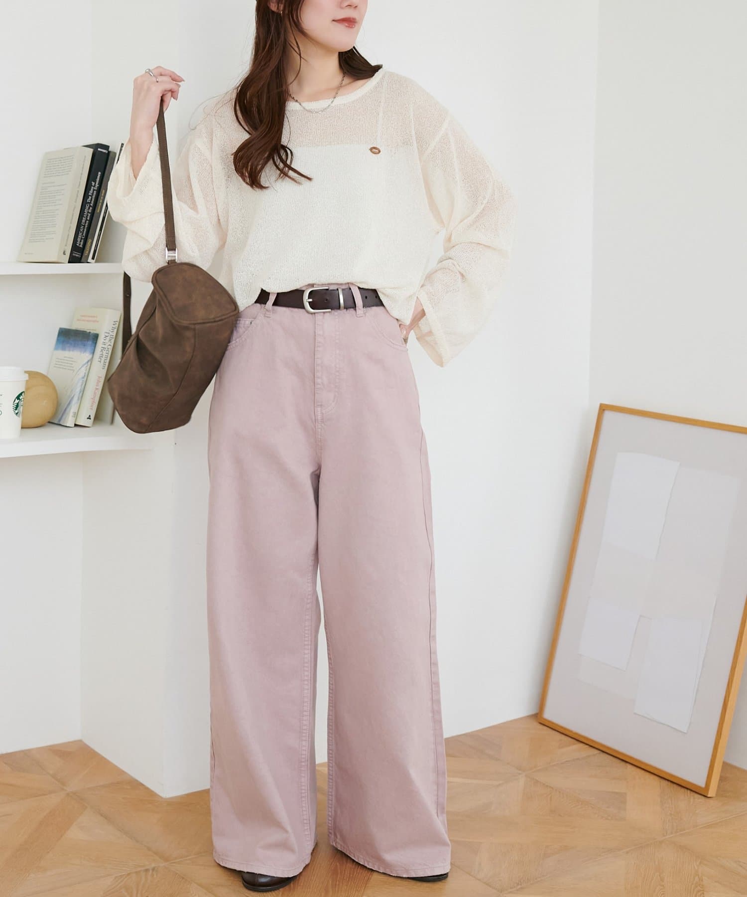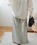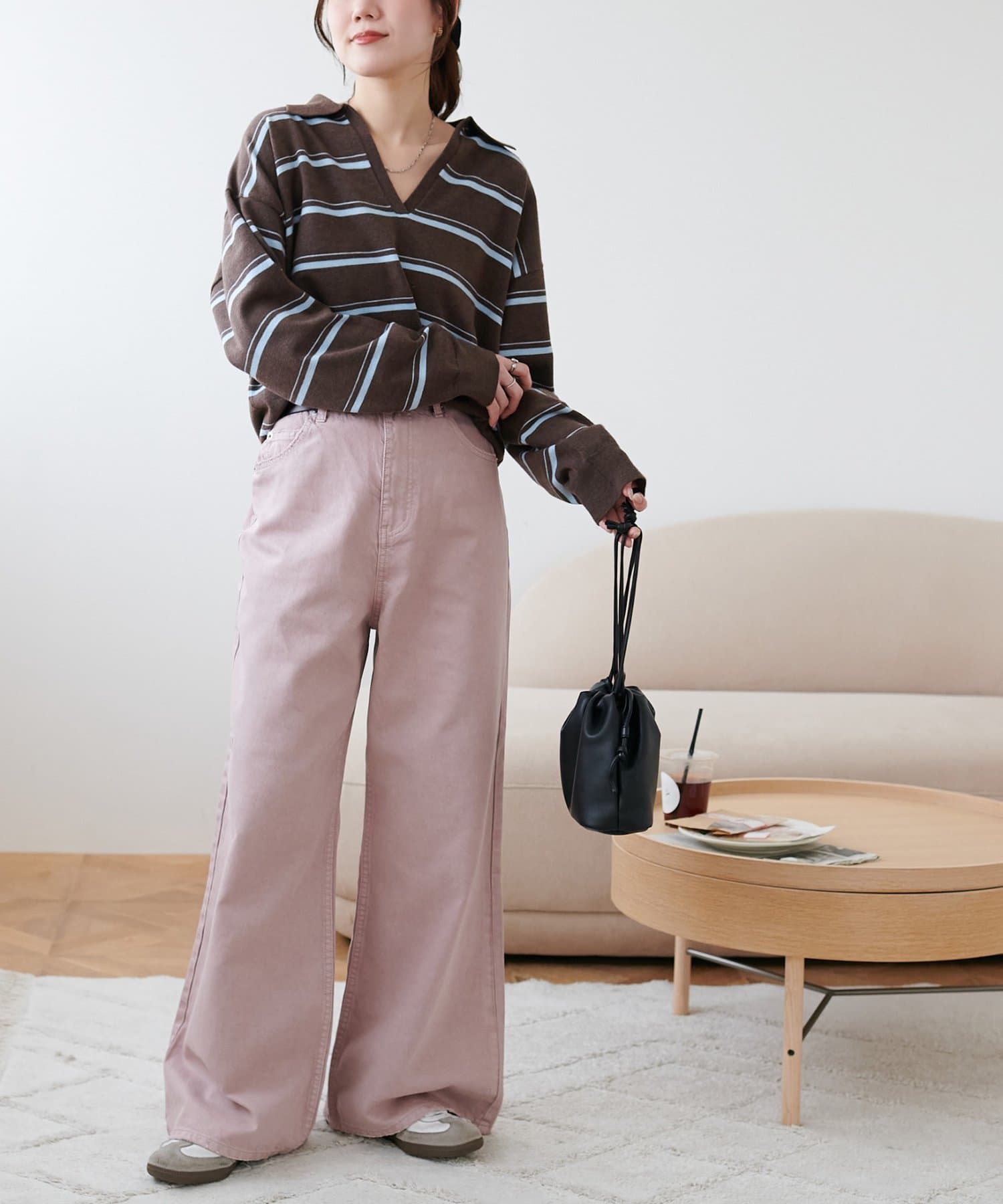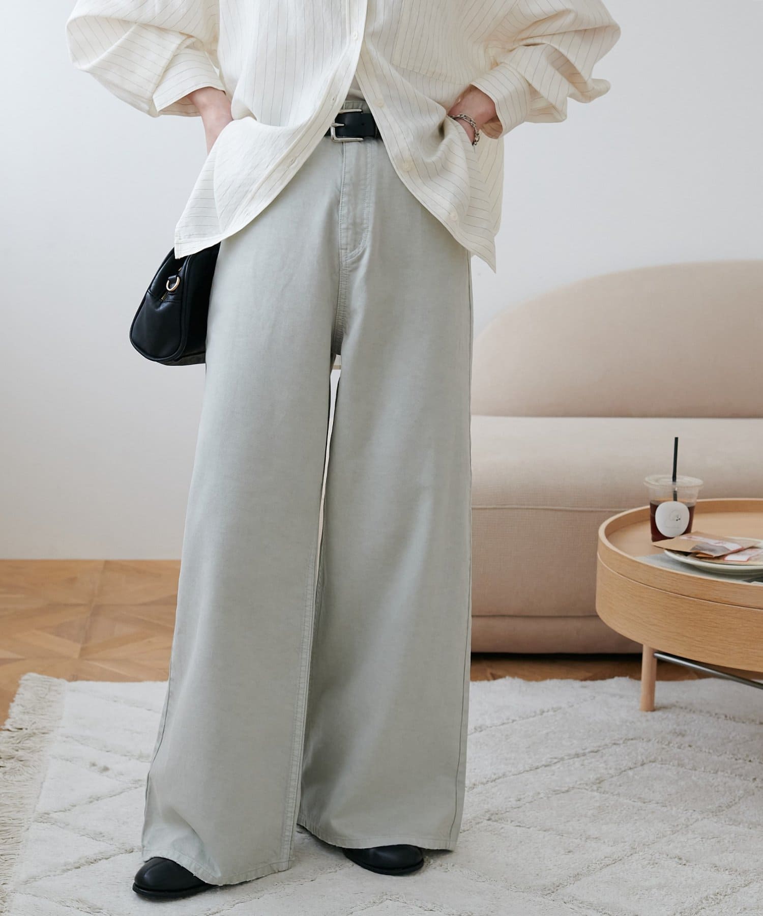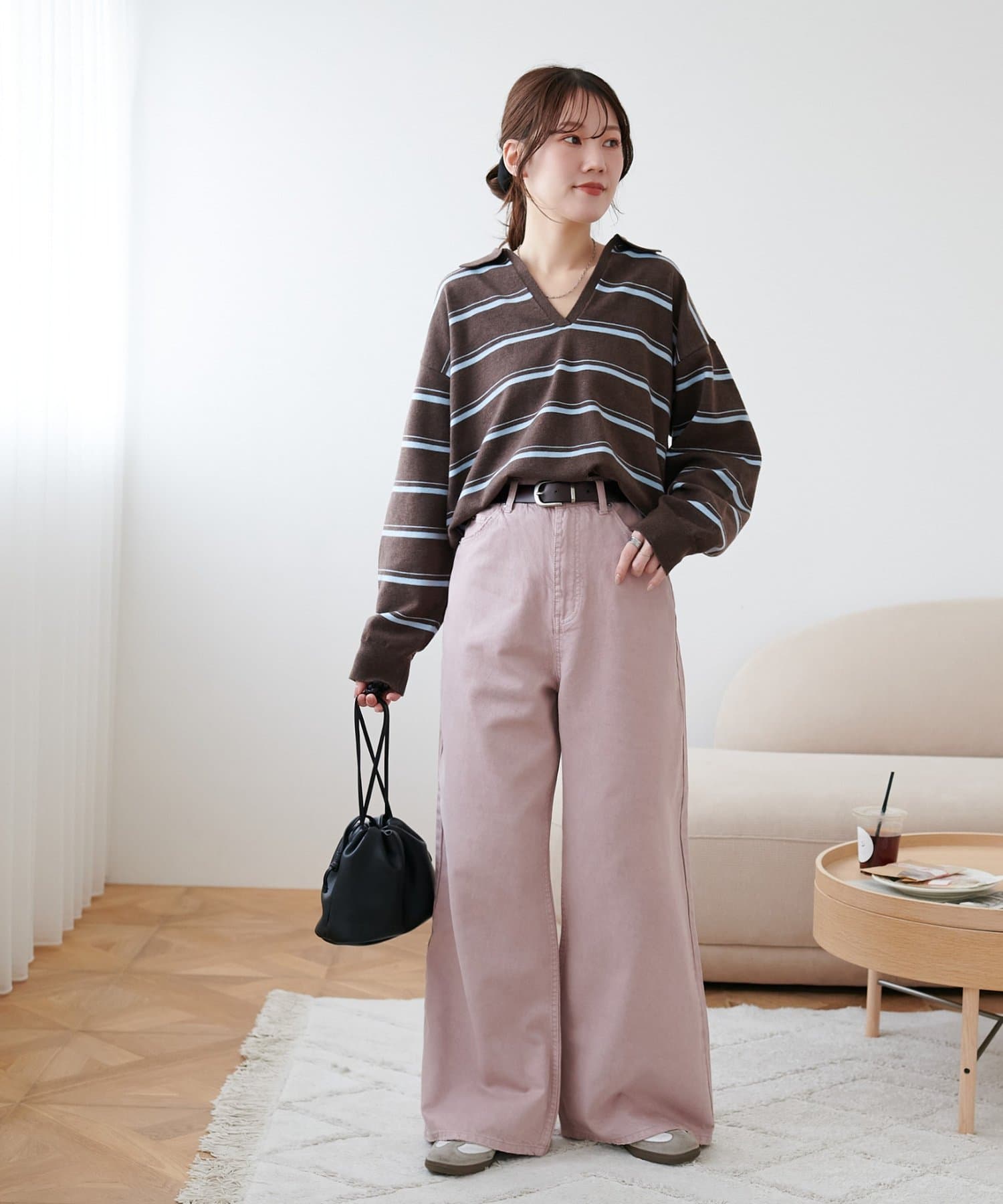 158cmスタッフ(Mサイズ着用):スニーカーだと足元に少し生地が溜まり、ラフなイメージで着ることができます!よりキレイメに着たい場合はブーツやヒール合わせがおすすめです。カラーパンツですが、薄い色味なのでコーデに取り入れやすいです。