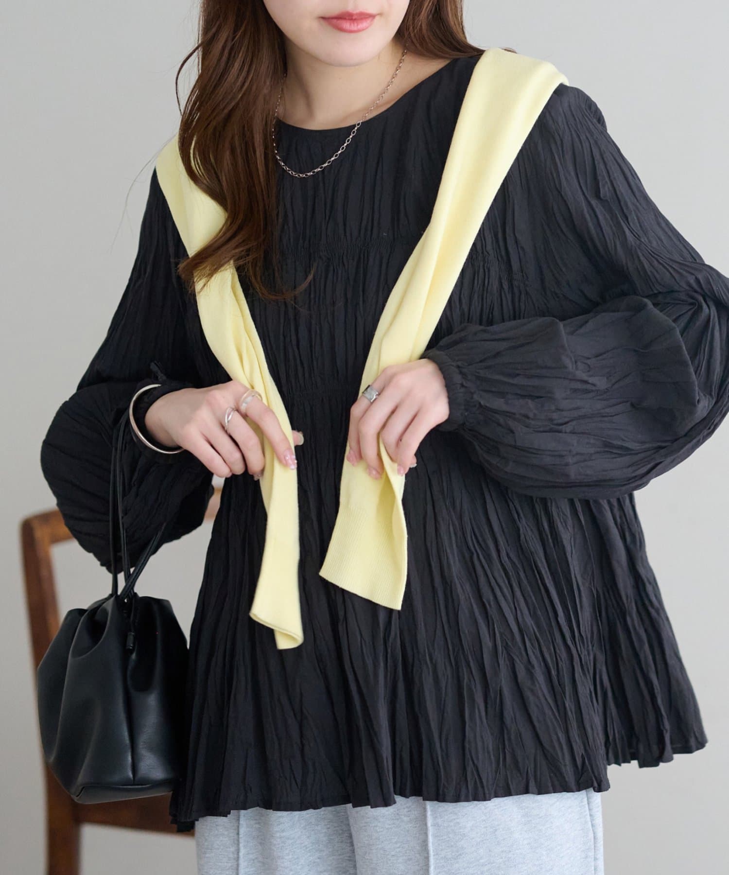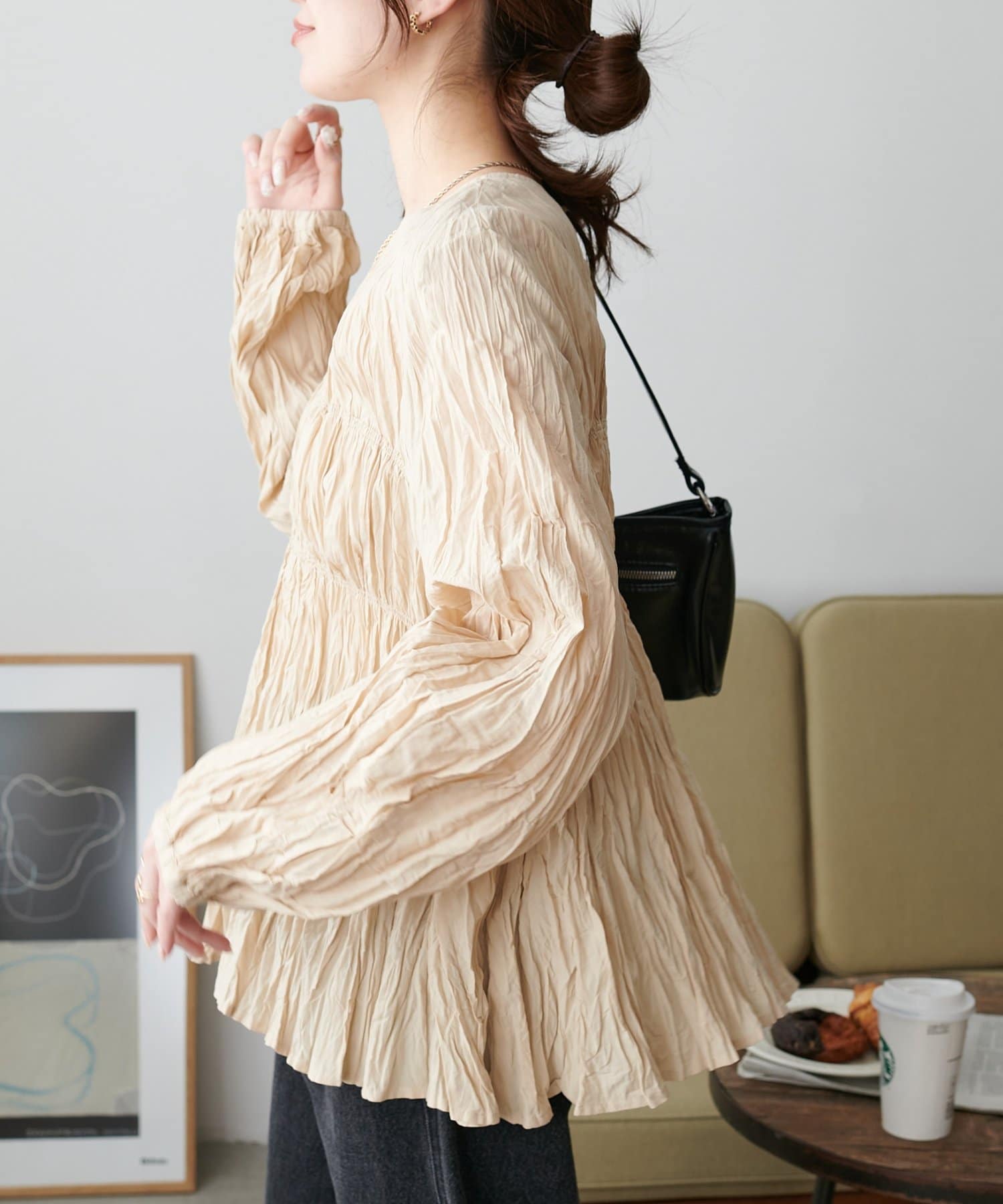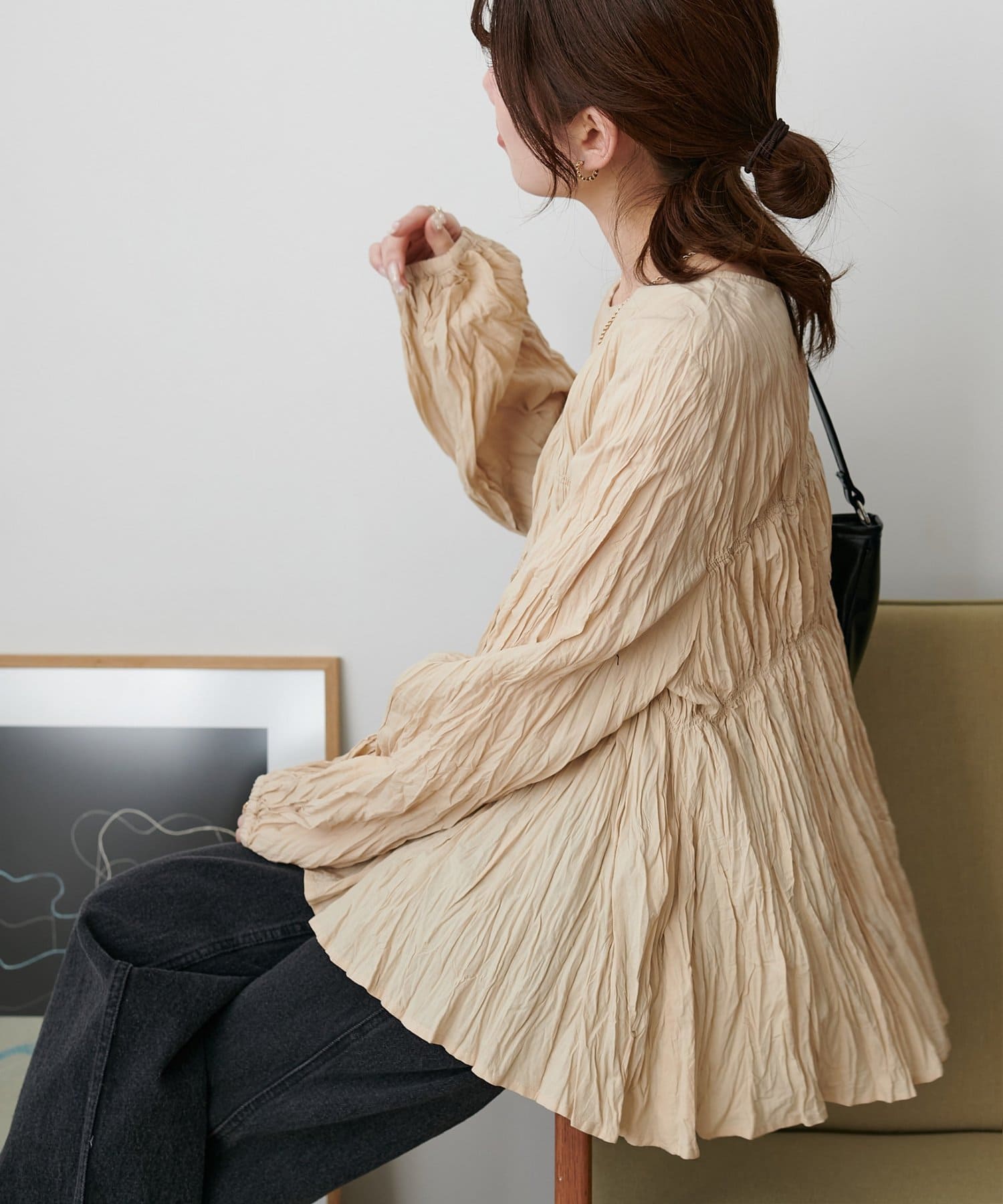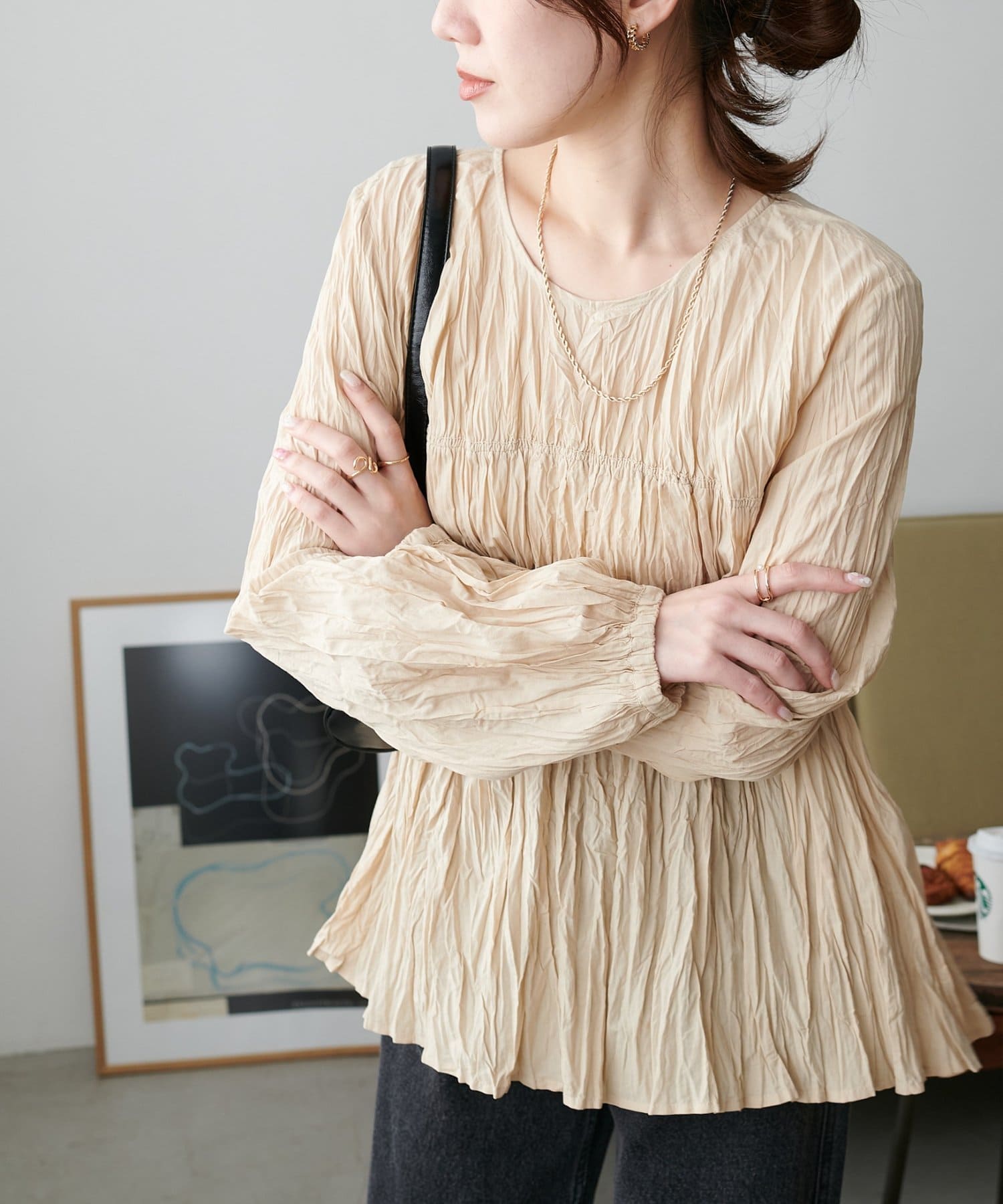 160cmスタッフ:元からシワ加工が施されていることで、気軽にコーデに取り入れることができます!