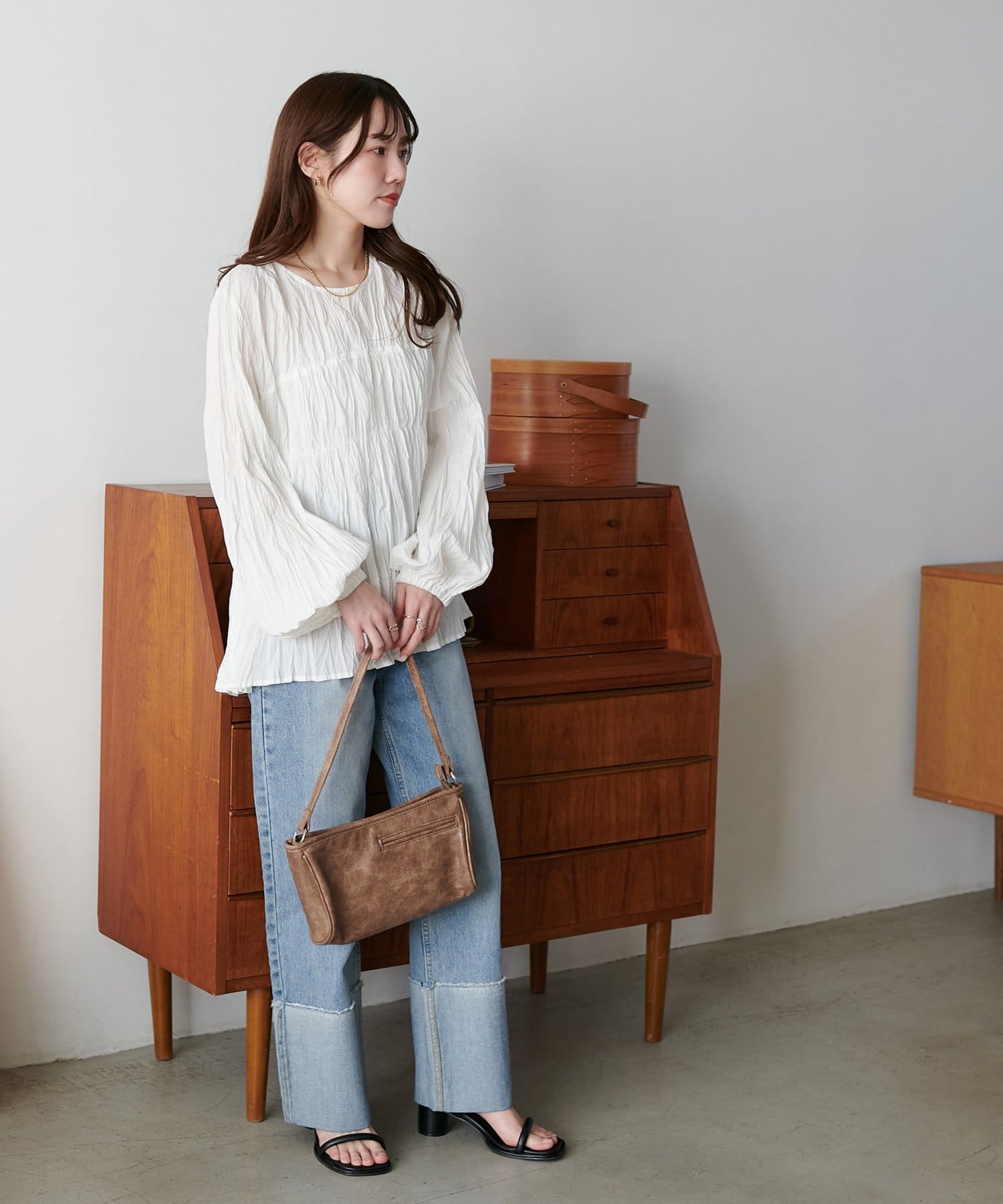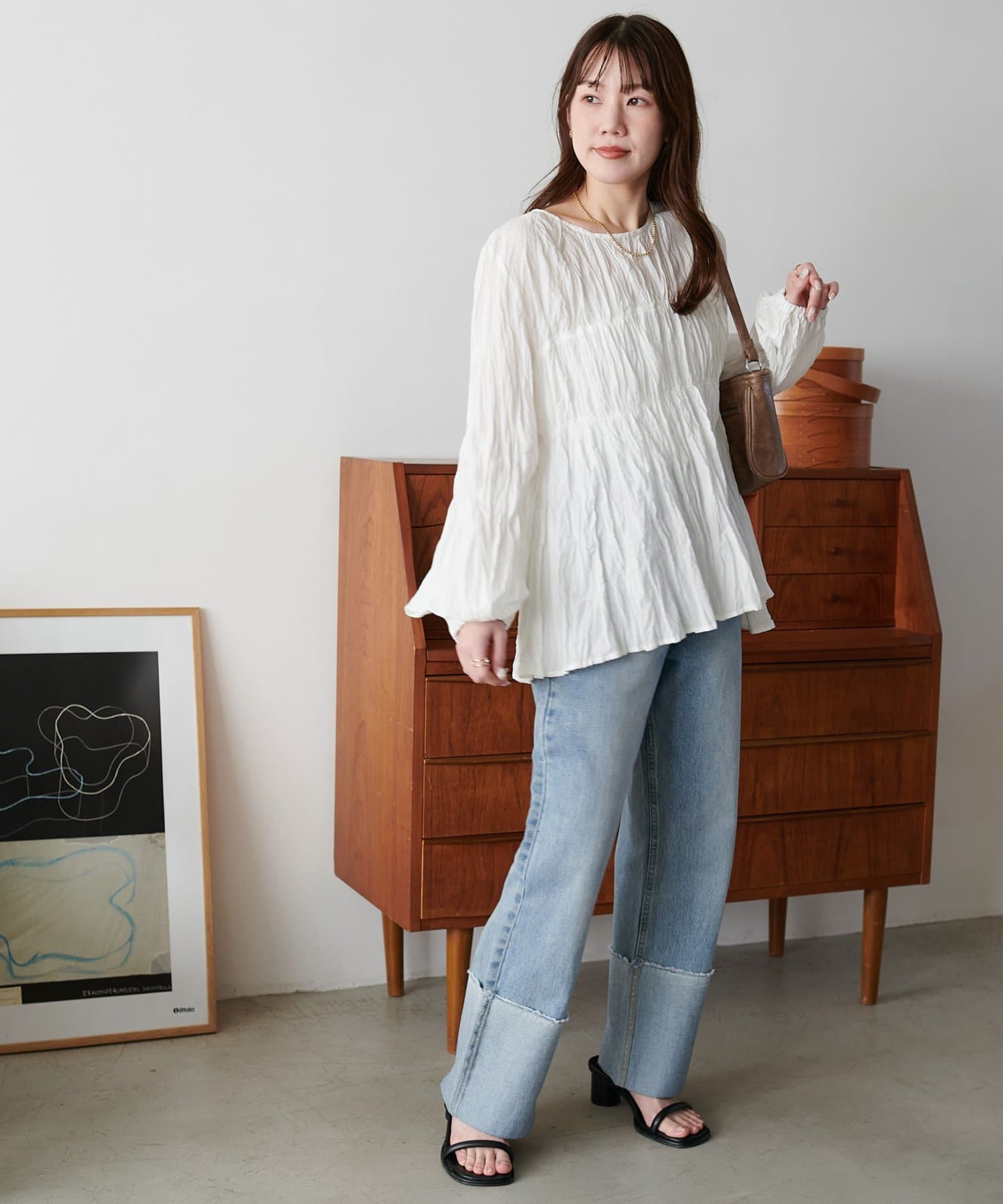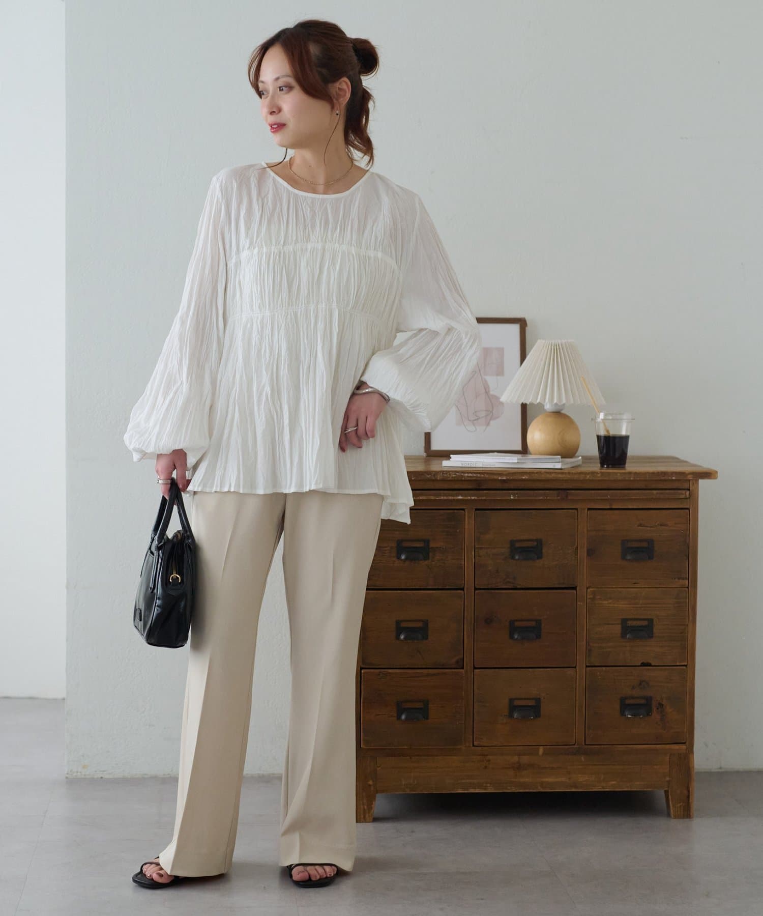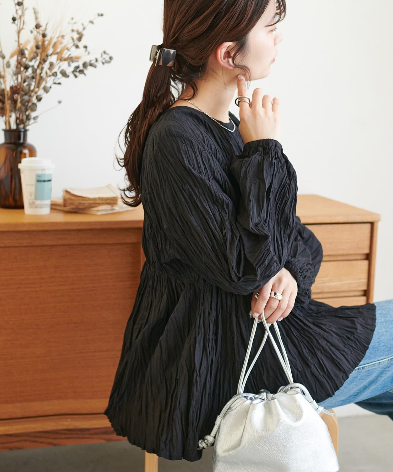 160cmスタッフ:元からシワ加工が施されていることで、気軽にコーデに取り入れることができます!
