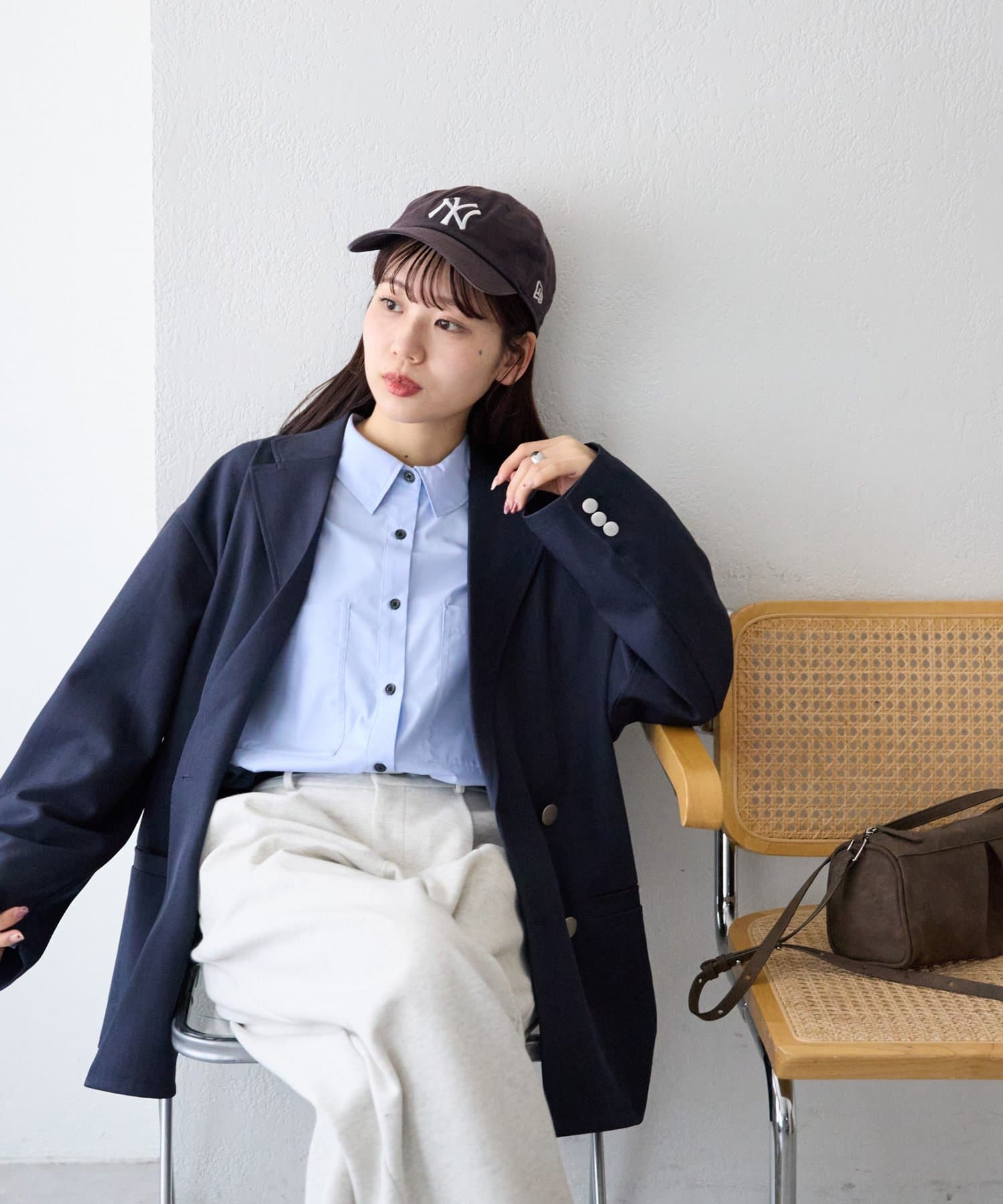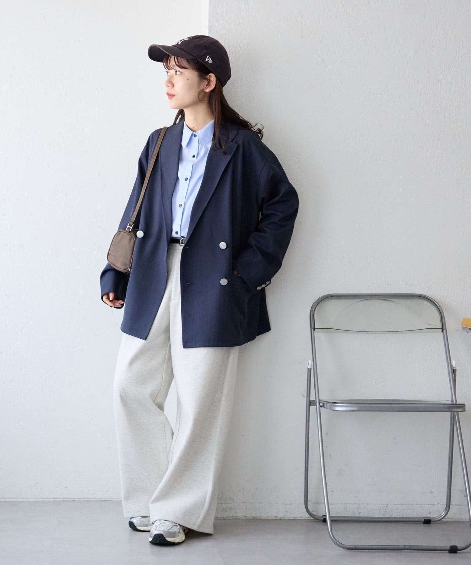 ・スカート合わせなら女性らしさを残しつつ、トップスのオーバーサイズとのバランスで華奢見え