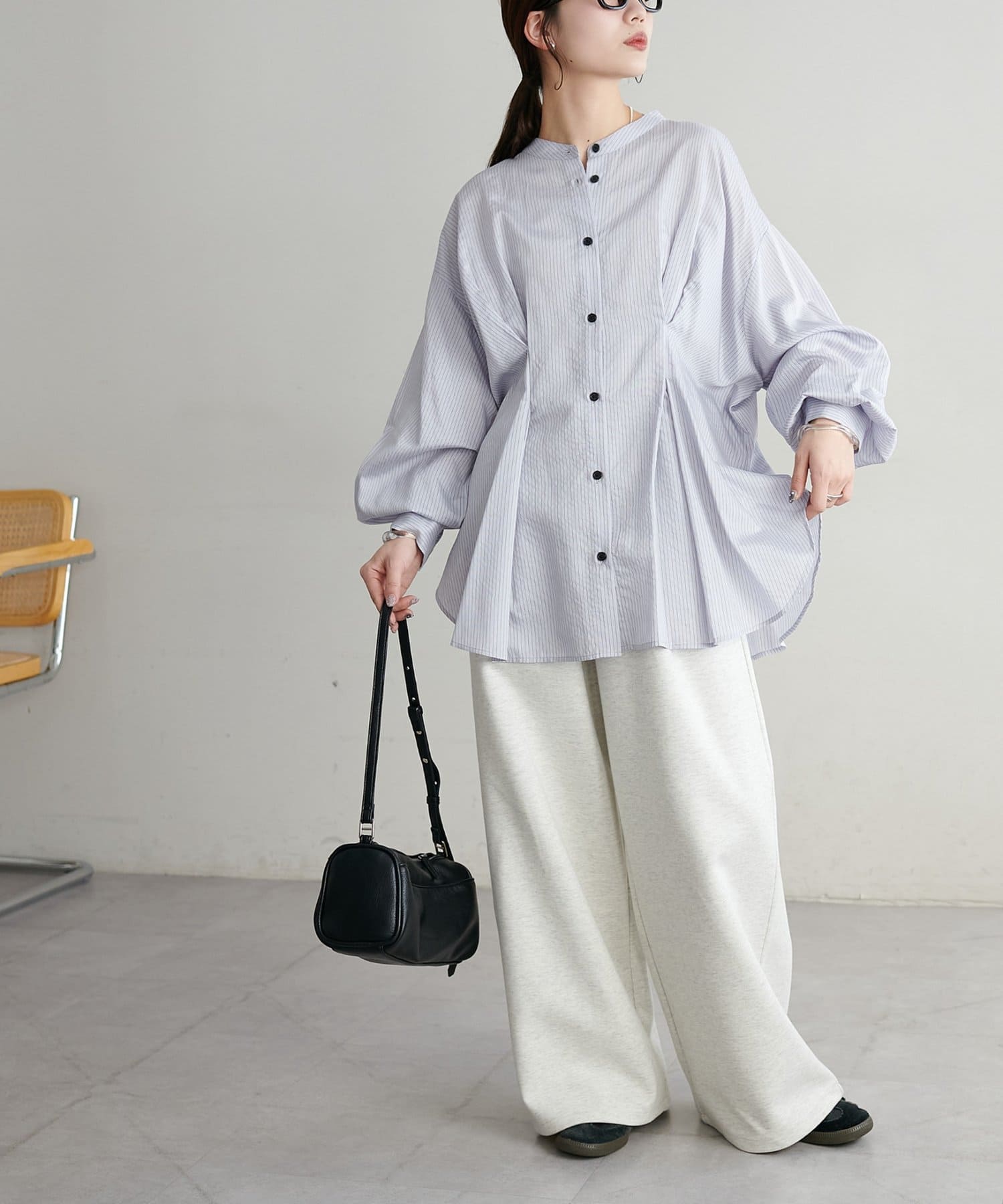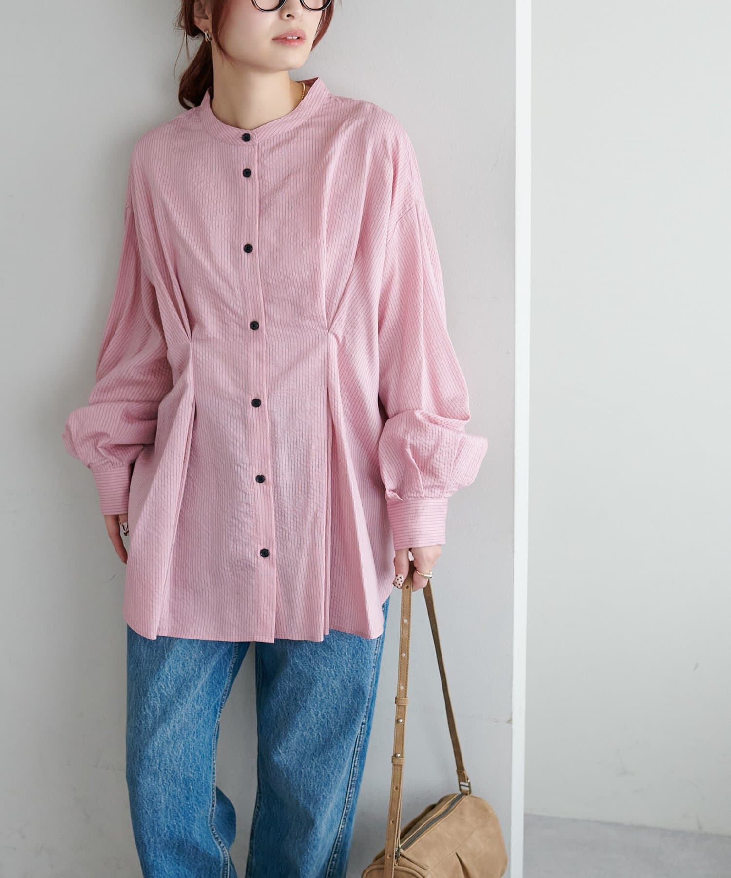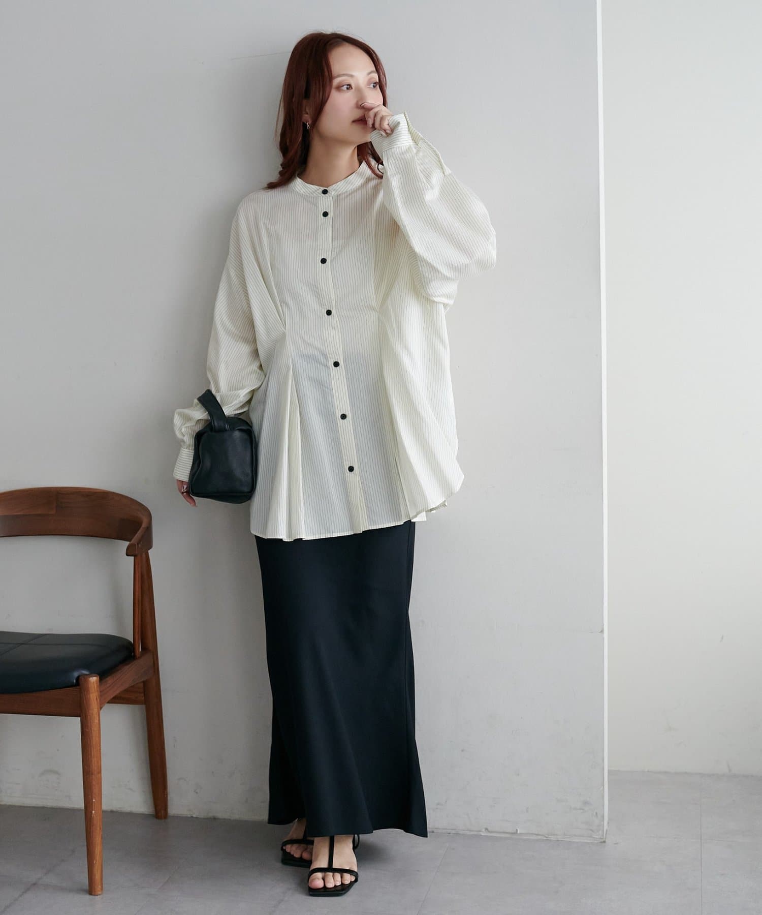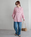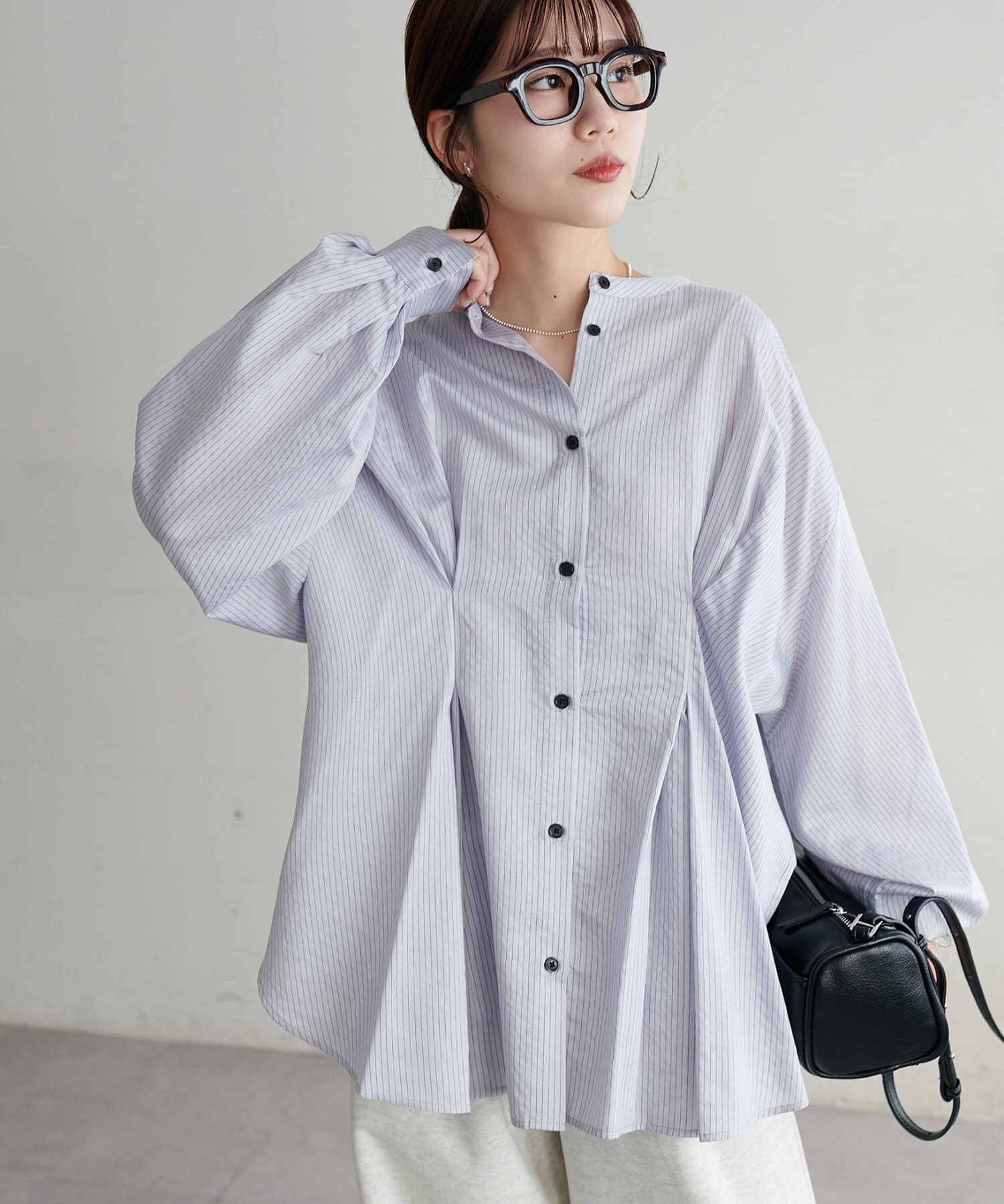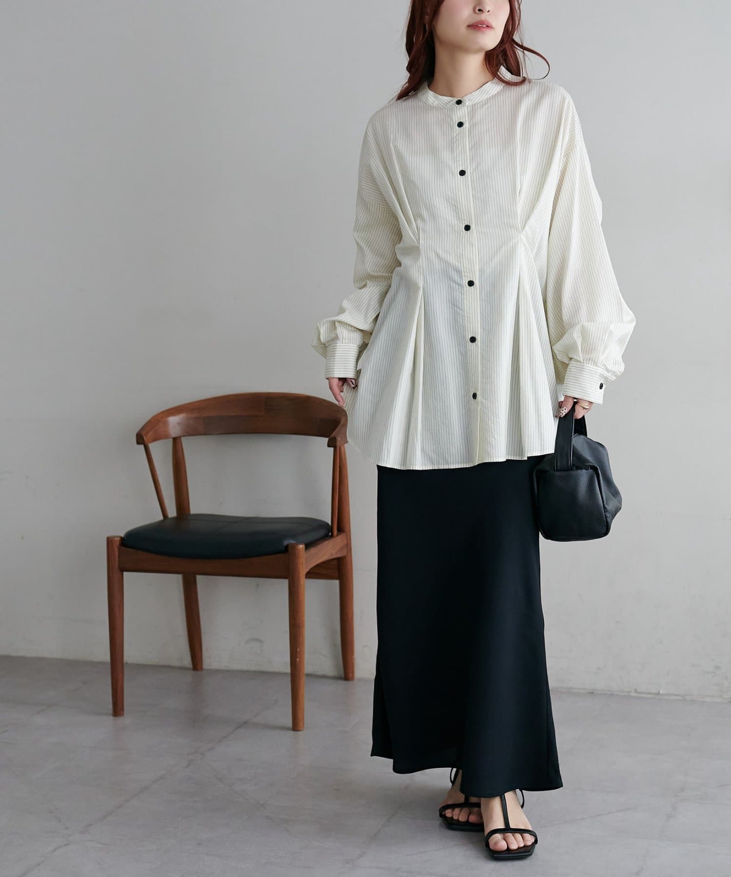 ・首元すっきりのバンドカラーで大人の抜け感をプラス