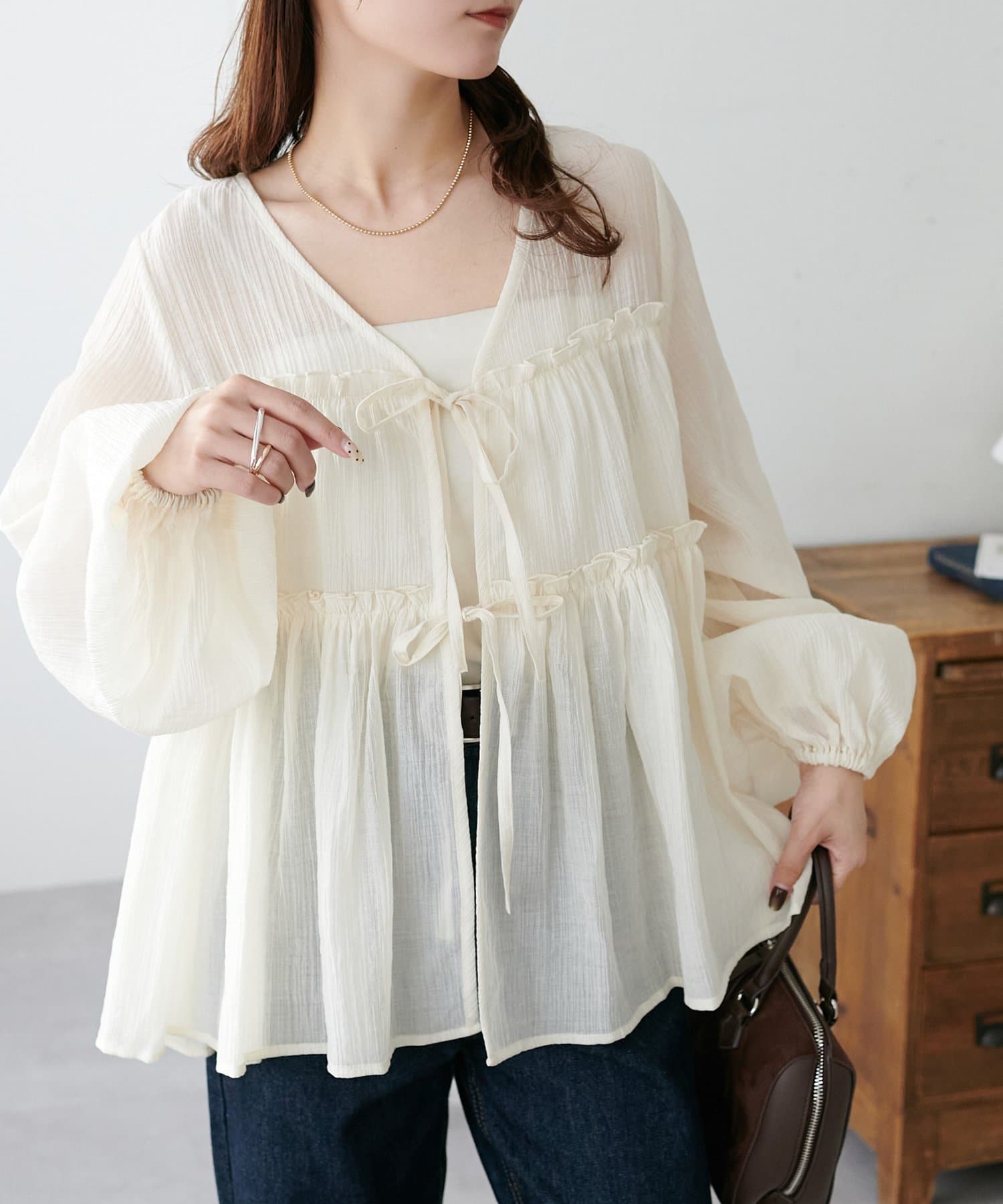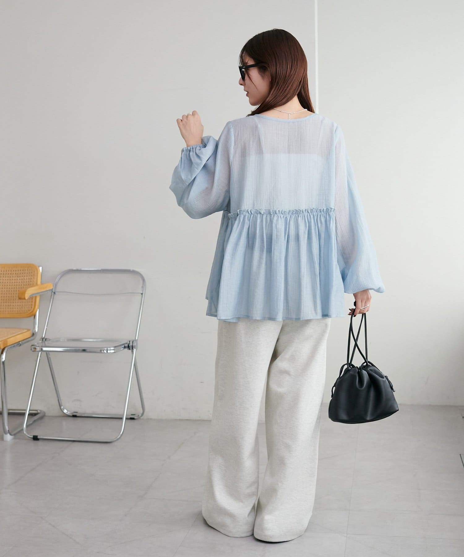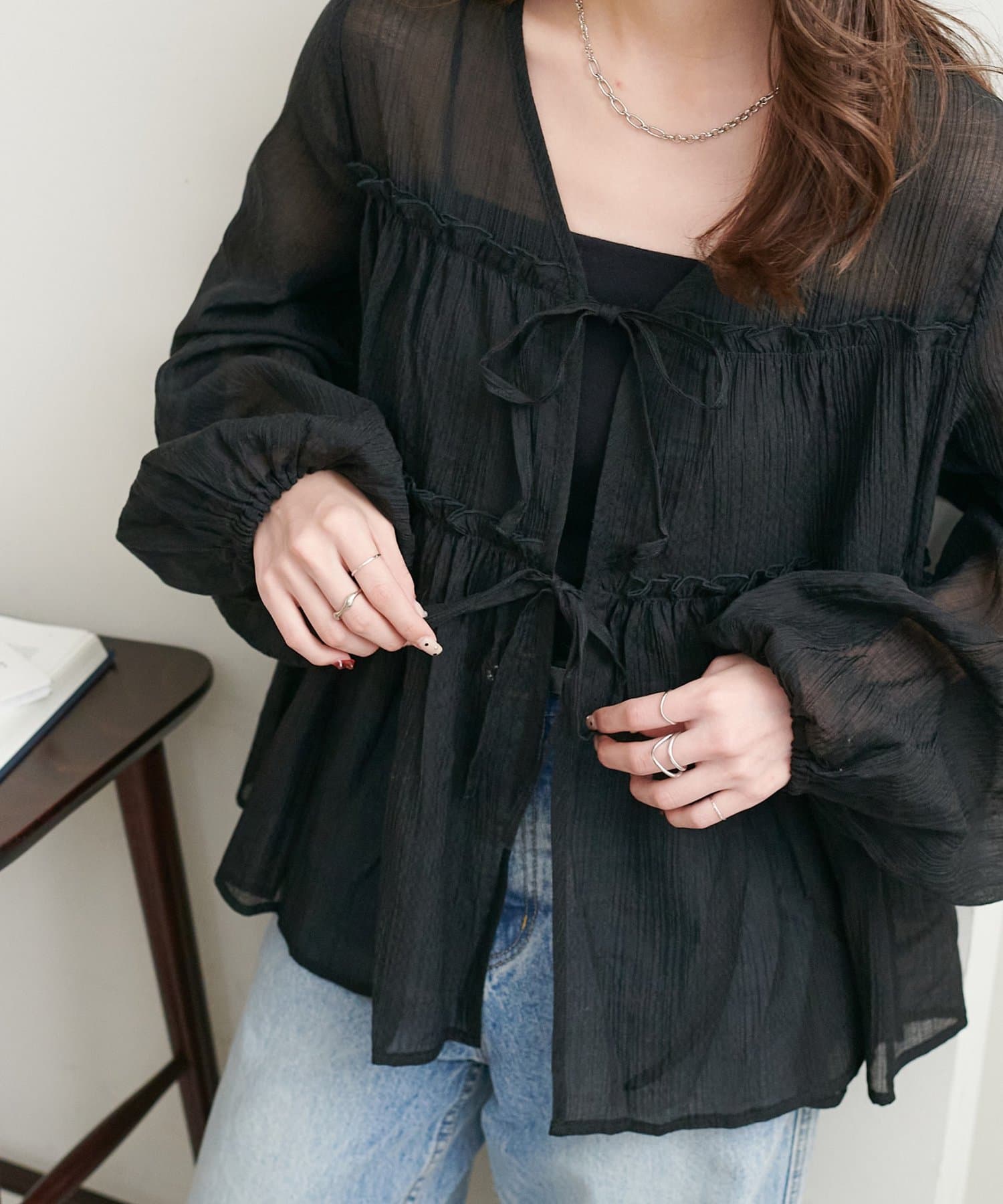 ・ほんのり透け感のあるシアー素材で柔らかく女性らしい印象に