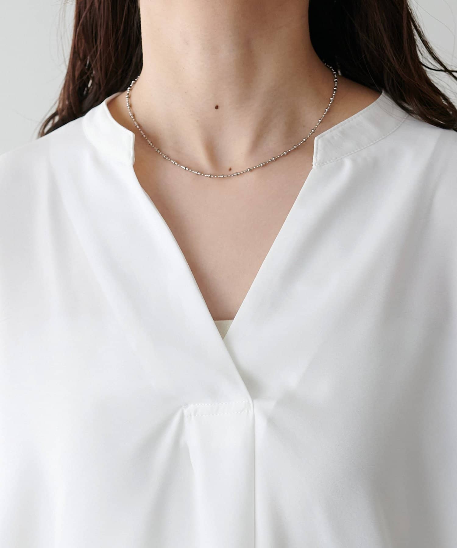 デコルテが綺麗に見えるVネックで、オンオフ問わず活躍します。