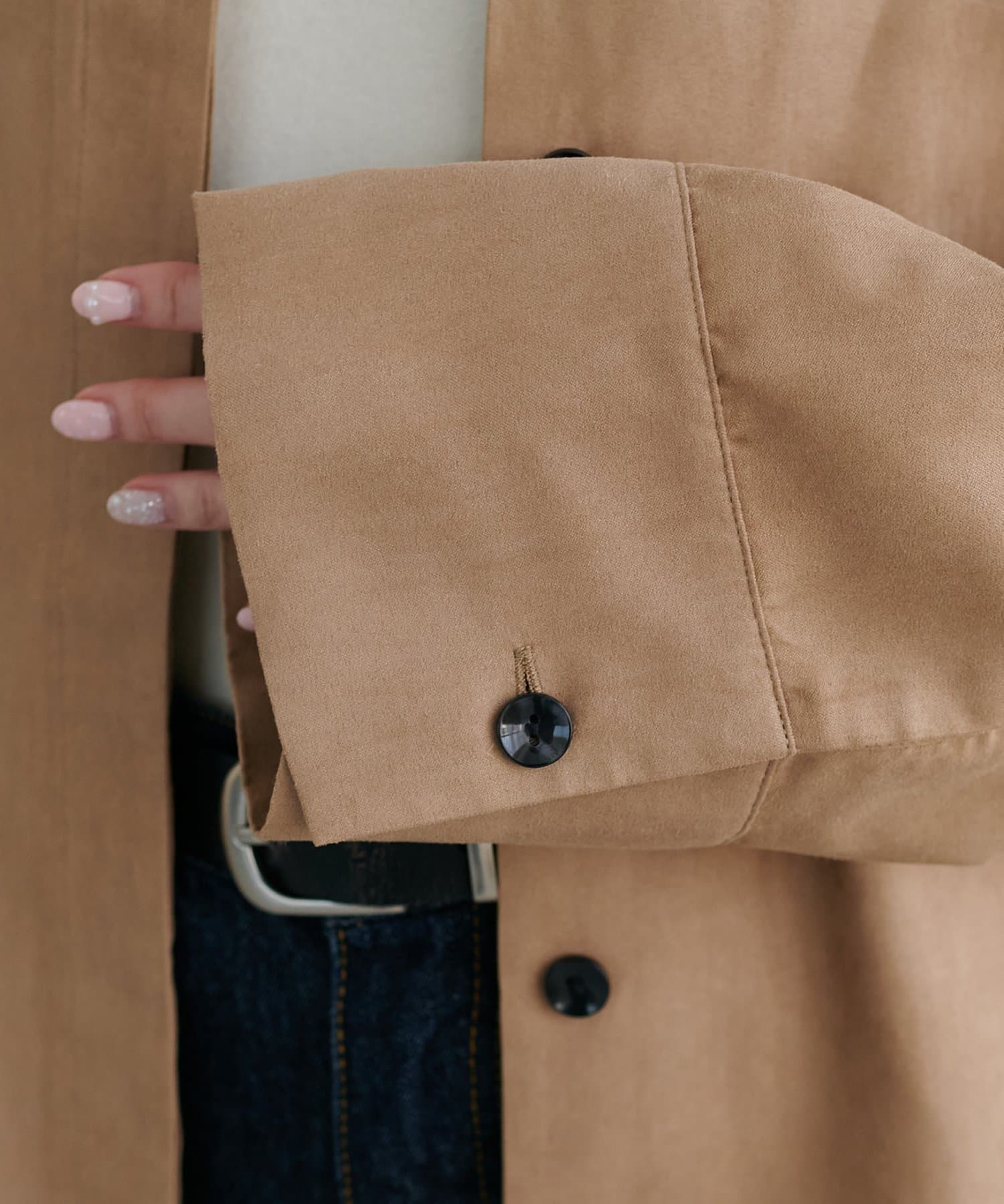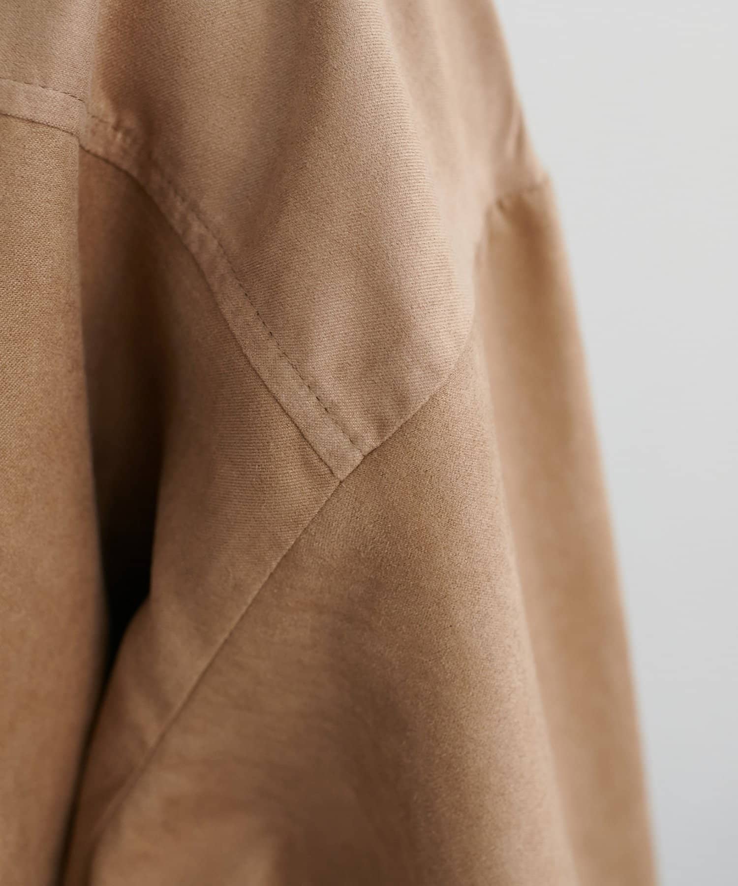 157cmスタッフ:程よいゆとりがあり、中にインナーを合わせてももたつきません。フェイクスエードの上品な質感で、カジュアルにもきれいめにも使える万能アイテム!
