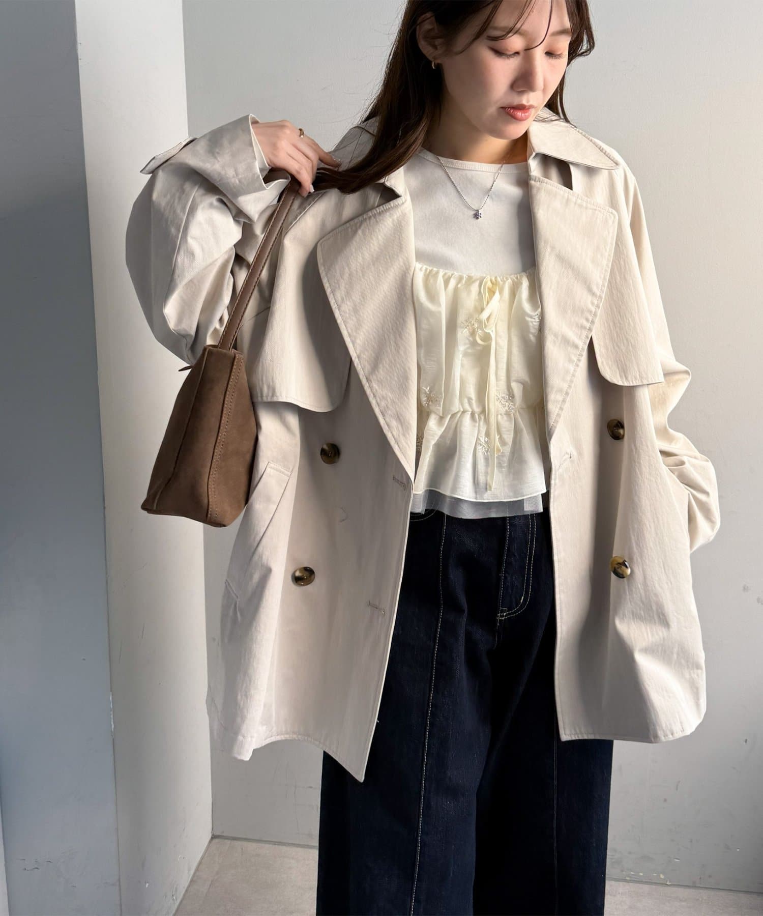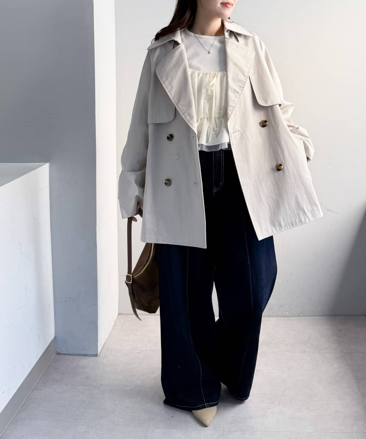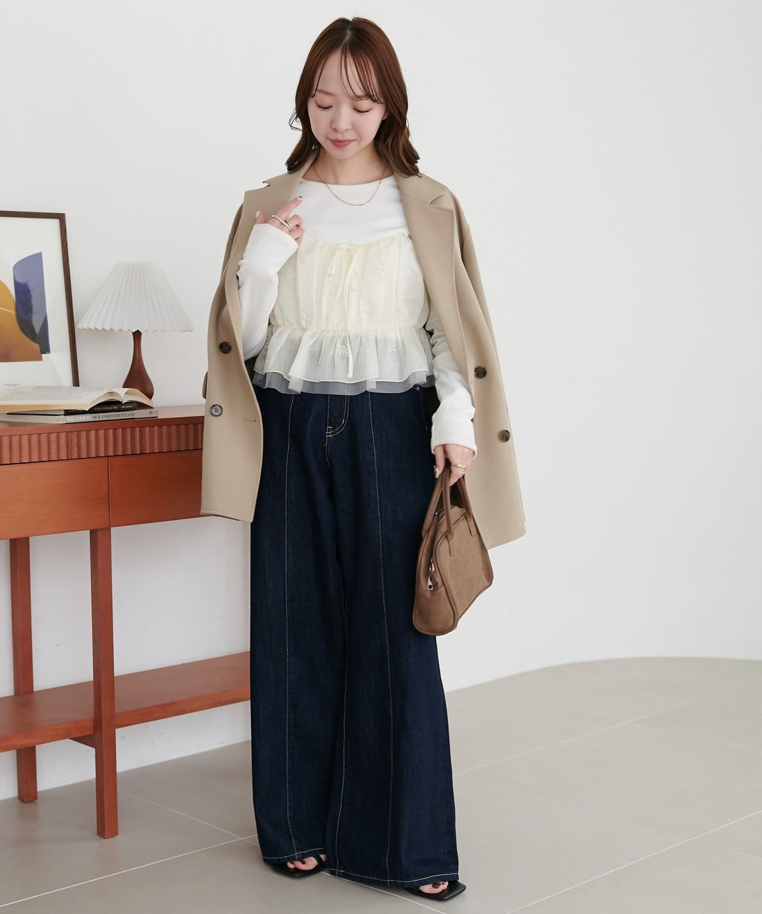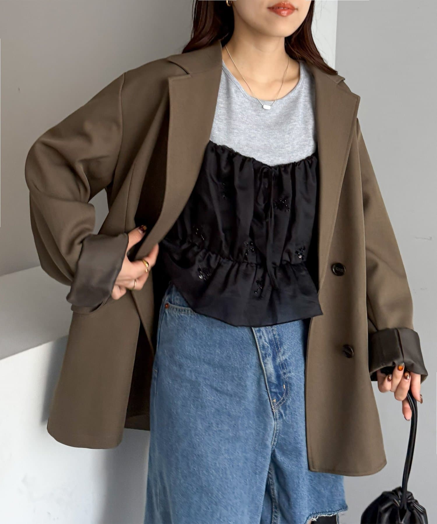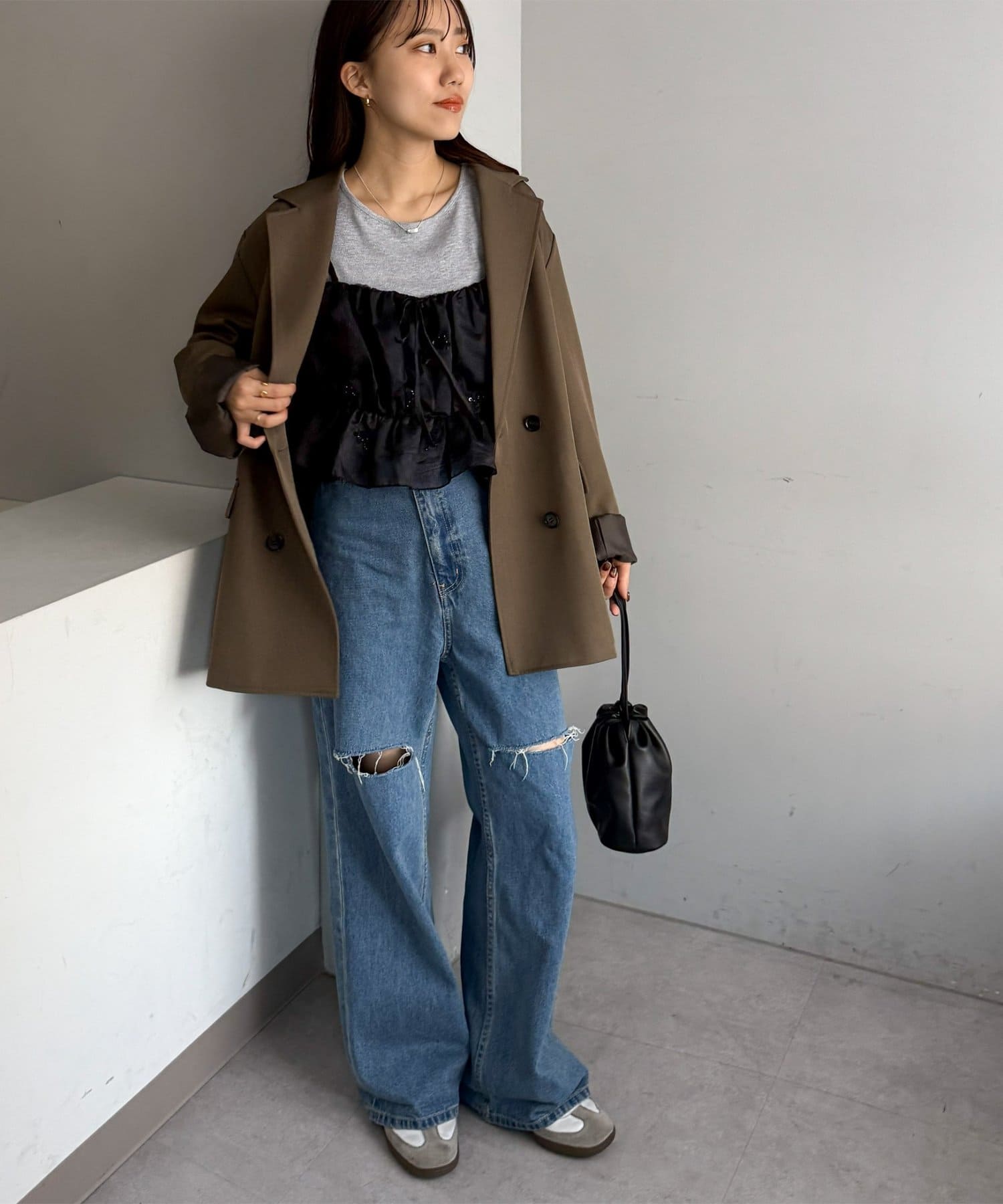 甘さがあるアイテムなので、デニムとスニーカー合わせでカジュアルダウンさせて着るのもおすすめです!