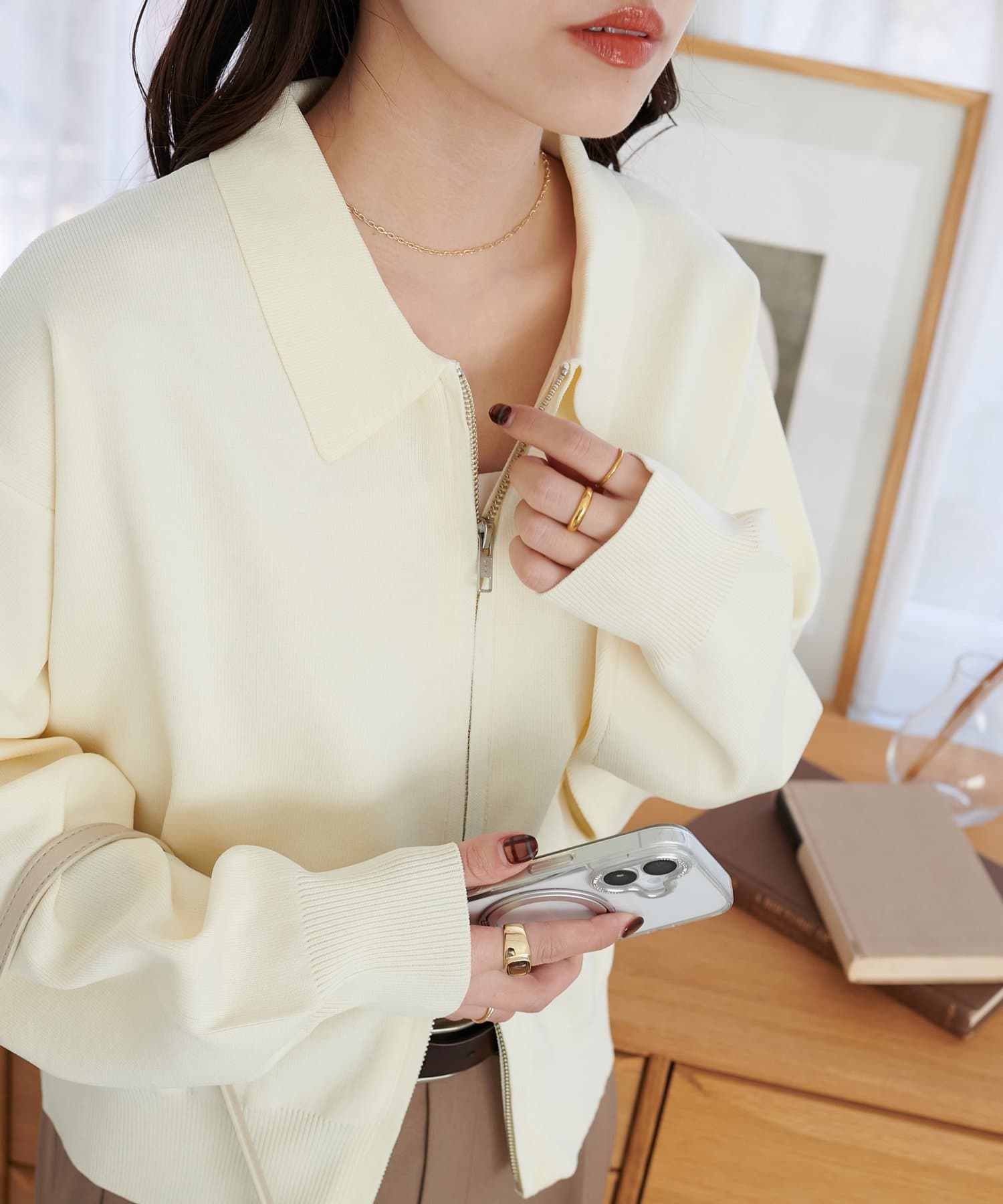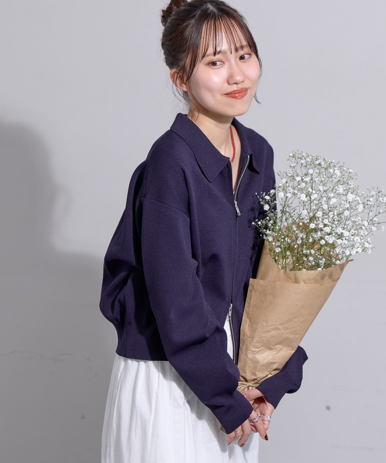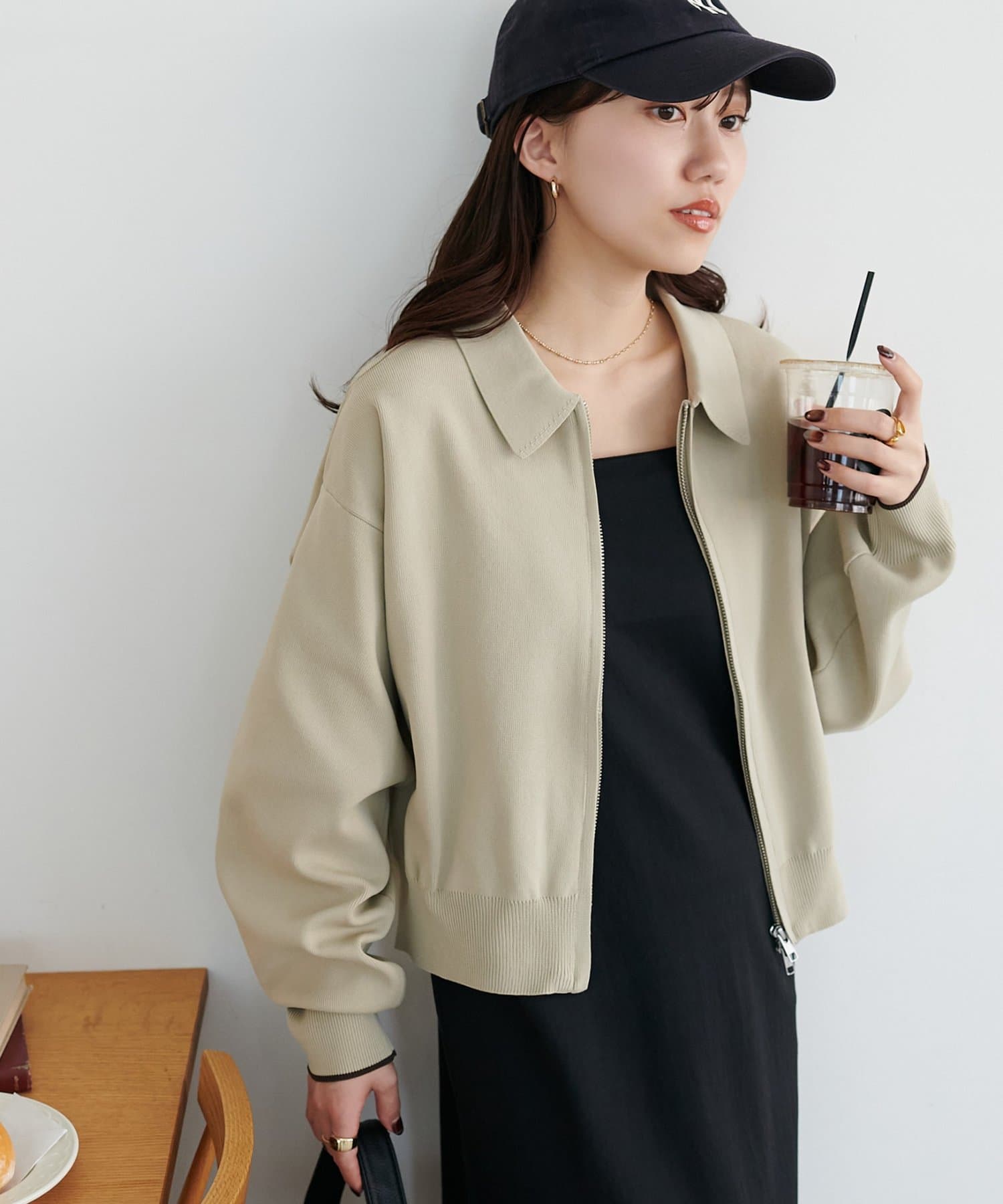 160cmスタッフ:ヒップにややかかるほどの着丈は、ワイドパンツからスカートまでボリューム感のあるボトムスとも合います!ジップの開け具合で雰囲気が変わるので、テイスト問わずコーデに取り入れられそうです。