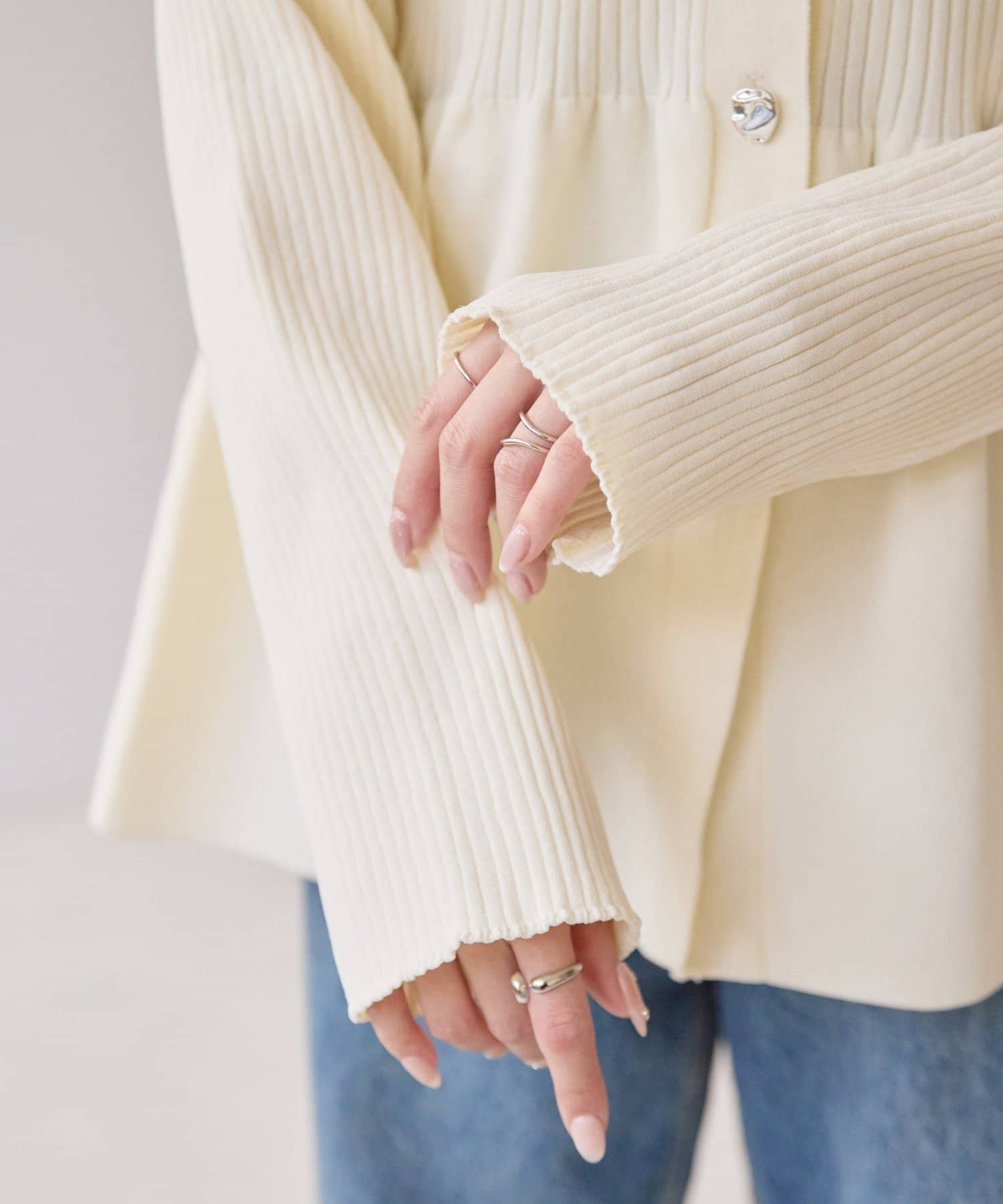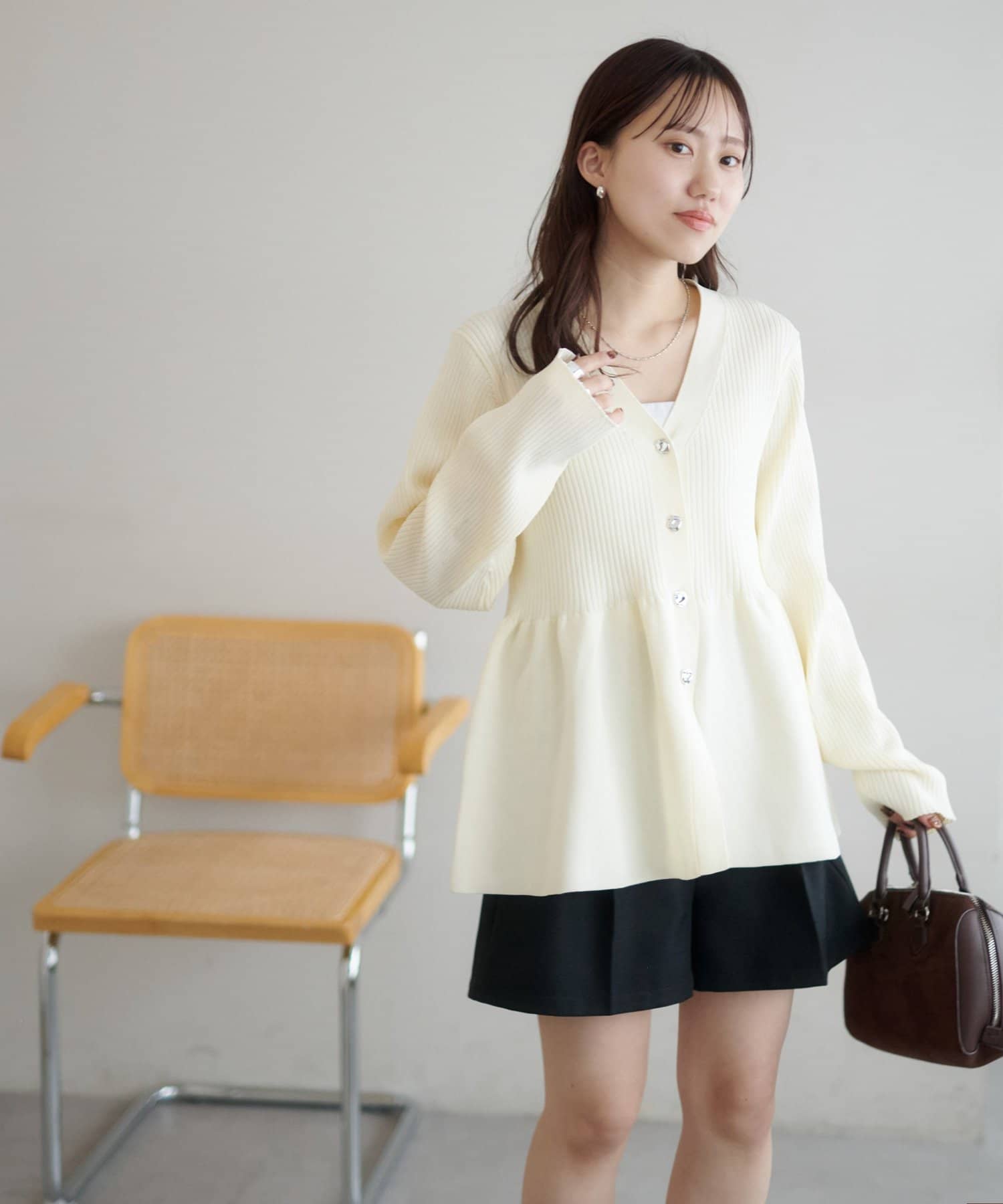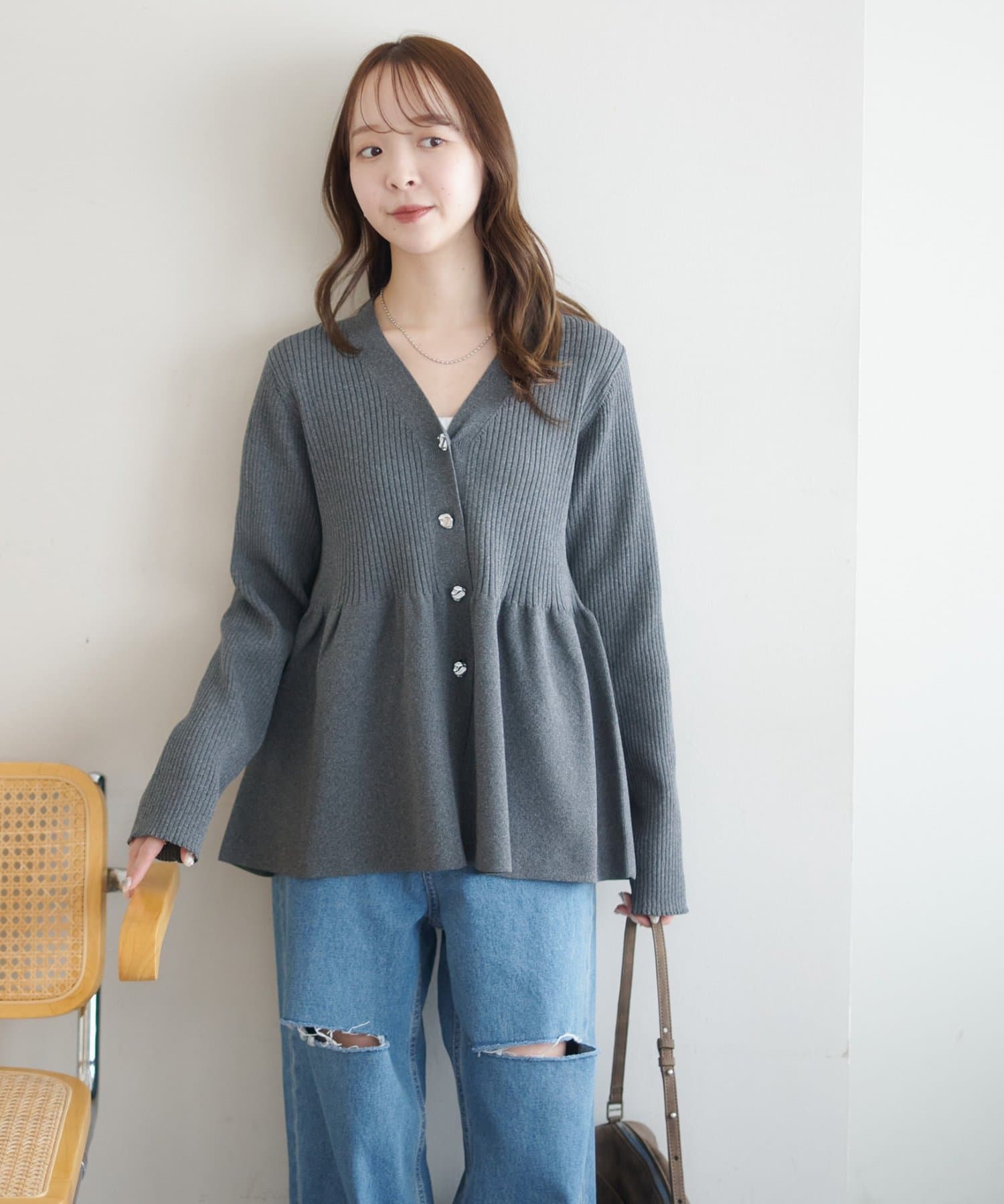 【スタイルアップ♪】リブメタル釦ペプラムカーディガン