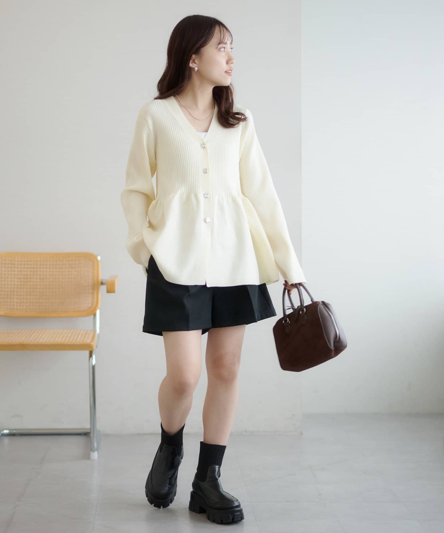 153cmスタッフ:ヒップがすっぽりと隠れる着丈ですが、切り替えの位置が高めなペプラムなので、スタイルアップします!暖かくなってきたら、ショートパンツと合わせたコーデもしてみたいです♪