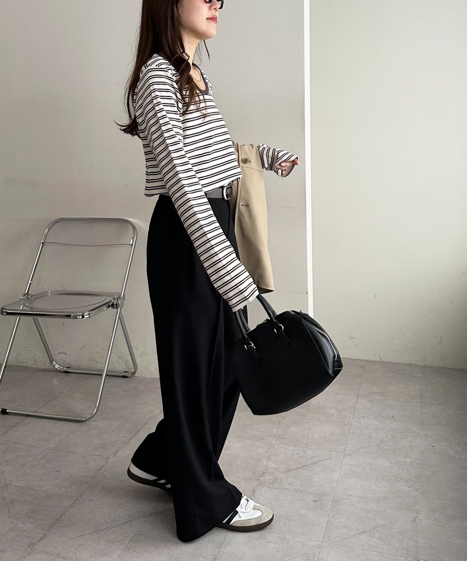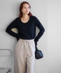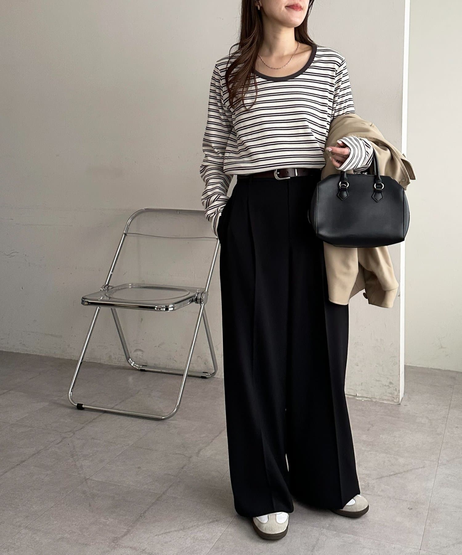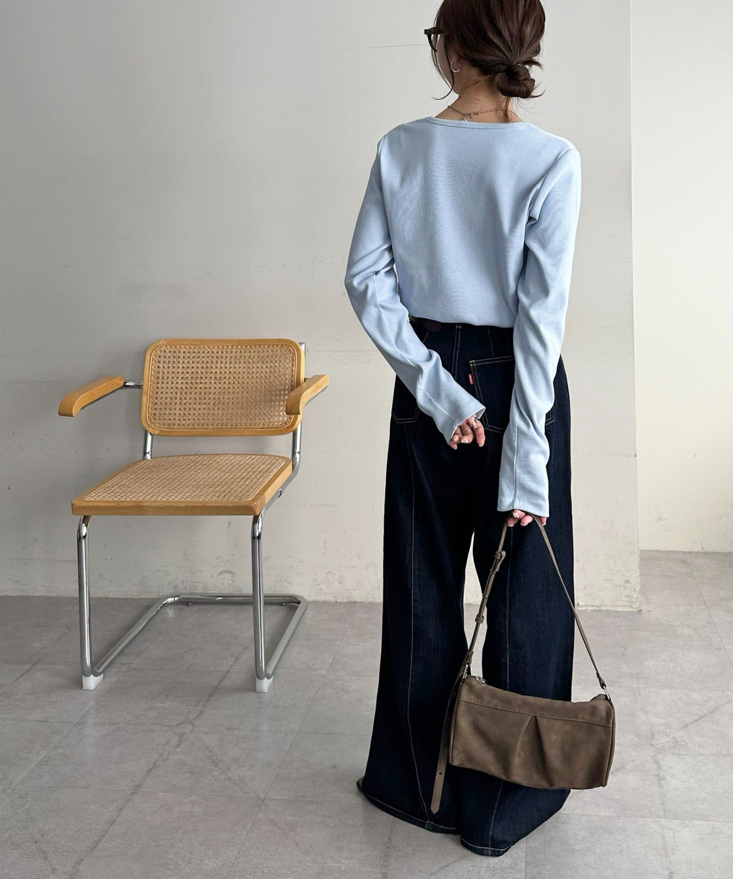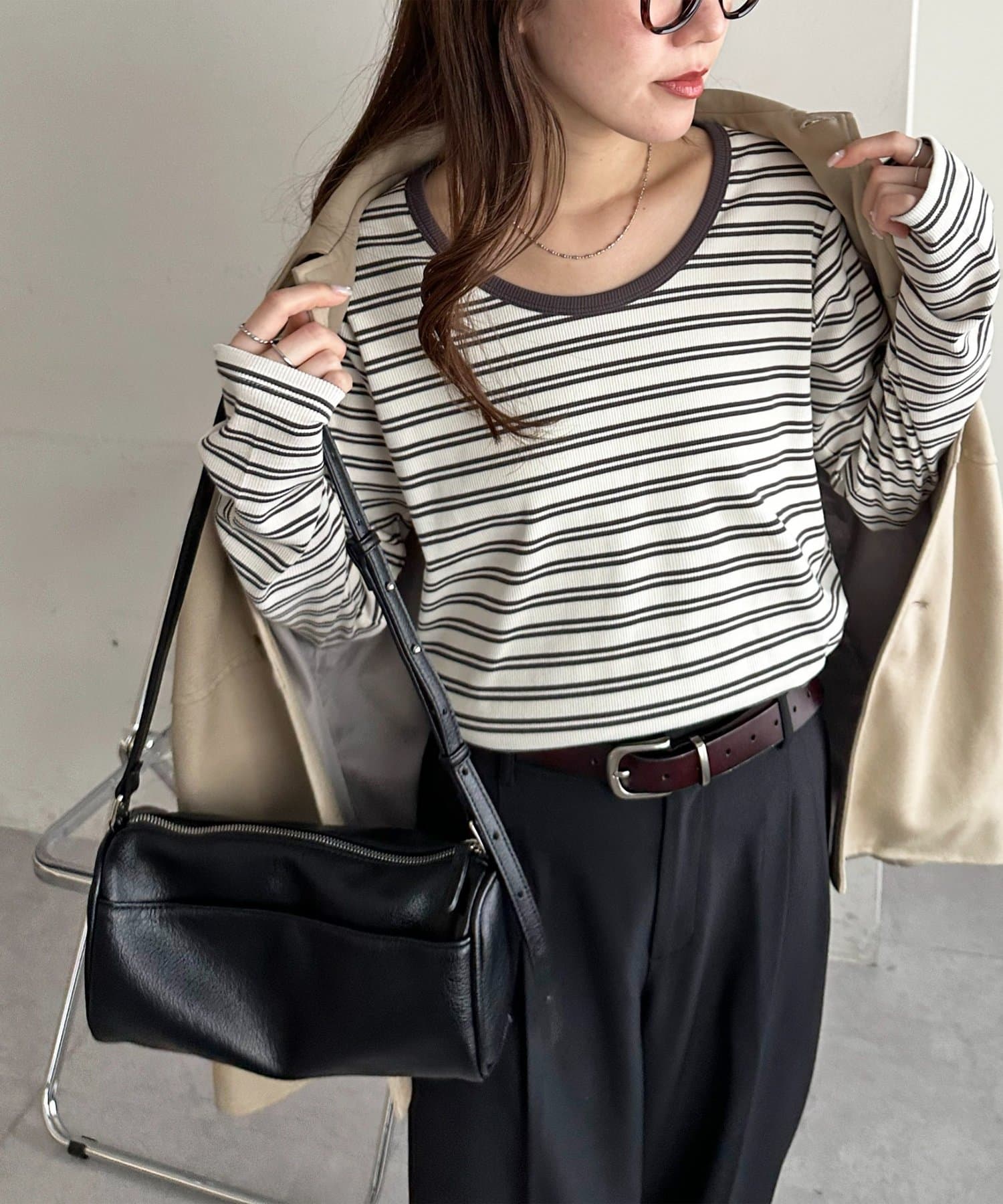 164cmスタッフ:首元が開きすぎないので、1枚でも安心感があり、オンオフ問わず使えます!腰骨あたりの丈感で、アウトで着てもだらしなく見えなかったです。