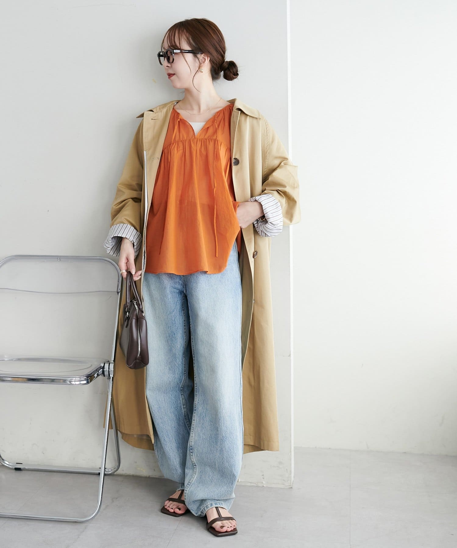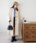 149cmスタッフ:一見長そうなアウターですが、着てみると低身長でも合わせられる着丈です。裾にスリットも入っているので、動きやすくコーデに取り入れやすいです。