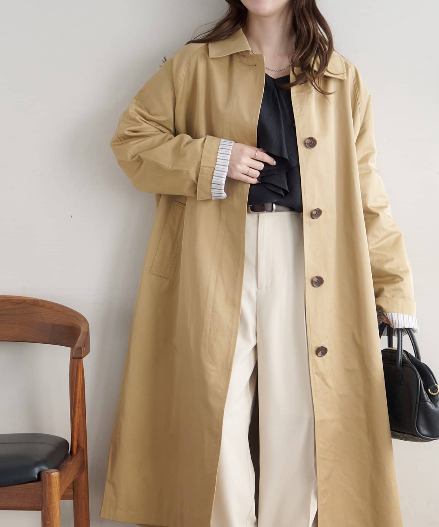 160cmスタッフ:ロング丈だと裾の汚れが気になることが多いですが、このアウターは洗濯が可能なので気にせず着用できます。シンプルなデザインですが、手元の裏地がストライプ柄になっているのがお気に入りです。