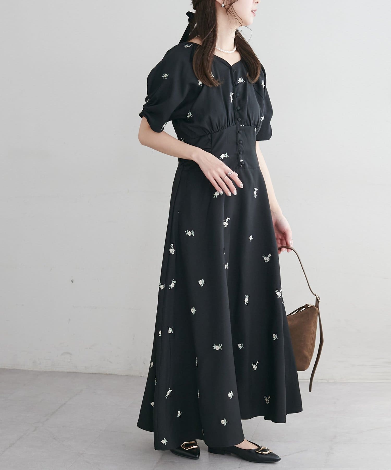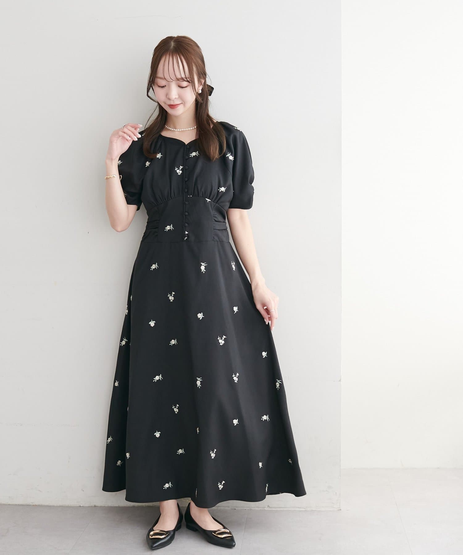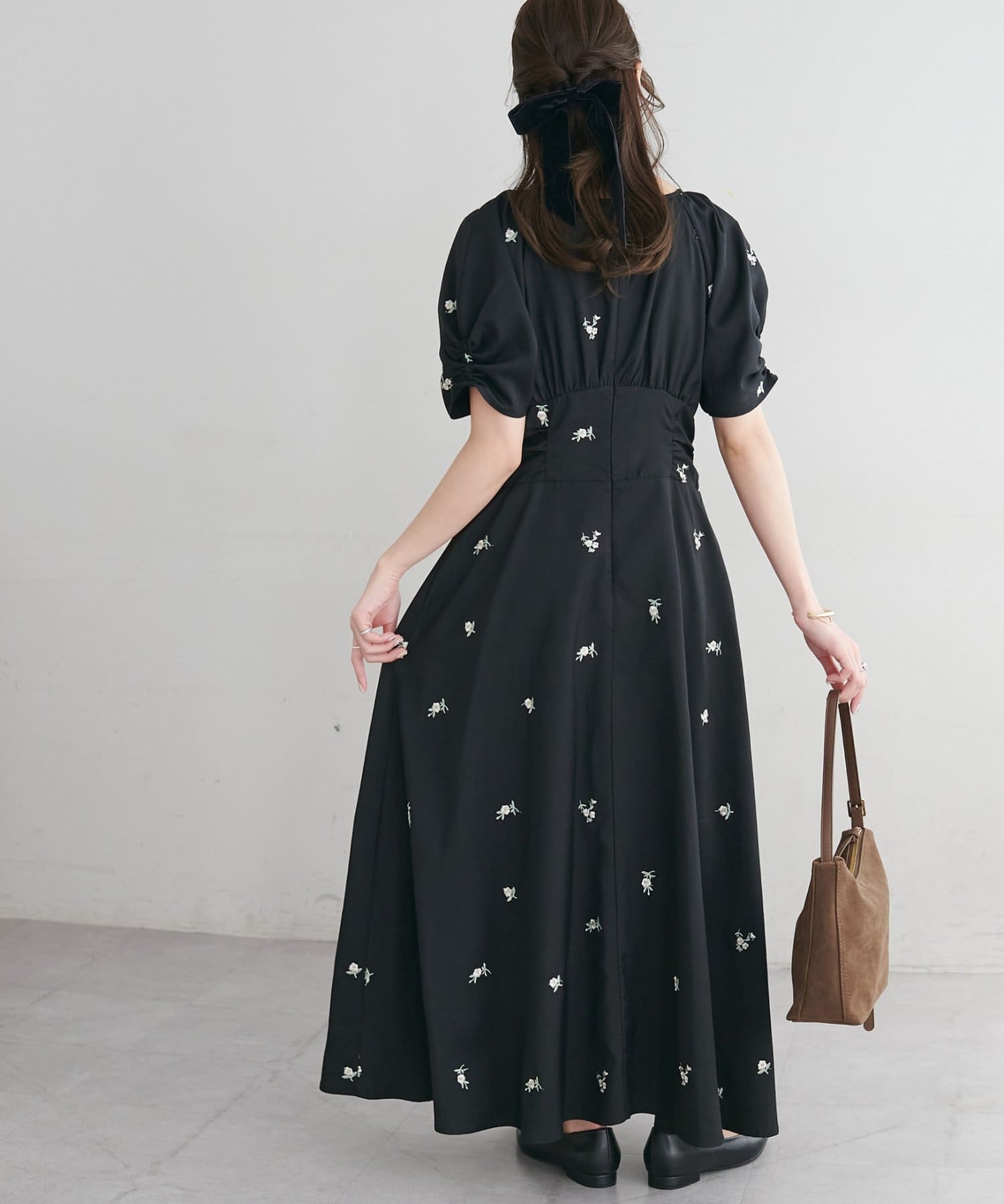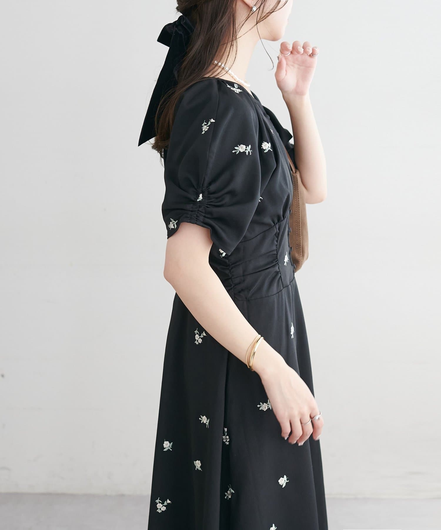 ・花柄の刺繍が華やかさ印象を引き立てます。