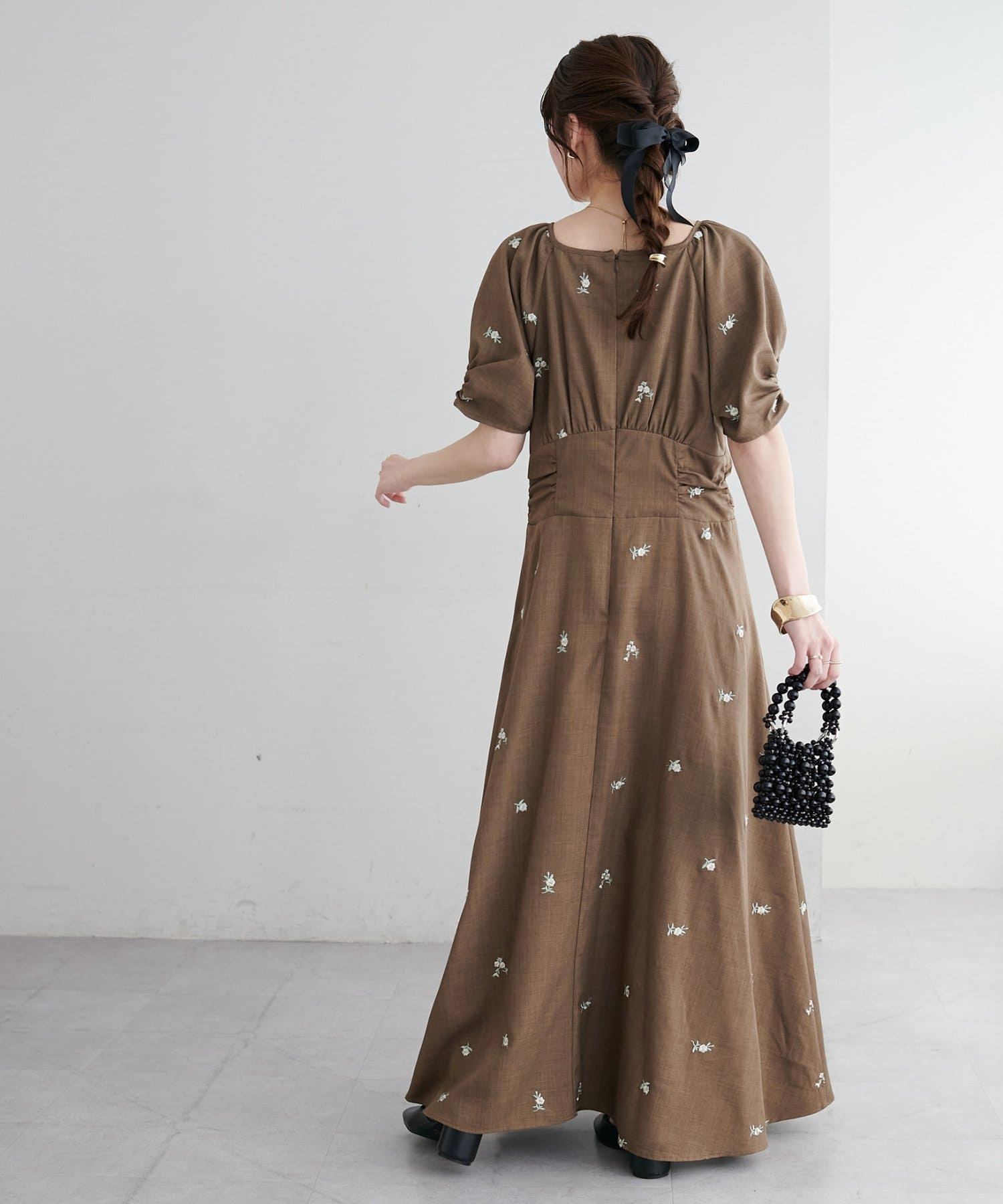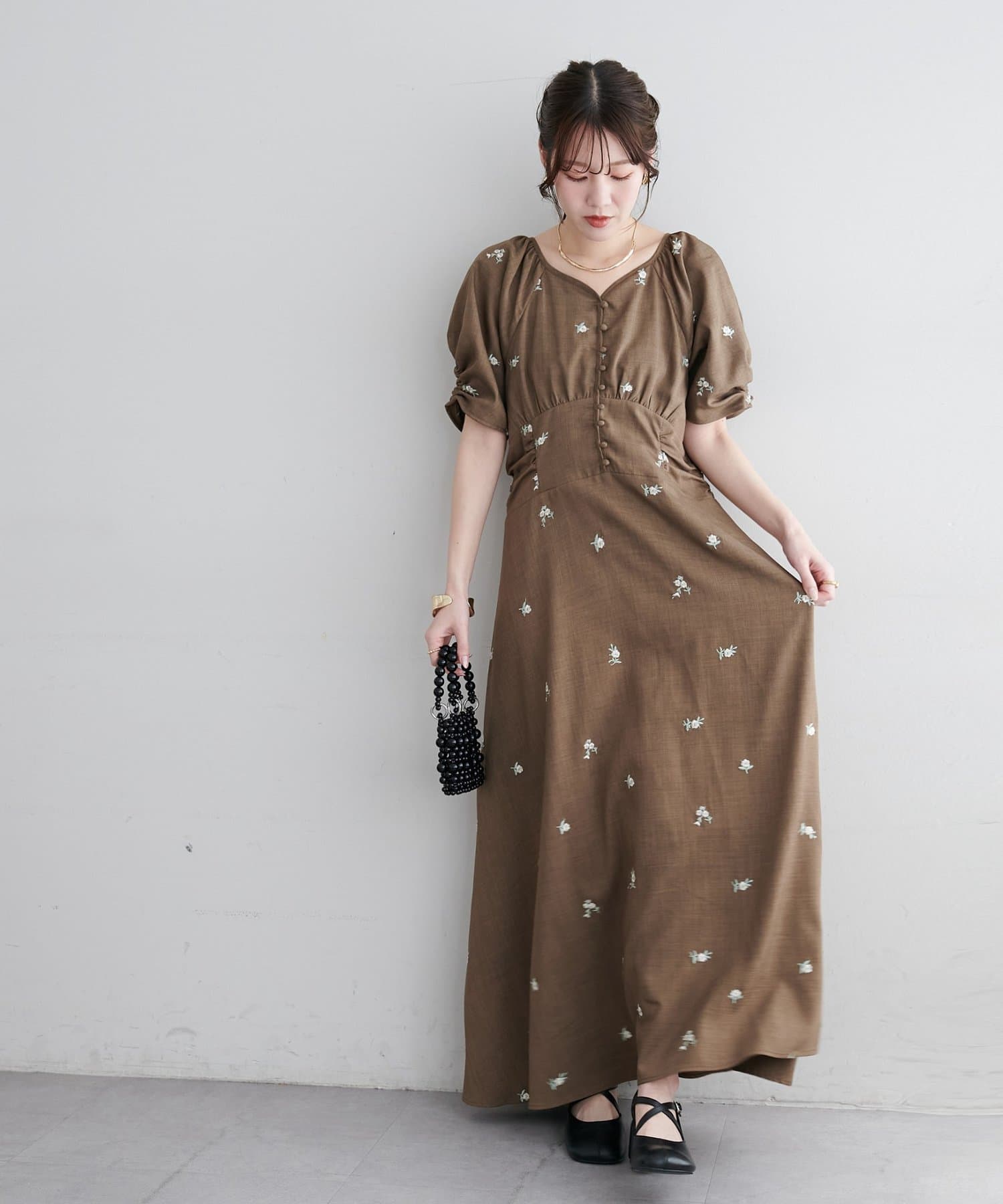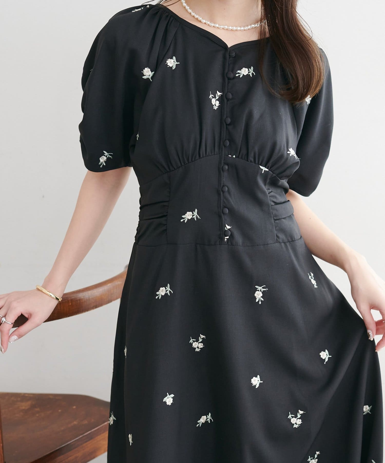 ・花柄の刺繍が華やかさ印象を引き立てます。