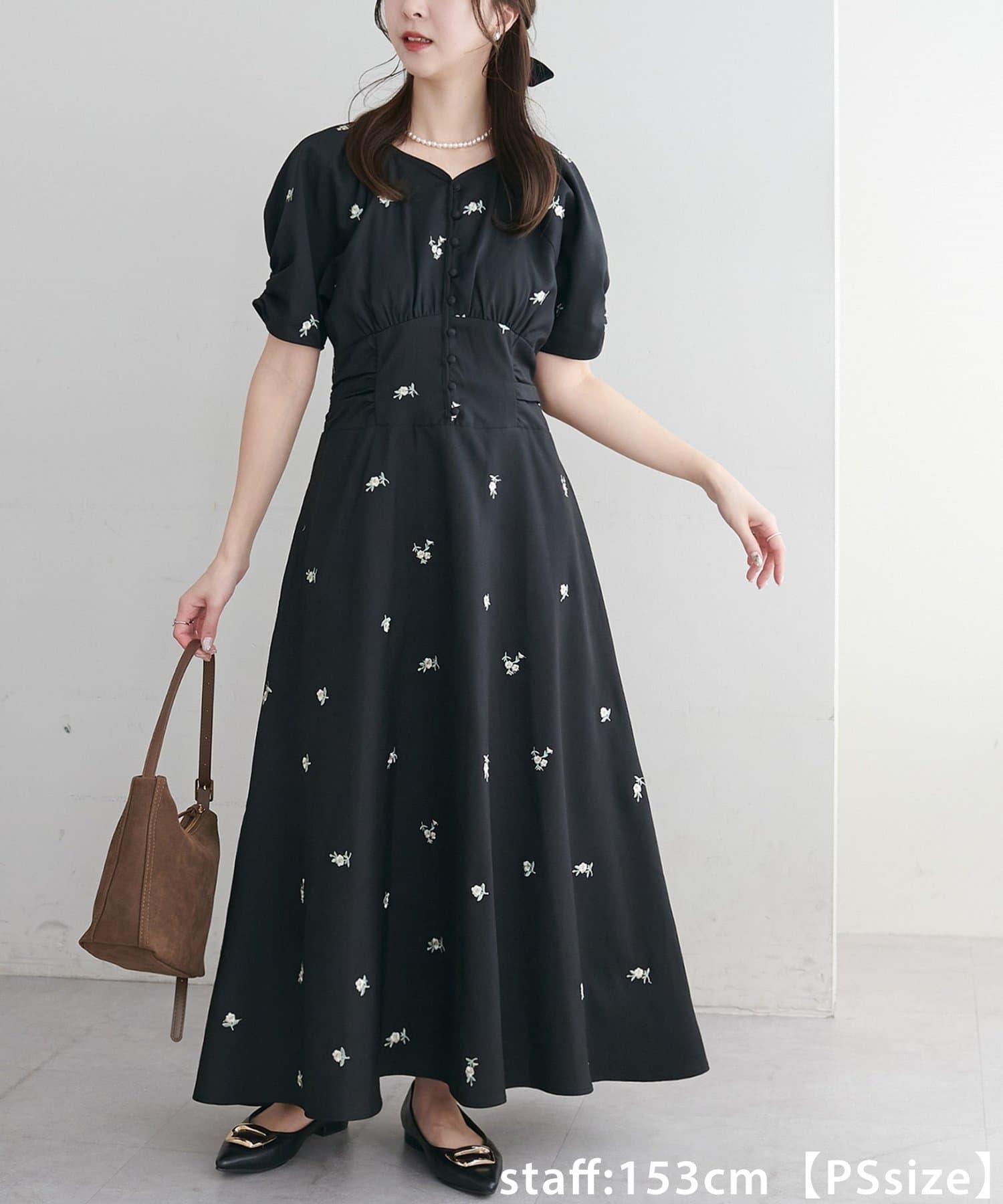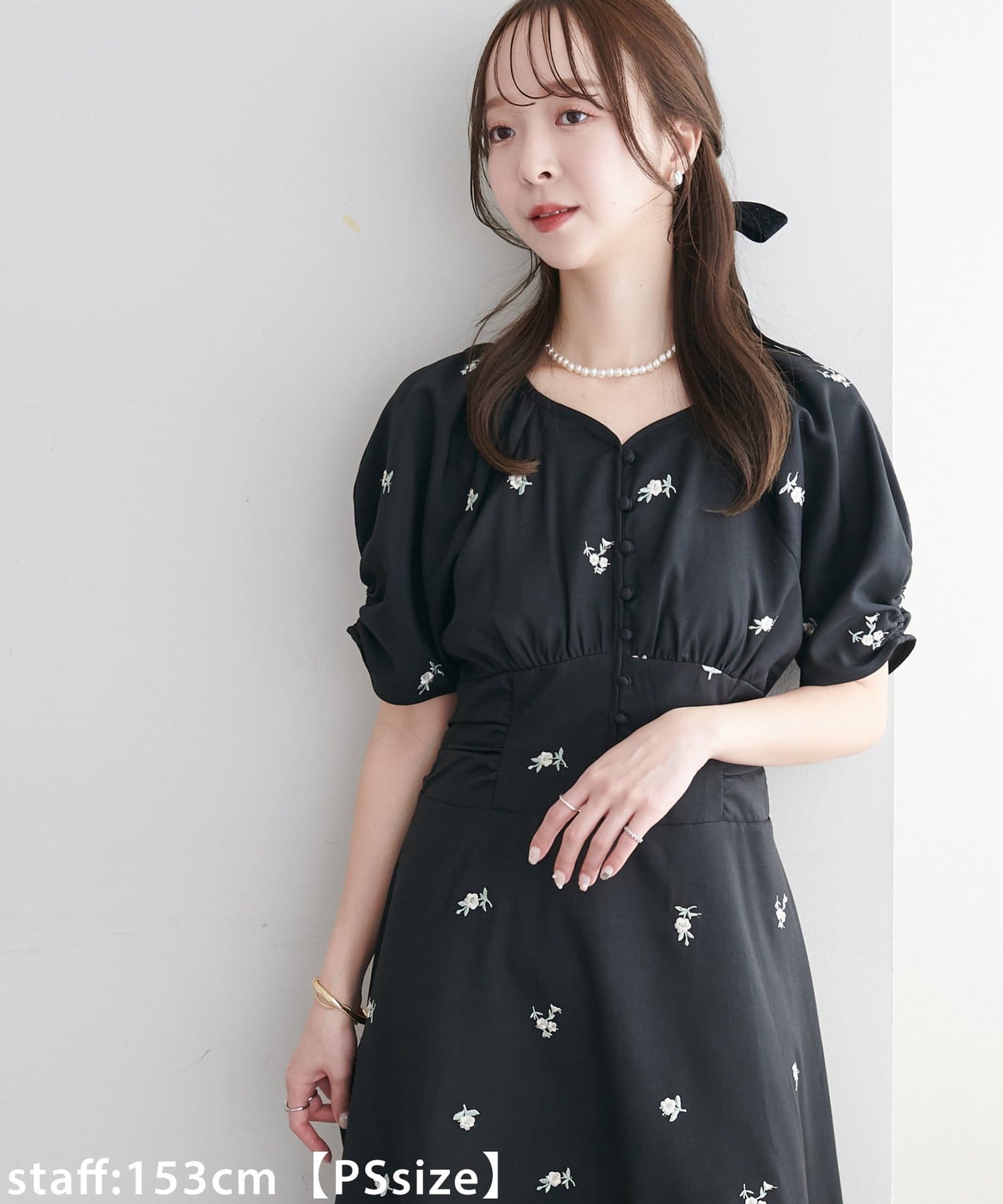 153cmスタッフ(PSサイズ):ウエストラインの切り替えが高めになっていることで、足が長く見えます♪高さのない靴を合わせても、裾が床につかない、足元が綺麗に見える着丈なので、低身長に嬉しいサイズ感!結婚式などオケージョンはもちろんですが、ディナーコーデとしても着用したいです。