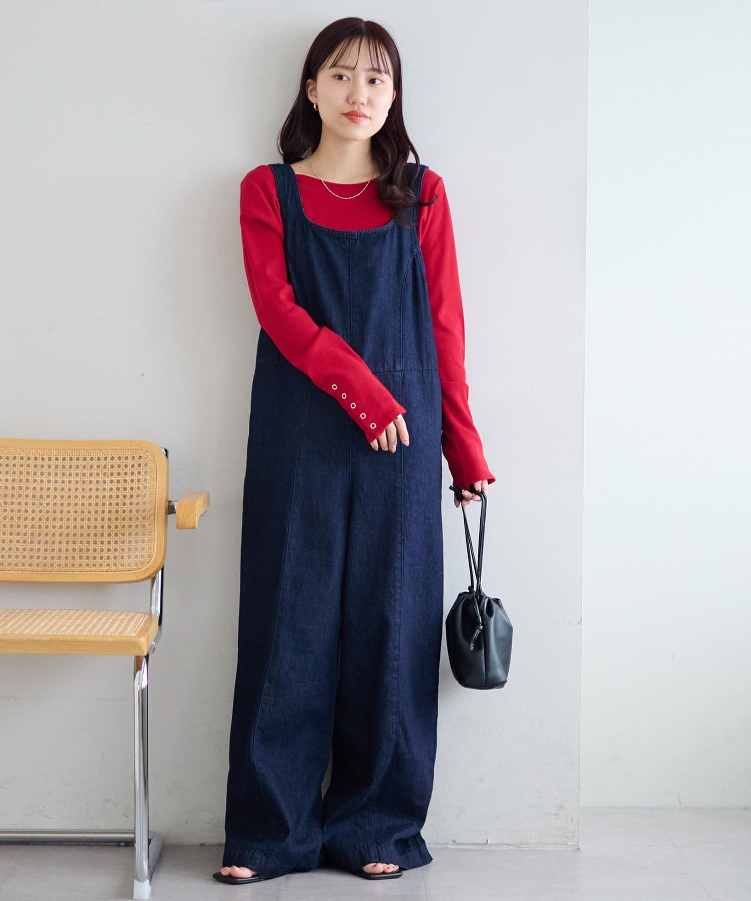 160cmスタッフ:程よいワイドさがポイントのサロペット。高身長でも丈が短くないのが嬉しいです!ワイドシルエットになっていることで、大人な雰囲気で着ることができます。